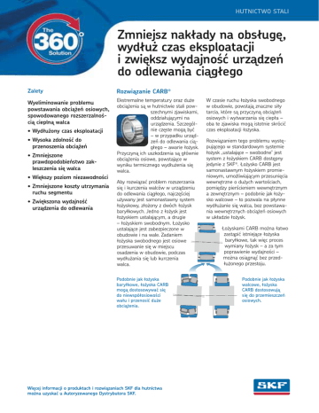 HUTNICTWO STALI Zmniejsz nakłady na obsługę, wydłuż czas eksploatacji i zwiększ wydajność urządzeń do odlewania ciągłego Zalety Rozwiązanie CARB® Wyeliminowanie problemu powstawania obciążeń osiowych, spowodowanego rozszerzalnością cieplną walca Ekstremalne temperatury oraz duże obciążenia są w hutnictwie stali powszechnymi zjawiskami, oddziałującymi na urządzenia. Szczególnie częste mogą być – w przypadku urządzeń do odlewania ciągłego – awarie łożysk. Przyczyną ich uszkodzenia są głównie obciążenia osiowe, powstające w wyniku termicznego wydłużenia się walca. • Wydłużony czas eksploatacji • Wysoka zdolność do przenoszenia obciążeń • Zmniejszone prawdopodobieństwo zakleszczenia się walca • Większy poziom niezawodności • Zmniejszone koszty utrzymania ruchu segmentu • Zwiększona wydajność urządzenia do odlewania Aby rozwiązać problem rozszerzania się i kurczenia walców w urządzeniu do odlewania ciągłego, najczęściej używany jest samonastawny system łożyskowy, złożony z dwóch łożysk baryłkowych. Jedno z łożysk jest łożyskiem ustalającym, a drugie – łożyskiem swobodnym. Łożysko ustalające jest zabezpieczone w obudowie i na wale. Zadaniem łożyska swobodnego jest osiowe przesuwanie się w miejscu osadzenia w obudowie, podczas wydłużania się lub kurczenia walca. Podobnie jak łożyska baryłkowe, łożyska CARB mogą dostosowywać się do niewspółosiowości wału i przenosić duże obciążenia. Więcej informacji o produktach i rozwiązaniach SKF dla hutnictwa można uzyskać u Autoryzowanego Dystrybutora SKF. W czasie ruchu łożyska swobodnego w obudowie, powstają znaczne siły tarcia, które są przyczyną obciążeń osiowych i wytwarzania się ciepła – oba te zjawiska mogą istotnie skrócić czas eksploatacji łożyska. Rozwiązaniem tego problemu występującego w standardowym systemie łożysk „ustalające – swobodne” jest system z łożyskiem CARB dostępny jedynie z SKF®. Łożysko CARB jest samonastawnym łożyskiem promieniowym, umożliwiającym przesunięcia wewnętrzne o dużych wartościach, pomiędzy pierścieniem wewnętrznym a zewnętrznym – podobnie jak łożysko walcowe – to pozwala na płynne wydłużanie się walca, bez powstawania wewnętrznych obciążeń osiowych w układzie łożysk. Łożyskami CARB można łatwo zastąpić istniejące łożyska baryłkowe, tak więc proces wymiany łożysk – a za tym poprawienie wydajności – można osiągnąć bez przedłużonego przestoju. Podobnie jak łożyska walcowe, łożyska CARB dostosowują się do przemieszczeń osiowych. Zwiększ dochód z inwestycji w utrzymanie ruchu z pomocą SKF Program SKF 360 ° Rozwiązań pozwala Ci otrzymać większy zysk z inwestycji w maszyny i wyposażenie. Oznacza to zmniejszenie kosztów utrzymania ruchu lub podwyższenie wydajności, albo jedno i drugie! Poniżej podany jest przykład wykorzystania programu SKF 360° Rozwiązań w hutnictwie stali. żenie czasu eksploatacji samych łożysk, z jednoczesnym zmniejszeniem kosztów. W ciągu następnych dwóch lat Usługi wsparcia technicznego, dostępne wszystkie walce w segmencie zostały wyposażone w ten sam układ łożysk obecnie za pośrednictwem lokalnego i w związku z tym przedsiębiorstwo Autoryzowanego Dystrybutora SKF, zanotowało roczne zmniejszenie kosztu dostarczają proaktywnych rozwiązań, sięgających o wiele dalej niż rozwiąza- zakupu łożysk o około 500 000 €. Należy też dodać do tego oszczędności nie pojedynczego problemu. związane z ograniczeniem nakładów Jeden z producentów stali korzystając na utrzymanie ruchu i odpowiedni z takich usług wsparcia technicznego, dochód ze zwiększonej wydajności. zanotował wysoką poprawę niezawodW ciągu kilku następnych lat, dystrybuności maszyn, wyraźny wzrost wydajtor SKF i jego zespół wsparcia zidentyności i oszczędności kosztów. fikowali kolejne możliwości ulepszeń, O rozwiązanie problemów z walcami szczególnie w najbardziej obciążonych w segmentach w dwóch maszynach do (dolnych) segmentach. Ustalili, że odlewania ciągłego zwrócono się do typowym powodem uszkodzeń jest dystrybutora SKF po raz pierwszy kilka przeciążenie, wywoływane częściowo lat temu. Dystrybutor skontaktował się oddziałującymi na łożyska wewnętrzze swoim zespołem wsparcia SKF, nymi obciążeniami osiowymi. Zespół stworzonym z inżynierów zajmujących wsparcia SKF zalecił zastosowanie się zastosowaniami – wykwalifikowany- rozwiązania z łożyskiem CARB i klient mi specjalistami w przemyśle hutniprzeprowadził dziesięciomiesięczne czym. Przeprojektowali oni układ próby w odniesieniu do jednego segłożysk – z trójpierścieniowych łożysk na mentu. Wyniki tych prób okazały się łożyska baryłkowe SKF, zarówno po doskonałe i od tego czasu zainstalostronie ustalającej, jak i swobodnej. Taka wano około 500 łożysk CARB. W ciągu zmiana konstrukcji umożliwiła poprawę następnych trzech lat od tego pierwwydajności pracy walców oraz wydłuszego testu, żadne z łożysk nie uległo Producent stali oszczędza miliony euro awarii, co uczyniło rozwiązanie z łożyskiem CARB wzorcowym dla walców w innych segmentach. W najnowszym rozwiązaniu, polegającym na zainstalowaniu w walcach górnego segmentu uszczelnionych łożysk produkcji SKF, odnotowano znacznie mniejsze zużycie smaru, ograniczenie ilości zanieczyszczeń w odprowadzanych ściekach oraz zwiększenie czasu eksploatacji całego segmentu. Od czasu pierwszych usprawnień koszt produkcji kęsiska płaskiego stali zmniejszył się o 0,80 € na tonę. Oznacza to oszczędność w skali roku około 1 950 000 €. Istotnym wkładem w zmniejszenie kosztów jest ciągłe wsparcie techniczne ze strony SKF, poprawienie obróbki cieplnej walców oraz wprowadzenie ulepszeń w złączach obrotowych. Dystrybutor SKF oraz zespół wsparcia technicznego SKF 