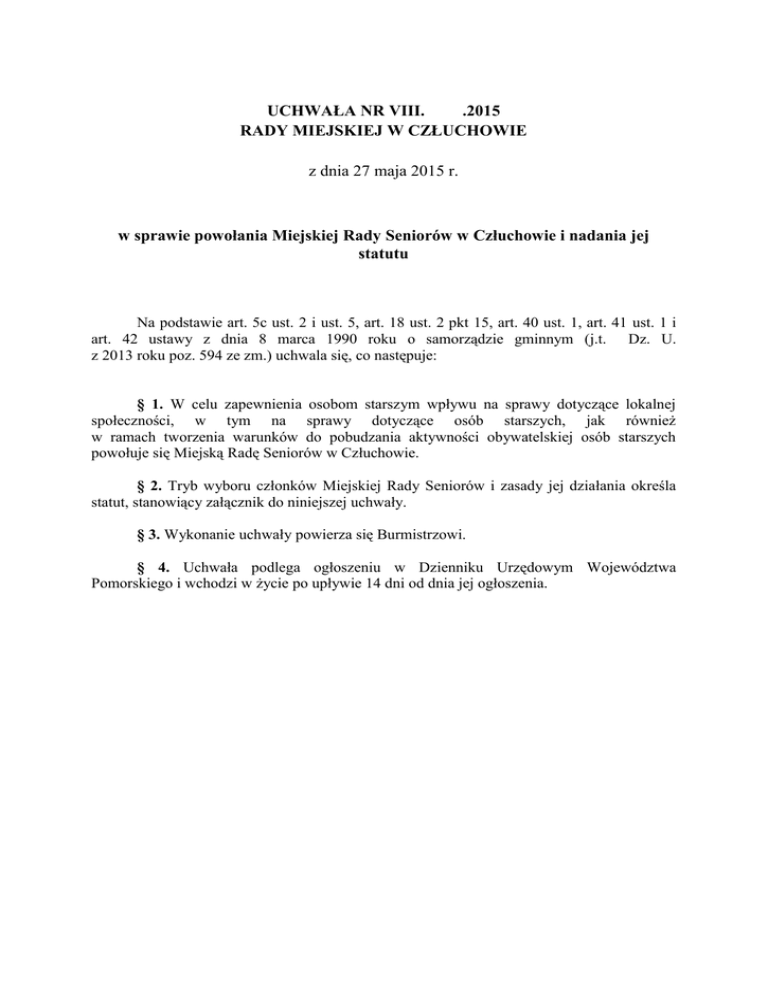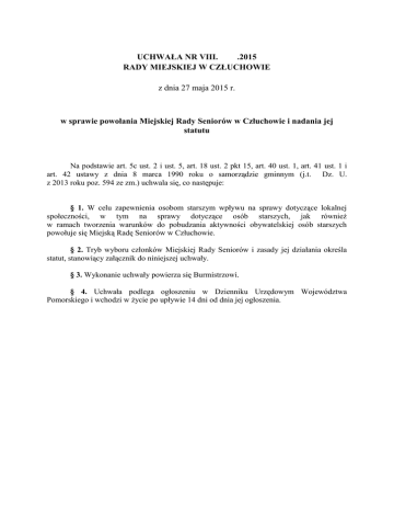 UCHWAŁA NR VIII. .2015 RADY MIEJSKIEJ W CZŁUCHOWIE z dnia 27 maja 2015 r. w sprawie powołania Miejskiej Rady Seniorów w Człuchowie i nadania jej statutu Na podstawie art. 5c ust. 2 i ust. 5, art. 18 ust. 2 pkt 15, art. 40 ust. 1, art. 41 ust. 1 i art. 42 ustawy z dnia 8 marca 1990 roku o samorządzie gminnym (j.t. Dz. U. z 2013 roku poz. 594 ze zm.) uchwala się, co następuje: § 1. W celu zapewnienia osobom starszym wpływu na sprawy dotyczące lokalnej społeczności, w tym na sprawy dotyczące osób starszych, jak również w ramach tworzenia warunków do pobudzania aktywności obywatelskiej osób starszych powołuje się Miejską Radę Seniorów w Człuchowie. § 2. Tryb wyboru członków Miejskiej Rady Seniorów i zasady jej działania określa statut, stanowiący załącznik do niniejszej uchwały. § 3. Wykonanie uchwały powierza się Burmistrzowi. § 4. Uchwała podlega ogłoszeniu w Dzienniku Urzędowym Województwa Pomorskiego i wchodzi w życie po upływie 14 dni od dnia jej ogłoszenia. Załącznik do Uchwały Nr VIII. .2015 Rady Miejskiej w Człuchowie z dnia 27.05.2015 r. Statut Miejskiej Rady Seniorów w Człuchowie Rozdział I Postanowienia ogólne §1 1. W celu integracji środowiska osób starszych oraz wzmacniania udziału osób starszych w życiu społeczności lokalnej powołuje się Miejską Radę Seniorów w Człuchowie. 2. Miejska Rada Seniorów jest organem konsultacyjnym, doradczym i inicjatywnym. 3. Siedzibą Miejskiej Rady Seniorów jest Gmina Miejska Człuchów. 4. Obsługę organizacyjno-techniczną Miejskiej Rady Seniorów zapewnia Centrum Aktywności i Integracji Seniorów Miejskiego Ośrodka Pomocy Społecznej w Człuchowie. 5. Ilekroć w niniejszym Statucie jest mowa o Seniorach – należy przez to rozumieć mieszkańców Gminy Miejskiej Człuchów powyżej 60 roku życia. Rozdział II Zakres zadań Rady §2 Miejska Rada Seniorów działa w następujących obszarach: 1) integracji i wspierania środowiska osób starszych oraz reprezentowania zbiorowych interesów tych osób na zewnątrz; 2) wspierania aktywności osób starszych; 3) profilaktyki i promocji zdrowia osób starszych; 4) zapobiegania i przełamywania marginalizacji osób starszych; 5) zapewnienia osobom starszym dostępu do edukacji, kultury i rekreacji. §3 Do zadań Miejskiej Rady Seniorów należy: 1) współpraca z władzami Gminy Miejskiej Człuchów przy rozstrzyganiu o istotnych oczekiwaniach i potrzebach osób starszych, w tym przedstawianie propozycji zadań o charakterze priorytetowym; 2) podejmowanie działań zmierzających do wykorzystania potencjału i czasu osób starszych na rzecz inicjatyw środowiskowych; 3) propagowanie wśród osób starszych oferty kulturalnej, rekreacyjnej i edukacyjnej, 4) monitorowanie potrzeb osób starszych; 5) zgłaszanie uwag i wniosków do projektów aktów prawa miejscowego; 6) podejmowanie przedsięwzięć zmierzających do integracji społecznej osób starszych, wzmacniania ich aktywności obywatelskiej oraz służących ochronie praw i poszanowaniu godności osób w wieku senioralnym; 7) budowanie pozytywnego wizerunku osób starszych; 8) współpraca z organizacjami społecznymi i instytucjami, działającymi na rzecz osób starszych; 9) promowanie partnerstwa między samorządem lokalnym a organizacjami społecznymi działającymi na rzecz osób starszych; 10) upowszechnianie informacji o działaniach podejmowanych na terenie miasta na rzecz osób starszych; 11) prowadzenie edukacji społecznej o potrzebach, uprawnieniach i możliwościach osób w wieku senioralnym. Rozdział III Skład Miejskiej Rady Seniorów i tryb wyboru jej członków §4 1. Wybory na I kadencję Miejskiej Rady Seniorów przeprowadza się w terminie określonym przez Burmistrza przypadającym najpóźniej w ciągu 30 dni od dnia wejścia w życie uchwały Rady Miejskiej o powołaniu Rady. 2. Wybory na II i kolejne kadencje Miejskiej Rady Seniorów przeprowadza się w terminie określonym przez Burmistrza przypadającym nie później niż 3 miesiące po wyborze Rady Miejskiej nowej kadencji. 3. Informacje o możliwości i trybie zgłaszania kandydatów do Miejskiej Rady Seniorów ogłaszane są na stronnie internetowej oraz tablicy ogłoszeń Urzędu Miejskiego w Człuchowie. §5 1. Skład osobowy Miejskiej Rady Seniorów powoływany jest na okres kadencji Rady Miejskiej w Człuchowie. 2. Skład osobowy Miejskiej Rady Seniorów powołuje się w formie uchwały Rady Miejskiej w Człuchowie. 3. W skład Miejskiej Rady Seniorów mogą być powołane osoby, które ukończyły 60. rok życia, zwane dalej „seniorami”, i są mieszkańcami Gminy Miejskiej Człuchów. 4. W skład Miejskiej Rady Seniorów wchodzi 12 seniorów, wybranych przez: - przedstawicieli organizacji pozarządowych, które działają na rzecz środowiska osób starszych; - przedstawicieli Klubów Seniora; - dwóch przedstawicieli Burmistrza Miasta Człuchowa. 5. Seniorzy będący przedstawicielami organizacji pozarządowych i Klubów Seniora wybierani są na spotkaniu Burmistrza Miasta Człuchowa z organizacjami pozarządowymi i Klubami Seniora, według trybu wcześniejszego zgłoszenia określonego w ustępach 8-10. 6. Burmistrz Miasta Człuchowa ogłasza informację o możliwości uczestniczenia oraz terminie spotkania podmiotów, o których mowa w ust. 4 i 5: 1) na stronie internetowej Urzędu Miejskiego w Człuchowie, 2) tablicy ogłoszeń Urzędu Miejskiego w Człuchowie. 7. Warunkiem uczestnictwa jest dokonanie przez organizacje pozarządowe i Kluby Seniora rejestracji w terminie wskazanym w ogłoszeniu. 8. Podmioty wskazujące kandydatów na członków Miejskiej Rady Seniorów dokonują ich zgłoszenia (rejestracji) poprzez dostarczenie Burmistrzowi w terminie 14 dni od ogłoszenia, o którym mowa w ust. 6 karty zgłoszeniowej będącej załącznikiem do tego ogłoszenia. 9. Karta zgłoszeniowa powinna zawierać: 1) nazwę i siedzibę podmiotu zgłaszającego kandydata; 2) numer telefonu 