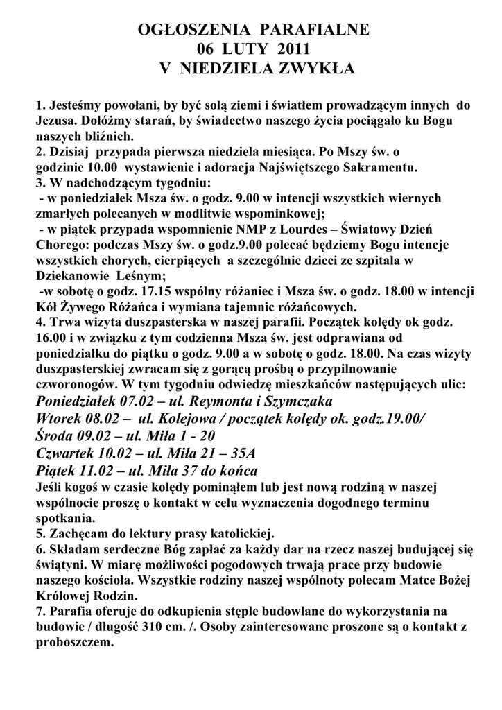 OGŁOSZENIA PARAFIALNE 06 LUTY 2011 V NIEDZIELA ZWYKŁA 1. Jesteśmy powołani, by być solą ziemi i światłem prowadzącym innych do Jezusa. Dołóżmy starań, by świadectwo naszego życia pociągało ku Bogu naszych bliźnich. 2. Dzisiaj przypada pierwsza niedziela miesiąca. Po Mszy św. o godzinie 10.00 wystawienie i adoracja Najświętszego Sakramentu. 3. W nadchodzącym tygodniu: - w poniedziałek Msza św. o godz. 9.00 w intencji wszystkich wiernych zmarłych polecanych w modlitwie wspominkowej; - w piątek przypada wspomnienie NMP z Lourdes – Światowy Dzień Chorego: podczas Mszy św. o godz.9.00 polecać będziemy Bogu intencje wszystkich chorych, cierpiących a szczególnie dzieci ze szpitala w Dziekanowie Leśnym; -w sobotę o godz. 17.15 wspólny różaniec i Msza św. o godz. 18.00 w intencji Kół Żywego Różańca i wymiana tajemnic różańcowych. 4. Trwa wizyta duszpasterska w naszej parafii. Początek kolędy ok godz. 16.00 i w związku z tym codzienna Msza św. jest odprawiana od poniedziałku do piątku o godz. 9.00 a w sobotę o godz. 18.00. Na czas wizyty duszpasterskiej zwracam się z gorącą prośbą o przypilnowanie czworonogów. W tym tygodniu odwiedzę mieszkańców następujących ulic: Poniedziałek 07.02 – ul. Reymonta i Szymczaka Wtorek 08.02 – ul. Kolejowa / początek kolędy ok. godz.19.00/ Środa 09.02 – ul. Miła 1 - 20 Czwartek 10.02 – ul. Miła 21 – 35A Piątek 11.02 – ul. Miła 37 do końca Jeśli kogoś w czasie kolędy pominąłem lub jest nową rodziną w naszej wspólnocie proszę o kontakt w celu wyznaczenia dogodnego terminu spotkania. 5. Zachęcam do lektury prasy katolickiej. 6. Składam serdeczne Bóg zapłać za każdy dar na rzecz naszej budującej się świątyni. W miarę możliwości pogodowych trwają prace przy budowie naszego kościoła. Wszystkie rodziny naszej wspólnoty polecam Matce Bożej Królowej Rodzin. 7. Parafia oferuje do odkupienia stęple budowlane do wykorzystania na budowie / długość 310 cm. /. Osoby zainteresowane proszone są o kontakt z proboszczem.