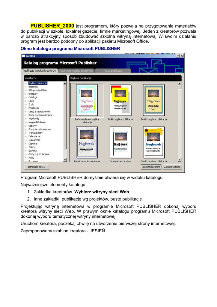PUBLISHER_2000 jest programem, który pozwala na przygotowanie materiałów do publikacji w szkole, lokalnej gazecie, firmie marketingowej. Jeden z kreatorów pozwala w bardzo atrakcyjny sposób zbudować szkolna witryną internetową. W swoim działaniu program jest bardzo podobny do aplikacji pakietu Microsoft Office. Okno katalogu programu Microsoft PUBLISHER Program Microsoft PUBLISHER domyślnie otwiera się w widoku katalogu NajwaŜniejsze elementy katalogu 1. Zakładka kreatorów. Wybierz witryny sieci Web 2. Inne zakładki, publikacje wg projektów, puste publikacje Projektując witrynę internetowa w programie Microsoft PUBLISHER dokonaj wyboru kreatora witryny sieci Web. W prawym oknie katalogu programu Microsoft PUBLISHER dokonaj wyboru tematycznej witryny internetowej. Uruchom kreatora, poczekaj chwilę na utworzenie pierwszej strony internetowej. Zaproponowany szablon kreatora - JESIEŃ Rozpocznij dalsza pracę od poznania pomocy kontekstowej zapisanej w lewym oknie kreatora witryn sieci Web. W następnym oknie dialogowym dokonaj wyboru schematu kolorów. Obserwuj efekty własnych wyborów w prawym oknie. Eksperymentuj! W opisanym przykładzie wybrano schemat „Borówka” Następne okno dialogowe pozwoli dokonać wyboru dodatkowych stron internetowych. Wszystkie następne strony automatycznie będą miały hiperłącza. W opisanym przykładzie wybrano podstronę, która będzie zawierać kalendarz Dalej postępuj w swoim działaniu według uznania. Po wykonaniu zaprezentowanych kroków, zakończ prace kreatora i zapisz swój projekt witryny internetowej w wybranym folderze. W opisanym przykładzie projekt ma nazwę JESIEN 2007 Tak przygotowany projekt moŜna dalej modyfikować wykorzystując narzędzia programu zgromadzone po lewej stronie okna. Modyfikacja dowolnego elementu i zastosowaniu narzędzi edycyjnych. na stronie polega na zaznaczeniu obiektu Uwagi: Tak przygotowany projekt witryny internetowej moŜna ocenić wykorzystując podgląd strony sieci Web (Plik/podgląd strony sieci Web) KaŜdorazowa modyfikacja projektu strony sieci Web pozwoli ostateczny zmienić wygląd witryny internetowej wyświetlanej w przeglądarce EXPLORER