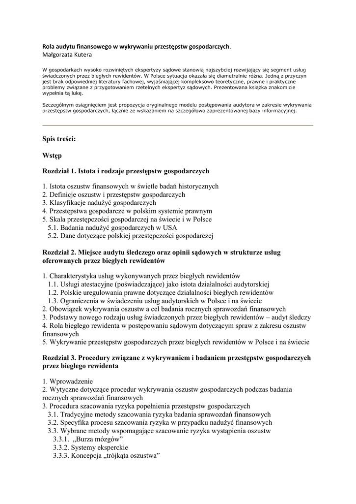 Rola audytu finansowego w wykrywaniu przestępstw gospodarczych. Małgorzata Kutera W gospodarkach wysoko rozwiniętych ekspertyzy sądowe stanowią najszybciej rozwijający się segment usług świadczonych przez biegłych rewidentów. W Polsce sytuacja okazała się diametralnie różna. Jedną z przyczyn jest brak odpowiedniej literatury fachowej, wyjaśniającej kompleksowo teoretyczne, prawne i praktyczne problemy związane z przygotowaniem rzetelnych ekspertyz sądowych. Prezentowana książka znakomicie wypełnia tą lukę. Szczególnym osiągnięciem jest propozycja oryginalnego modelu postępowania audytora w zakresie wykrywania przestępstw gospodarczych, łącznie ze wskazaniem na szczegółowo zaprezentowanej bazy informacyjnej. Spis treści: Wstęp Rozdział 1. Istota i rodzaje przestępstw gospodarczych 1. Istota oszustw finansowych w świetle badań historycznych 2. Definicje oszustw i przestępstw gospodarczych 3. Klasyfikacje nadużyć gospodarczych 4. Przestępstwa gospodarcze w polskim systemie prawnym 5. Skala przestępczości gospodarczej na świecie i w Polsce 5.1. Badania nadużyć gospodarczych w USA 5.2. Dane dotyczące polskiej przestępczości gospodarczej Rozdział 2. Miejsce audytu śledczego oraz opinii sądowych w strukturze usług oferowanych przez biegłych rewidentów 1. Charakterystyka usług wykonywanych przez biegłych rewidentów 1.1. Usługi atestacyjne (poświadczające) jako istota działalności audytorskiej 1.2. Polskie uregulowania prawne dotyczące działalności biegłych rewidentów 1.3. Ograniczenia w świadczeniu usług audytorskich w Polsce i na świecie 2. Obowiązek wykrywania oszustw a cel badania rocznych sprawozdań finansowych 3. Podstawy nowego rodzaju usług świadczonych przez biegłych rewidentów – audyt śledczy 4. Rola biegłego rewidenta w postępowaniu sądowym dotyczącym spraw z zakresu oszustw finansowych 5. Wykrywanie przestępstw gospodarczych przez biegłych rewidentów w Polsce i na świecie Rozdział 3. Procedury związane z wykrywaniem i badaniem przestępstw gospodarczych przez biegłego rewidenta 1. Wprowadzenie 2. Wytyczne dotyczące procedur wykrywania oszustw gospodarczych podczas badania rocznych sprawozdań finansowych 3. Procedura szacowania ryzyka popełnienia przestępstw gospodarczych 3.1. Tradycyjne metody szacowania ryzyka badania sprawozdań finansowych 3.2. Specyfika procesu szacowania ryzyka w przypadku nadużyć finansowych 3.3. Wybrane metody wspomagające szacowanie ryzyka wystąpienia oszustw 3.3.1. „Burza mózgów” 3.3.2. Systemy eksperckie 3.3.3. Koncepcja „trójkąta oszustwa” 3.3.4. Przegląd analityczny 4. Rola kontroli wewnętrznej w ocenie możliwości popełnienia nadużyć 5. Wymogi dotyczące dokumentowania nadużyć gospodarczych przez audytorów 6. Postępowanie biegłego rewidenta w razie uzasadnionego podejrzenia popełnienia przestępstwa gospodarczego stwierdzonego podczas audytu rocznego sprawozdania finansowego Rozdział 4. Przykłady oszustw finansowych występujące w polskiej praktyce gospodarczej 1. Wprowadzenie 2. Studia przypadków defraudacji składników majątkowych 2.1. „Wyprowadzanie” środków pieniężnych poprzez sieć spółek powiązanych 2.2. Ukrywanie wypłat z rachunku bankowego spółki 2.3. Pożyczki udzielane osobom fizycznym ze środków obrotowych spółki 2.4. Finansowanie prywatnych wakacji ze środków spółki 2.5. Manipulowanie wypłatami środków pieniężnych z rachunku bankowego spółki 2.6. Utrzymywanie fikcyjnej spółki zależnej poza granicami kraju 2.7. Nieprawidłowości w przyjmowaniu zapasów towarów do magazynu 2.8. Świadczenie usług niematerialnych przez spółki powiązane 2.9. Nadużycia związane z rozliczaniem zaliczek wypłacanych ze środków spółki 2.10. Nieewidencjonowana sprzedaż usług po godzinach pracy 3. Manipulacje z zakresu fałszowania sprawozdań finansowych 3.1. Przykłady oszustw księgowych stosowane w jednostkowych sprawozdaniach finansowych przedsiębiorstw 3.1.1. Oszustwa księgowe związane z wyceną udziałów i akcji posiadanych w innych spółkach prawa handlowego 3.1.2. Nadużycia związane z wyceną bilansową akcji notowanych na giełdzie 3.1.3. Manipulacje księgowe w zakresie wyceny bilansowej należności 3.1.4. Wpływanie na poziom wyniku finansowego poprzez manipulacje wysokością podatku odroczonego 3.1.5. Weksle jako narzędzie zwiększania płynności finansowej spółki 3.1.6. Oszukańcza prezentacja należnych i niewniesionych przez właścicieli wkładów na poczet kapitału zakładowego 3.1.7. Problemy z wiarygodną wyceną aportów wnoszonych na pokrycie kapitału zakładowego 3.1.8. Manipulacje w ewidencji księgowej spółki przekazującej aport na pokrycie kapitału podstawowego jednostki zależnej 3.1.9. Wykorzystywanie możliwości konwersji wierzytelności na kapitał zakładowy spółki w celu poprawy sytuacji majątkowo-finansowej prezentowanej w sprawozdaniu 3.1.10. Oszustwa związane z celowym zwiększaniem przychodów między jednostkami powiązanymi 3.1.11. Mechanizm „nadmuchiwania” sumy bilansowej i transferu zysków na przykładzie obrotu aktywami finansowymi 3.1.12. Nieprawidłowe stosowanie zasad kompensaty wzajemnych rozrachunków 3.2. Manipulacje księgowe stosowane podczas konsolidacji sprawozdań finansowych 3.2.1. Celowe zniekształcanie struktury grupy kapitałowej 3.2.2. Odmienne zasady wyceny oraz prezentacji aktywów i pasywów 3.2.3. Świadome stosowanie innej metody konsolidacji 3.2.4. Unikanie pełnych wyłączeń transakcji dokonywanych między jednostkami powiązanymi 3.2.5. Celowe dokonywanie korekt konsolidacyjnych podwyższających wynik finansowy grupy 4. Podsumowanie Rozdział 5. Model postępowania audytora w zakresie wykrywania przestępstw gospodarczych 1. Syntetyczny model postępowania audytora w zakresie wykrywania i ujawniania przestępstwa gospodarczego 1.1. Podstawowe założenia i ograniczenia proponowanego modelu 1.2. Mode