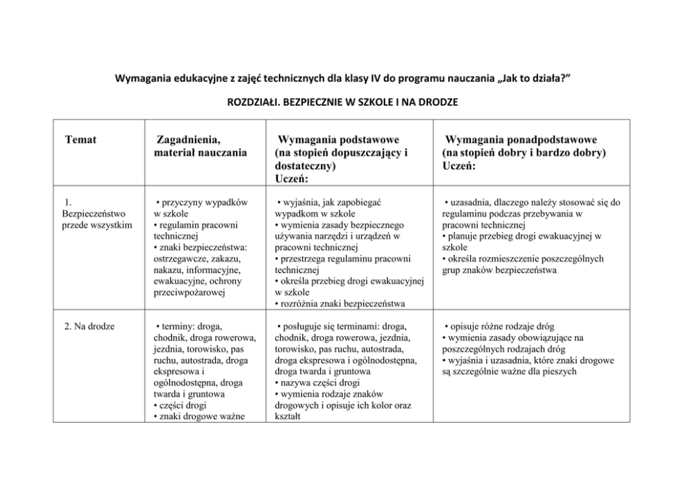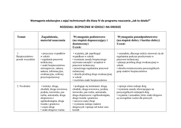 Wymagania edukacyjne z zajęć technicznych dla klasy IV do programu nauczania „Jak to działa?” ROZDZIAŁI. BEZPIECZNIE W SZKOLE I NA DRODZE Temat Zagadnienia, materiał nauczania Wymagania podstawowe (na stopień dopuszczający i dostateczny) Uczeń: Wymagania ponadpodstawowe (na stopień dobry i bardzo dobry) Uczeń: 1. Bezpieczeństwo przede wszystkim • przyczyny wypadków w szkole • regulamin pracowni technicznej • znaki bezpieczeństwa: ostrzegawcze, zakazu, nakazu, informacyjne, ewakuacyjne, ochrony przeciwpoŜarowej • wyjaśnia, jak zapobiegać wypadkom w szkole • wymienia zasady bezpiecznego uŜywania narzędzi i urządzeń w pracowni technicznej • przestrzega regulaminu pracowni technicznej • określa przebieg drogi ewakuacyjnej w szkole • rozróŜnia znaki bezpieczeństwa • uzasadnia, dlaczego naleŜy stosować się do regulaminu podczas przebywania w pracowni technicznej • planuje przebieg drogi ewakuacyjnej w szkole • określa rozmieszczenie poszczególnych grup znaków bezpieczeństwa 2. Na drodze • terminy: droga, chodnik, droga rowerowa, jezdnia, torowisko, pas ruchu, autostrada, droga ekspresowa i ogólnodostępna, droga twarda i gruntowa • części drogi • znaki drogowe waŜne • posługuje się terminami: droga, chodnik, droga rowerowa, jezdnia, torowisko, pas ruchu, autostrada, droga ekspresowa i ogólnodostępna, droga twarda i gruntowa • nazywa części drogi • wymienia rodzaje znaków drogowych i opisuje ich kolor oraz kształt • opisuje róŜne rodzaje dróg • wymienia zasady obowiązujące na poszczególnych rodzajach dróg • wyjaśnia i uzasadnia, które znaki drogowe są szczególnie waŜne dla pieszych 3. To takie proste! – Pan Stop dla pieszych • stosuje się do informacji przekazywanych przez znaki drogowe • planowanie etapów pracy • narzędzia do obróbki papieru • zastosowanie papieru • właściwie organizuje miejsce pracy • wymienia kolejność działań (operacji technologicznych) • posługuje się narzędziami do obróbki papieru zgodnie z ich przeznaczeniem • wykonuje pracę według przyjętych załoŜeń 4. Piechotą po mieście • terminy: przejście dla pieszych, sygnalizator • zasady przechodzenia przez jezdnię na przejściach dla pieszych 5. Pieszy poza miastem • terminy: obszar zabudowany i • dba o porządek i bezpieczeństwo w miejscu pracy • szacuje czas kolejnych działań (operacji technologicznych) • posługuje się terminami: przejście dla pieszych, sygnalizator • opisuje sposób przechodzenia przez jezdnię na przejściach dla pieszych z sygnalizacją świetlną i bez niej • przedstawia zasadę działania sygnalizatorów na przejściach dla pieszych • wskazuje sytuacje zagraŜające bezpieczeństwu pieszego na przejściu dla pieszych • posługuje się terminami: obszar zabudowany i niezabudowany • wykonuje pracę w sposób twórczy • formułuje ocenę gotowej pracy • formułuje reguły bezpiecznego przechodzenia przez jezdnię • ocenia bezpieczeństwo pieszego w róŜnych sytuacjach • wskazuje róŜnice między drogą w obszarze zabudowanym i niezabudowanym niezabudowany • zasady poruszania się po drodze bez chodnika • znaczenie elementów odblaskowych 6. W podróŜy 7. To takie proste! – Pamiątkowy album • terminy: środki komunikacji publicznej, piktogram, rozkład jazdy • zasady korzystania ze środków komunikacji publicznej • piktogramy na dworach i lotniskach • informacje zawarte w rozkładzie jazdy • planowanie etapów pracy • narzędzia do obróbki papieru • zastosowanie papieru • określa sposób poruszania się po drogach w obszarze niezabudowanym • uzasadnia konieczność noszenia odblasków • wskazuje, na jakich częściach ubrania pieszego naleŜy umieścić odblaski, aby był on widoczny po zmroku na drodze • projektuje element odblaskowy przypinany do plecaka • posługuje się terminami: środki komunikacji publicznej, piktogram, rozkład jazdy • podaje przykłady właściwego zachowania w środkach komunikacji miejskiej • wyjaśnia znaczenie piktogramów • czyta ze zrozumieniem rozkład jazdy • wybiera na podstawie rozkładu jazdy najdogodniejsze połączenie miedzy miejscowościami • planuje cel wycieczki i dobiera odpowiedni środek transportu, korzystając z rozkładu jazdy • projektuje własny piktogram na podstawie gotowych wzorów • właściwie organizuje miejsce pracy • wymienia kolejność działań (operacji technologicznych) • prawidłowo posługuje się narzędziami do obróbki papieru • wykonuje pracę zgodnie z załoŜeniami • dba o porządek i bezpieczeństwo w • ocenia, z jakimi zagroŜeniami na drodze mogą się zetknąć piesi w obszarze niezabudowanym • analizuje, jak noszenie odblasków wpływa na widoczność pieszych na drodze • wykazuje się kreatywnością, projektując element odblaskowy • formułuje zasady właściwego zachowania się w środkach komunikacji miejskiej • wyjaśnia, dlaczego piktogramy są uniwersalne • odnajduje w rozkładzie jazdy dogodne połączenie z przesiadką • wyznacza trasę wycieczki i prowadzi ją przez dwie lub więcej miejscowości • wybiera dogodne połączenie środkami komunikacji publicznej • projektuje piktogram, wykazując się pomysłowością • posługuje się narzędziami z zachowaniem zasad bezpieczeństwa • wykonuje pracę w sposób twórczy • formułuje ocenę gotowej pracy 8. Piesza wycieczka 9. Wypadki na drogach 10. To umiem! – Podsumowanie rozdziału I • zasady planowania wycieczki • znaki obowiązujące na terenie kąpieliska • wskazówki dotyczące pakowania plecaka • przyczyny wypadków powodowanych przez pieszych • zasady przechodzenia przez torowisko kolejowe z zaporami i bez zapór, a takŜe przez tory tramwajowe z sygnalizacją świetlną i bez niej • numery telefonów alarmowych • sposoby powiadomienia słuŜb ratowniczych o wypadku • zasady udzielania pomocy of