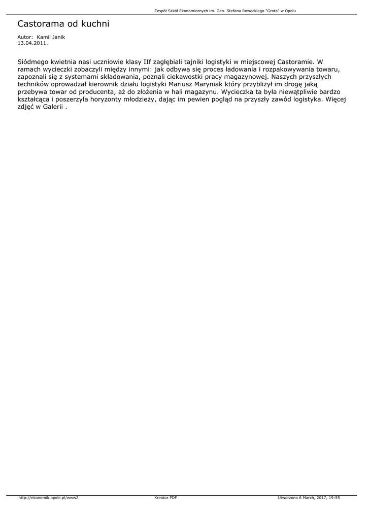 Zespół Szkół Ekonomicznych im. Gen. Stefana Roweckiego "Grota" w Opolu Castorama od kuchni Autor: Kamil Janik 13.04.2011. Siódmego kwietnia nasi uczniowie klasy IIf zagłębiali tajniki logistyki w miejscowej Castoramie. W ramach wycieczki zobaczyli między innymi: jak odbywa się proces ładowania i rozpakowywania towaru, zapoznali się z systemami składowania, poznali ciekawostki pracy magazynowej. Naszych przyszłych techników oprowadzał kierownik działu logistyki Mariusz Maryniak który przybliżył im drogę jaką przebywa towar od producenta, aż do złożenia w hali magazynu. Wycieczka ta była niewątpliwie bardzo kształcąca i poszerzyła horyzonty młodzieży, dając im pewien pogląd na przyszły zawód logistyka. Więcej zdjęć w Galerii . http://ekonomik.opole.pl/www2 Kreator PDF Utworzono 6 March, 2017, 19:55