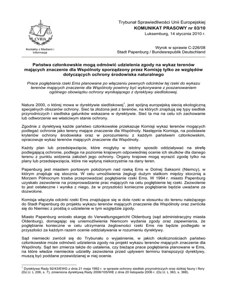 Trybunał Sprawiedliwości Unii Europejskiej KOMUNIKAT PRASOWY nr 03/10 Luksemburg, 14 stycznia 2010 r. Kontakty z Mediami i Informacja Wyrok w sprawie C-226/08 Stadt Papenburg / Bundesrepublik Deutschland Państwa członkowskie mogą odmówić udzielenia zgody na wykaz terenów mających znaczenie dla Wspólnoty sporządzony przez Komisję tylko ze względów dotyczących ochrony środowiska naturalnego Prace pogłębiania rzeki Ems planowane po włączeniu pewnych odcinków tej rzeki do wykazu terenów mających znaczenie dla Wspólnoty powinny być wykonywane z poszanowaniem ogólnego obowiązku ochrony wynikającego z dyrektywy siedliskowej. Natura 2000, o której mowa w dyrektywie siedliskowej1, jest spójną europejską siecią ekologiczną specjalnych obszarów ochrony. Sieć ta złożona jest z terenów, na których znajdują się typy siedlisk przyrodniczych i siedliska gatunków wskazane w dyrektywie. Sieć ta ma na celu ich zachowanie lub odtworzenie we właściwym stanie ochrony. Zgodnie z dyrektywą każde państwo członkowskie przekazuje Komisji wykaz terenów mogących podlegać ochronie jako tereny mające znaczenie dla Wspólnoty. Następnie Komisja, na podstawie kryteriów ochrony środowiska oraz w porozumieniu z każdym państwem członkowskim, opracowuje wykaz terenów mających znaczenie dla Wspólnoty. Każdy plan lub przedsięwzięcie, które mogłyby w istotny sposób oddziaływać na strefę podlegającą ochronie, podlega na poziomie krajowym odpowiedniej ocenie ich skutków dla danego terenu z punktu widzenia założeń jego ochrony. Organy krajowe mogą wyrazić zgodę tylko na plany lub przedsięwzięcia, które nie wpłyną niekorzystnie na dany teren. Papenburg jest miastem portowym położonym nad rzeką Ems w Dolnej Saksonii (Niemcy), w którym znajduje się stocznia. W celu umożliwienia żeglugi dużym statkom między stocznią a Morzem Północnym trzeba przeprowadzać pogłębianie rzeki Ems. W 1994 r. miasto Papenburg uzyskało zezwolenie na przeprowadzanie prac mających na celu pogłębienie tej rzeki. Zezwolenie to jest ostateczne i wynika z niego, że w przyszłości konieczne pogłębianie będzie uważane za dozwolone. Komisja włączyła odcinki rzeki Ems znajdujące się w dole rzeki w stosunku do terenu należącego do Stadt Papenburg do projektu wykazu terenów mających znaczenie dla Wspólnoty oraz zwróciła się do Niemiec z prośbą o udzielenie w tym względzie zgody. Miasto Papenburg wniosło skargę do Verwaltungsgericht Oldenburg (sąd administracyjny miasta Oldenburg), domagając się uniemożliwienia Niemcom wydania zgody oraz zapewnienia, że pogłębianie konieczne w celu utrzymania żeglowności rzeki Ems nie będzie podlegało w przyszłości za każdym razem ocenie oddziaływania w rozumieniu dyrektywy. Sąd niemiecki zwrócił się do Trybunału o wyjaśnienie, w jakich okolicznościach państwo członkowskie może odmówić udzielenia zgody na projekt wykazu terenów mających znaczenie dla Wspólnoty. Sąd ten zmierza także do ustalenia, czy bieżące prace pogłębiania planowane w Ems, na które władze niemieckie udzieliły zezwolenia przed upływem terminu transpozycji dyrektywy, muszą być poddane przewidzianej w niej ocenie. 1 Dyrektywa Rady 92/43/EWG z dnia 21 maja 1992 r. w sprawie ochrony siedlisk przyrodniczych oraz dzikiej fauny i flory (Dz.U. L 206, s. 7), zmieniona dyrektywą Rady 2006/105/WE z dnia 20 listopada 2006 r. (Dz.U. L 363, s. 368). Trybunał stwierdził po pierwsze, że kryteria oceny znaczenia danego terenu dla Wspólnoty zostały określone w odniesieniu do celu, jakim jest ochrona siedlisk przyrodniczych lub dzikiej fauny i flory, wymienionych w dyrektywie, jak również celu spójności Natury 2000. Cele te dotyczą zatem ochrony środowiska naturalnego. W konsekwencji państwa członkowskie mogą odmówić udzielenia zgody na włączenie terenu do wykazu terenów mających znaczenie dla Wspólnoty sporządzonego przez Komisję tylko ze względów dotyczących ochrony środowiska naturalnego. Kryteria gospodarcze, społeczne i kulturowe oraz cechy regionalne i lokalne nie mogą stanowić podstaw do udzielenia takiej odmowy. Następnie Trybunał wskazał, że okoliczność, iż na prace pogłębiania rzeki Ems udzielono zezwolenia zgodnie z prawem niemieckim przed upływem terminu transpozycji dyrektywy, nie stanowi jako taka przeszkody, aby prace te traktować w przypadku każdej interwencji w kanale żeglugowym jako odrębne przedsięwzięcia. W tym przypadku każde z tych przedsięwzięć, o ile może oddziaływać na dany teren w znaczący sposób, powinno zostać poddane ocenie oddziaływania zgodnie z dyrektywą. Jednakże, jeżeli ze względu w szczególności na powtarzalność, charakter i wymogi wykonywania danych prac mogą one być traktowane jako jedna operacja, gdy mają przede wszystkim na celu utrzymanie określonej głębokości kanału żeglugowego przy pomocy regularnych i koniecznych do tego celu prac pogłębiania, prace te mogą być uznane za jedno i to samo przedsięwzięcie w rozumieniu dyrektywy. W tym przypadku takie przedsięwzięcie, na które wydano zgodę przed dniem, w którym upływał termin do transpozycji dyrektywy, nie byłoby objęte uprzednią oceną oddziaływania przedsięwzięcia na dany teren. Niemniej jednak, jeżeli dany teren zostanie umieszczony w wykazie terenów mających znaczenie dla Wspólnoty sporządzony przez Komisję, wykonanie każdej operacji w ramach prac będzie podlegało ogólnemu obowiązkowi ochrony wynikającemu z dyrektywy, polegającemu na unikaniu pogorszenia stanu siedlisk przyrodniczych i siedlisk gatunków, jak również unikania istotnego niepokojenia gatunków, dla których zostały wyznaczone takie obszary. Wreszcie Trybunał uściślił, iż z chwilą gdy teren jest już umieszczony w wykazie krajowym przekazanym Komisji w celu włączenia go do wykazu terenów mających znaczenie dla Wspólnoty, nie powinien podlega