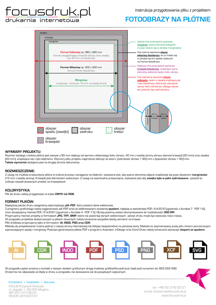 focusdruk.pl instrukcja przygotowania pliku z projektem FOTOOBRAZY NA PŁÓTNIE drukarnia internetowa zawijka krawędź margines zielona linia przerywana wyznacza margines: ważne elementy fotografii muszą mieścić się w obrębie marginesów Format Całkowity np. 380 x 380 mm format uwzględniający krawędź obrazu oraz zawijkę (po 40 mm na każdy bok) linia czarna wyznacza obszar właściwy fotoobrazu: to co mieści się w obrębie tej linii, będzie widoczne na froncie fotoobrazu fioletowa linia przerywana wyznacza krawędź fotoobrazu: znajdujące się tu elementy widoczne będą z boku obrazu Format Właściwy np. 300 x 300 mm format frontu fotoobrazu linia czerwona wyznacza obszar całkowity, razem z zawijką znajdującą się z tyłu fotoobrazu: tolerancja zawinięcia wynosi kilka milimetrów, dlatego obszar ten powinien być zadrukowany margines 10 mm Marginesy marginesy - minimum 10 mm na każdą stronę obszar spadu (zawijki) obszar zadruku 20 mm 20 mm krawędź zawijka obszar treści obszar krawędzi WYMIARY PROJEKTU: Rozmiar każdego z boków płótna jest zawsze o 80 mm większy od wymiaru właściwego boku obrazu. 40 mm z każdej strony obrazu stanowi krawędź (20 mm) oraz zawijka (20 mm), znajdująca się z tyłu blejtramu. Wymiary pliku projektu najprościej obliczyć ze wzoru: (szerokość obrazu + 80) mm x (wysokość obrazu + 80) mm. Tabela wymiarów dostępna jest na drugiej stronie dokumentu. ROZMIESZCZENIE: Z uwagi na możliwe przesunięcia płótna w trakcie procesu naciągania na blejtram, wskazane jest, aby ważne elementy zdjęcia znajdowały się poza obszarem marginesów (10 mm z każdej strony). Krawędź jest elementem widocznym. Z uwagi na ewentualne przesunięcia, wskazane jest aby zawijka była w pełni zadrukowana - pozwoli to uniknąć niezadrukowanych przebić na krawędziach. KOLORYSTYKA: Plik do druku należy przygotować w trybie CMYK lub RGB. FORMAT PLIKÓW: Najwyższą jakość druku osiągniemy wykorzystując plik PDF, który zawiera dane wektorowe. Z programu graficznego należy wygenerować plik PDF wraz ze zdefiniowanymi wcześniej spadami, najlepiej w standardzie PDF/X-4:2010 (zgodność z Acrobat 7 - PDF 1.6), choć akceptujemy również PDF/X1a:2001 (zgodność z Acrobat 4 - PDF 1.3). Obrazy powinny zostać skompresowane do rozdzielczości 300 DPI. Przyjmujemy również projekty w formatach JPG, TIFF, BMP, które nie zawierają danych wektorowych - jakość druku może być wówczas nieco niższa. W przypadku projektów dostarczonych w plikach otwartych należy koniecznie wszystkie teksty zamienić na krzywe. Pliki źródłowe przyjmujemy tylko w formatach: AI, INDD, PSD oraz CDR. Makiety do projektowania można pobrać z naszej strony internetowej lub klikając bezpośrednio na poniższe ikony. Makieta to zwymiarowany pusty plik z liniami pomocniczymi wyznaczającymi spady i marginesy. Podczas generowania plików PDF z programu Ilustrator, InDesign oraz Corel Draw należy koniecznie zaznaczyć eksport ze spadami. AI CDR INDD PDF PSD PNG XCF W przypadku pytań prosimy o kontakt z naszym działem graficznym drogą mailową: [email protected], bądź pod numerem tel. 663 033 599. Drukarnia nie odpowiada za błędy w druku w przypadku nie stosowania sie do powyższych wytycznych. FOCUS Krzysztof Walczak ul. Jagiełły 1, 88-300 Mogilno NIP 557-101-06-03 REGON 091630747 tel. +48 52 318 00 01 e-mail: [email protected] www.focusdruk.pl SVG focusdruk.pl drukarnia internetowa instrukcja przygotowania pliku z projektem FOTOOBRAZY NA PŁÓTNIE Tabela formatów fotoobrazu Nazwa formatu w cm Wymiary fotoobrazu w mm [szerokość x wysokość] Wymiary całkowite pliku projektu w mm [szerokość x wysokość] kwadratowy 30×30 kwadratowy 40×40 kwadratowy 50×50 kwadratowy 60×60 kwadratowy 70×70 kwadratowy 80×80 kwadratowy 100×100 panoramiczny 60×30 panoramiczny 80×40 panoramiczny 140×70 pionowy 21×30 pionowy 30×40 pionowy 40×50 pionowy 40×60 pionowy 50×70 pionowy 60×80 pionowy 70×100 pionowy 80×120 poziomy 30×21 poziomy 40×30 poziomy 50×40 poziomy 60×40 poziomy 70×50 poziomy 80×60 poziomy 100×70 poziomy 120×80 300 x 300 400 x 400 500 x 500 600 x 600 700 x 700 800 x 800 1000 x 1000 600 x 300 800 x 400 1400 x 700 210 x 300 300 x 400 400 x 500 400 x 600 500 x 700 600 x 800 700 x 1000 800 x 1200 300 x 210 400 x 300 500 x 400 600 x 400 700 x 500 800 x 600 1000 x 700 1200 x 800 380 x 380 480 x 480 580 x 580 680 x 680 780 x 780 880 x 880 1080 x 1080 680 x 380 880 x 480 1480 x 780 290 x 380 380 x 480 480 x 580 480 x 680 580 x 780 680 x 880 780 x 1080 880 x 1280 380 x 290 480 x 380 580 x 480 680 x 480 780 x 580 880 x 680 1080 x 780 1280 x 880 W przypadku pytań prosimy o kontakt z naszym działem graficznym drogą mailową: [email protected], bądź pod numerem tel. 663 033 599. Drukarnia nie odpowiada za błędy w druku w przypadku nie stosowania sie do powyższych wytycznych. FOCUS Krzysztof Walczak ul. Jagiełły 1, 88-300 Mogilno NIP 557-101-06-03 REGON 091630747 tel. +48 52 318 00 01 e-mail: [email protected] www.focusdruk.pl