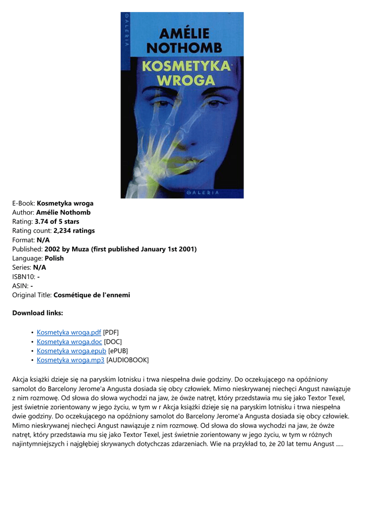 E-Book: Kosmetyka wroga Author: Amélie Nothomb Rating: 3.74 of 5 stars Rating count: 2,234 ratings Format: N/A Published: 2002 by Muza (first published January 1st 2001) Language: Polish Series: N/A ISBN10: ASIN: Original Title: Cosmétique de l'ennemi Download links: • • • • Kosmetyka wroga.pdf [PDF] Kosmetyka wroga.doc [DOC] Kosmetyka wroga.epub [ePUB] Kosmetyka wroga.mp3 [AUDIOBOOK] Akcja książki dzieje się na paryskim lotnisku i trwa niespełna dwie godziny. Do oczekującego na opóźniony samolot do Barcelony Jerome'a Angusta dosiada się obcy człowiek. Mimo nieskrywanej niechęci Angust nawiązuje z nim rozmowę. Od słowa do słowa wychodzi na jaw, że ówże natręt, który przedstawia mu się jako Textor Texel, jest świetnie zorientowany w jego życiu, w tym w r Akcja książki dzieje się na paryskim lotnisku i trwa niespełna dwie godziny. Do oczekującego na opóźniony samolot do Barcelony Jerome'a Angusta dosiada się obcy człowiek. Mimo nieskrywanej niechęci Angust nawiązuje z nim rozmowę. Od słowa do słowa wychodzi na jaw, że ówże natręt, który przedstawia mu się jako Textor Texel, jest świetnie zorientowany w jego życiu, w tym w różnych najintymniejszych i najgłębiej skrywanych dotychczas zdarzeniach. Wie na przykład to, że 20 lat temu Angust .....