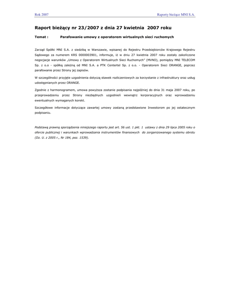 Rok 2007 Raporty bieżące MNI S.A. Raport bieżący nr 23/2007 z dnia 27 kwietnia 2007 roku Temat : Parafowanie umowy z operatorem wirtualnych sieci ruchomych Zarząd Spółki MNI S.A. z siedzibą w Warszawie, wpisanej do Rejestru Przedsiębiorców Krajowego Rejestru Sądowego za numerem KRS 0000003901, informuje, iż w dniu 27 kwietnia 2007 roku zostały zakończone negocjacje warunków „Umowy z Operatorem Wirtualnych Sieci Ruchomych” (MVNO), pomiędzy MNI TELECOM Sp. z o.o - spółką zależną od MNI S.A. a PTK Centertel Sp. z o.o. - Operatorem Sieci ORANGE, poprzez parafowanie przez Strony jej zapisów. W szczególności przyjęte uzgodnienia dotyczą stawek rozliczeniowych za korzystanie z infrastruktury oraz usług udostępnianych przez ORANGE. Zgodnie z harmonogramem, umowa powyższa zostanie podpisania najpóźniej do dnia 31 maja 2007 roku, po przeprowadzeniu przez Strony niezbędnych uzgodnień wewnątrz korporacyjnych oraz wprowadzeniu ewentualnych wymaganych korekt. Szczegółowe informacje dotyczące zawartej umowy zostaną przedstawione Inwestorom po jej ostatecznym podpisaniu. Podstawą prawną sporządzenia niniejszego raportu jest art. 56 ust. 1 pkt. 1 ustawy z dnia 29 lipca 2005 roku o ofercie publicznej i warunkach wprowadzania instrumentów finansowych do zorganizowanego systemu obrotu (Dz. U. z 2005 r., Nr 184, poz. 1539).