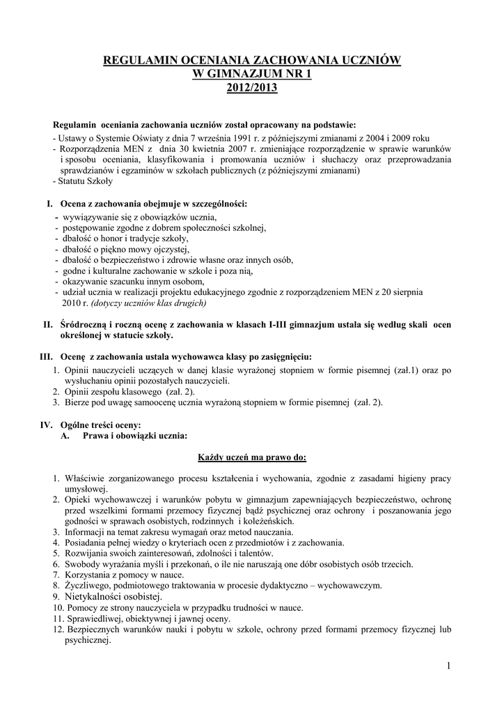 regulamin oceniania zachowania uczniów w gimnazjum nr 1 2012