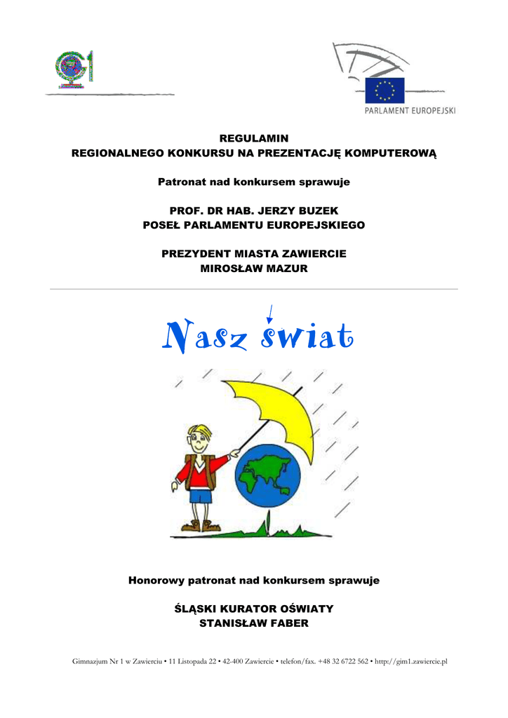 REGULAMIN REGIONALNEGO KONKURSU NA PREZENTACJĘ KOMPUTEROWĄ Patronat nad konkursem sprawuje PROF. DR HAB. JERZY BUZEK POSEŁ PARLAMENTU EUROPEJSKIEGO PREZYDENT MIASTA ZAWIERCIE MIROSŁAW MAZUR Honorowy patronat nad konkursem sprawuje ŚLĄSKI KURATOR OŚWIATY STANISŁAW FABER Gimnazjum Nr 1 w Zawierciu • 11 Listopada 22 • 42-400 Zawiercie • telefon/fax. +48 32 6722 562 • http://gim1.zawiercie.pl N A S Z Postanowienia ogólne Ś W I A T Organizator konkursu: Gimnazjum nr 1 w Zawierciu. Patronat nad konkursem sprawuje: prof. dr hab. Jerzy Buzek, Poseł Parlamentu Europejskiego, Mirosław Mazur, Prezydent Miasta Zawiercie Honorowy patronat nad konkursem sprawuje: mgr Stanisław Faber, Śląski Kurator Oświaty W roku szkolnym 2008/2009 konkurs przebiega pod hasłem: Nasz świat Cel konkursu Uczestnicy konkursu Zwrócenie uwagi młodzieży na potrzebę ochrony bogactwa natury jak i dorobku kulturowego; Mobilizowanie młodzieży do podejmowania własnych aktywności w obszarze ochrony różnorodności natury i dziedzictwa kulturowego; Promowanie technologii informacyjnej jako narzędzia przekazu; Kształcenie umiejętności publicznego prezentowania swoich poglądów, zainteresowań w przystępny i ciekawy sposób. Konkurs przeznaczony jest dla uczniów gimnazjów z terenu województwa śląskiego. Uczniowie pracują indywidualnie. Każda szkoła może zgłosić maksymalnie 5 uczestników. Do konkursu zgłasza uczniów nauczyciel-opiekun poprzez dostarczenie osobiście lub zwykłą pocztą, pracy konkursowej, streszczenia i formularza załączonego do regulaminu do dnia 31 stycznia 2009r. pod adres: Gimnazjum nr 1 w Zawierciu, 11 listopada 22, 42 - 400 Zawiercie, tel. 032 6722562, [email protected] Przystąpienie do konkursu jest równoznaczne z wyrażeniem zgody na późniejsze wykorzystanie przez organizatorów materiałów konkursowych. Prace i dokumentacja konkursowa przechowywana będzie do końca roku szkolnego 2008/2009. Harmonogram do 31 stycznia 2009r. - przyjmowanie prac, do 12 lutego 2009r . - ogłoszenie listy finalistów zakwalifikowanych do II etapu na stronie szkoły http://gim1.zawiercie.pl/ 25 lutego 2009r – finał konkursu i uroczyste podsumowanie konkursu. Etap I - prace konkursowe i ich ocena W I etapie należy dostarczyć prezentację komputerową wykonaną w PowerPoint lub Impress, streszczenie i formularz. Prezentacje sprawdzone merytorycznie przez nauczycieli-opiekunów nie powinny przekroczyć 25 slajdów i 20MB. Wymagany krótki elektroniczny opis - streszczenie pracy, ma zawierać 500-1000 znaków (liczone bez spacji). Prace będą oceniane wg kryteriów podanych w tabeli nr 1. Informujemy, że po I etapie nie będzie możliwości zamiany pracy na wersję zmodyfikowaną. Prosimy pamiętać o przestrzeganiu praw autorskich i podawaniu źródeł. Etap II - prace konkursowe i ich ocena II etap konkursu odbywać się będzie w MOK "Centrum" im A. Mickiewicza, Piastowska 1, 42-400 Zawiercie (dojazd na koszt własny). Ocenie podlegać będą wystąpienia uczestników (z wykorzystaniem autorskich prezentacji dostarczonych N A S Z Ś W I A T na I etapie konkursu). Oceniać będzie Jury wybrane m.in. również spośród przybyłych nauczycieli wg kryteriów podanych w tabeli nr 2. Informujemy, że prezentacje będą odtwarzane w programie Microsoft PowerPoint 2000 lub z użyciem programu PowerPoint Viewer w wersji określonej w formularzu przez uczestnika albo w programie Impress. Organizatorzy nie ponoszą odpowiedzialności za tempo odtwarzania prezentacji (nie zaleca się stosowania autoodtwarzania). Decyzja Jury jest ostateczna. Sprawy sporne rozstrzyga przewodniczący komisji. Nagrody W wyniku wyróżnienia. postępowania konkursowego zostaną przyznane nagrody, Uczestnicy konkursu i ich opiekunowie otrzymają pamiątkowe dyplomy. Lista zwycięzców konkursu zostanie podana do publicznej wiadomości na stronie internetowej: http://gim1.zawiercie.pl/ - witryna Gimnazjum nr 1 w Zawierciu Sponsorzy nagród prof. dr hab. Jerzy Buzek, Poseł Parlamentu Europejskiego Fundator głównej nagrody: wycieczka dla ucznia do Brukseli i iPodyy. Warunkiem koniecznym do odbioru nagrody głównej jest posiadanie 14 lat w kwietniu 2009 roku. W wypadku nie spełnienia tego wymogu uczeń otrzymuje inną nagrodę, a nagroda główna przechodzi na ucznia z najwyższą punktacją spełniającego ten wymóg. http://buzek.pl/ Microsoft Sp. z o.o. Fundator nagród http://www.microsoft.com/poland Apple IMC Poland SAD Ltd Fundator nagród http://www.apple.com.pl Wybór tematu Historia konkursu Przed wyboru tematu, prosimy o skorzystanie z materiałów na stronie Polskiego Komitetu ds. UNESCO http://www.unesco.pl/. Prezentowane są tam: Miejsca wpisane na Listę Światowego Dziedzictwa. Stanowią one wspólne dobro ludzkości. Miejsca wpisane na Listę Dziedzictwa Zagrożonego; Obiekty wpisane na Listę „Pamięci świata”, na którą wpisywane są obiekty o światowym znaczeniu historycznym lub cywilizacyjnym. Aktualnie Lista obejmuje 158 dokumentów. Siedem z nich reprezentuje polskie dziedzictwo. Wcześniejsze edycje konkursu: I edycja konkursu Podróż po krajach europejskich II edycja konkursu EUROPA nasz DOM III edycja konkursu Wielcy fizycy i ich odkrycia IV edycja konkursu Ulice mojego miasta V edycja konkursu Ocalić dla innych Podstawę do przeprowadzenia konkursu na najlepszą prezentację komputerową dla młodzieży gimnazjalnej stanowi Rozporządzenie Ministra Edukacji Narodowej i Sportu z dnia 29 stycznia 2002 r. w sprawie organizacji oraz sposobu przeprowadzania konkursów, turniejów i olimpiad (Dz. U. Nr 13, poz. 125). N A S Z Ś W I A T Tabela nr 1 Kryteria stosowane przy ocenie nadesłanych prac Ilość punktów Streszczenie (rzeczowość dołączonego opisu i jego bezpośredni związek z prezentacją). 5 pkt Struktura prezentacji (slajd tytułowy, końcowy, zastosowanie wzorca slajdów,...) 5 pkt Czytelność, estetyka i oryginalność (staranność, przedstawieni