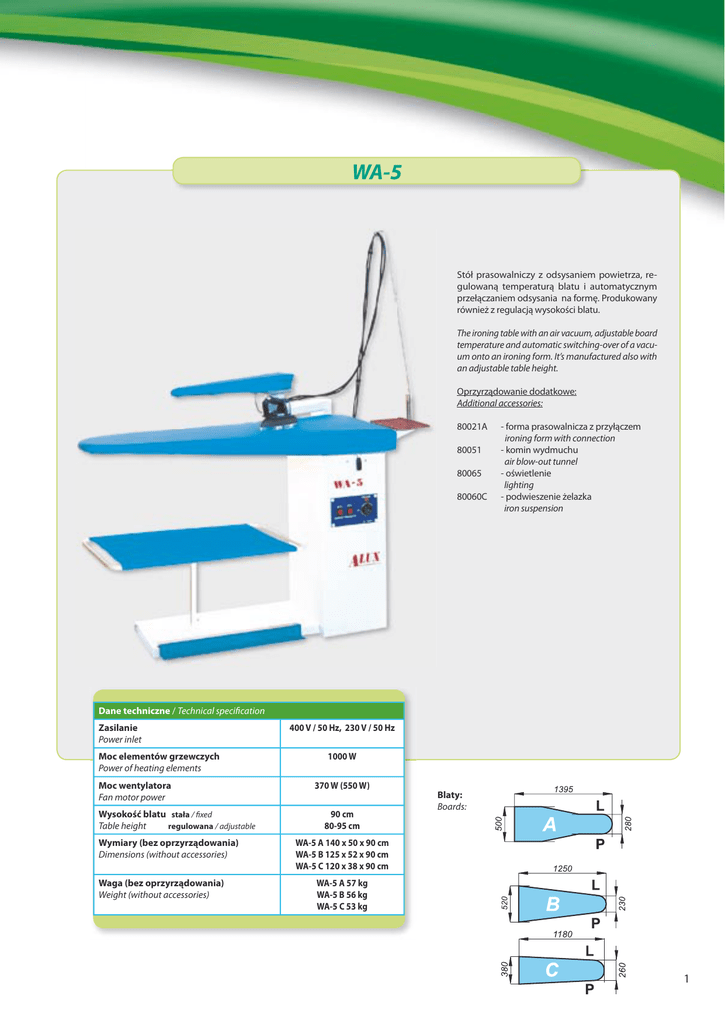 WA-5 Stół prasowalniczy z odsysaniem powietrza, regulowaną temperaturą blatu i automatycznym przełączaniem odsysania na formę. Produkowany również z regulacją wysokości blatu. The ironing table with an air vacuum, adjustable board temperature and automatic switching-over of a vacuum onto an ironing form. It’s manufactured also with an adjustable table height. Oprzyrządowanie dodatkowe: Additional accessories: 80021A 80051 80065 80060C - forma prasowalnicza z przyłączem ironing form with connection - komin wydmuchu air blow-out tunnel - oświetlenie lighting - podwieszenie żelazka iron suspension Dane techniczne / Technical specification Zasilanie Power inlet Moc elementów grzewczych Power of heating elements Moc wentylatora Fan motor power Wysokość blatu stała / fixed Table height regulowana / adjustable Wymiary (bez oprzyrządowania) Dimensions (without accessories) Waga (bez oprzyrządowania) Weight (without accessories) 400 V / 50 Hz, 230 V / 50 Hz 1000 W 370 W (550 W) 90 cm 80-95 cm Blaty: Boards: WA-5 A 140 x 50 x 90 cm WA-5 B 125 x 52 x 90 cm WA-5 C 120 x 38 x 90 cm WA-5 A 57 kg WA-5 B 56 kg WA-5 C 53 kg 1