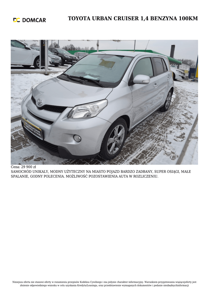 TOYOTA URBAN CRUISER 1,4 BENZYNA 100KM Cena: 29 900 zł SAMOCHÓD UNIKALY, MODNY UŻYTECZNY NA MIASTO POJAZD BARDZO ZADBANY, SUPER OSIĄGI, MAŁE SPALANIE, GODNY POLECENIA. MOŻLIWOŚĆ POZOSTAWIENIA AUTA W ROZLICZENIU. Niniejsza oferta nie stanowi oferty w rozumieniu przepisów Kodeksu Cywilnego i ma jedynie charakter informacyjny. Warunkiem przygotowania wiążącejoferty jest złożenie odpowiedniego wniosku w celu uzyskania Kredytu/Leasingu, oraz przedstawienie wymaganych dokumentów i podanie niezbędnychinformacji