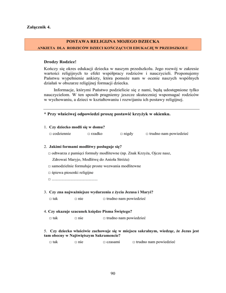 90 Załącznik 4. POSTAWA RELIGIJNA MOJEGO DZIECKA Drodzy