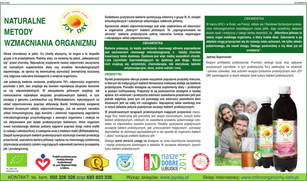REKLAMA NATURALNE METODY WZMACNIANIA ORGANIZMU Okres chorobowy w pełni. Co chwilę słyszymy, że kogoś a to dopadła grypa, a to przeziębienie. Robimy więc, co możemy by jakoś „zabezpieczyć się” przed chorobą. Najczęściej wspieranie naszej odporności zaczynamy od rozmaitych suplementów diety czy środków farmakologicznych zapominając, że oprócz tej ewentualnej stymulacji zewnętrznej kluczową rolę odgrywa naturalne biowsparcie z wnętrza organizmu. Jak pokazują badania naukowe, praktycznie 70% odporności organizmu pochodzi z jelit, tam znajduje się bowiem największe skupisko komórek za nią odpowiedzialnych. W ekosystemie jelitowym znajduje się równocześnie największe skupisko prozdrowotnych bakterii, w tym szczepy z gatunku Lactobacillus czy Bifidobakterium, wpływających na układ odpornościowy poprzez aktywację tkanki limfatycznej związanej błonami śluzowymi układu odpornościowego. Już od samych narodzin układ immunologiczny, jego komórki i zdolność rozpoznania zagrożenia mikrobiologicznego przychodzącego z zewnątrz organizmu i reakcja na nie aktywowana jest dzięki probiotycznym bakteriom, które organizm nowo narodzonego dziecka pobiera najpierw poprzez drogi rodne matki (z rodzaju Laktobacillus), a następnie wraz z mlekiem matki (Bifidobakterie). Zespół synergicznych bakterii probiotycznych stymuluje również produkcję przeciwciał, uszczelnia barierę jelitową i wpływa na równowagę cytokinową (stymulacja produkcji cytokin regulujących odpowiedź zarówno prozapalną jak i proalergiczną). Z015009053A Dodatkowo pożyteczne bakterie syntetyzują witaminy z grupy B, K, związki antyoksydacyjne i substancje odżywiające nabłonek jelitowy. Sprawność układu odpornościowego jest więc uzależniona od obecności w organizmie „dobrych” bakterii jelitowych. Te „zaprogramowane na zdrowie” bakterie probiotyczne pełnią naturalne funkcje wspierające i odciążające układ odpornościowy. CIEKAWOSTKA Badania pokazują, że każde zachwianie równowagi zdrowia poprzedzone jest zachwianiem równowagi mikrobiologicznej, a każdej chorobie towarzyszy także dysbioza. Dysbioza jest więc matką wszystkich chorób. Lista czynników doprowadzających do dysbiozy jest długa. Wśród nich znajdują się: antybiotyki, chemioterapia, leki sterydowe, tabletki antykoncepcyjne, stres, wolne rodniki i inne. PROBIOTYKI Rynek probiotyków oferuje przede wszystkim popularne produkty mleczne, w których do tradycyjnych bakterii fermentacji mlekowej dodaje się bakterie probiotyczne. Ponadto dostępne są również suplementy diety – probiotyki w postaci liofilizowanej. Preparaty te są powszechnie dostępne w każdej aptece. Ich witalność i praktyczna zdolność zasiedlania przestrzeni jelit jest jednak wątpliwa, poza tym nie posiadają one zdolności zasiedlania błon śluzowych jelit na całej ich rozciągłości. Najczęściej także zawierają one w swym składzie jedynie pojedyncze szczepy bakterii probiotycznych. CIEKAWOSTKA W marcu 2012 r. w Evian, we Francji, odbyło się I Światowe Sympozjum poświęcone mikroorganizmom zasiedlającym nasze jelita. Jego uczestnicy, eksperci świata nauki i medycyny z całego świata stwierdzili, że: „Mikroflora jelitowa to ważny organ ludzkiego organizmu, o który trzeba dbać. Zaburzenia w jej składzie mogą przyczyniać się do rozwoju wielu schorzeń, nie tylko układu pokarmowego, ale nawet mózgu. Dlatego powinniśmy o nią dbać już od urodzenia”. Jędrzej Soporowski Ekspert profilaktyki probiotycznej. Promotor ekologii życia oraz wpływów pozytywnych czynników, w tym probiotycznej flory bakteryjnej na witalność i zdrowie człowieka. Jest autorem receptur produktów probiotycznych serii JOY DAY zawierających w swym składzie żywe kultury bakterii probiotycznych. W prozdrowotnych terapiach probiotycznych mających przywrócić równowagę flory bakteryjnej jelit potrzebny jest zespół różnorodnych, żywych kultur bakterii probiotycznych, zdolnych do zasiedlenia przewodu pokarmowego człowieka na odpowiednio wysokim poziomie. Niestety spożywanie pojedynczych szczepów bakterii probiotycznych, jest „znieczuleniem miejscowym”, ponieważ doprowadza do dominacji wprowadzonych w ten sposób do organizmu bakterii i „słabo” rozwiązuje problem dysbiozy jelit. Dlatego warto zwrócić uwagę na dostępne na rynku bezmleczne koncentraty i napoje probiotyczne zawierające w składzie 16 szczepów aktywnych, żywych kultur bakterii probiotycznych. KONTAKT: tel. kom. 502 226 328 oraz 693 822 235. Wykaz sklepów: www.joyday.pl Sklep internetowy: www.mikroorganizmy.com.pl