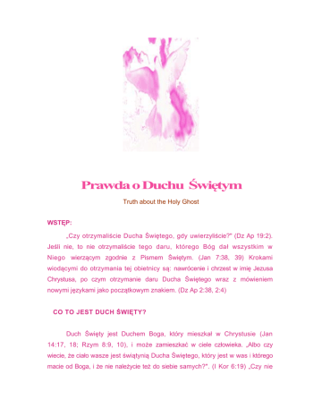 Prawda o Duchu Świętym Truth about the Holy Ghost WSTĘP: „Czy otrzymaliście Ducha Świętego, gdy uwierzyliście?" (Dz Ap 19:2). Jeśli nie, to nie otrzymaliście tego daru, którego Bóg dał wszystkim w Niego wierzącym zgodnie z Pismem Świętym. (Jan 7:38, 39) Krokami wiodącymi do otrzymania tej obietnicy są: nawrócenie i chrzest w imię Jezusa Chrystusa, po czym otrzymanie daru Ducha Świętego wraz z mówieniem nowymi językami jako początkowym znakiem. (Dz Ap 2:38, 2:4) CO TO JEST DUCH ŚWIĘTY? Duch Święty jest Duchem Boga, który mieszkał w Chrystusie (Jan 14:17, 18; Rzym 8:9, 10), i może zamieszkać w ciele człowieka. „Albo czy wiecie, że ciało wasze jest świątynią Ducha Świętego, który jest w was i którego macie od Boga, i że nie należycie też do siebie samych?". (I Kor 6:19) „Czy nie wiecie, że świątynią Bożą jesteście i że Duch Boży mieszka w was?" (I Kor 3:16). Kiedy Duch Święty po raz pierwszy napełnia człowieka, nazwane jest to „otrzymaniem daru Ducha Świętego" albo „ochrzczeniem Duchem Świętym". (Dz Ap 10:47, 11:16, 17) Jednym z zadań Ducha Świętego jest pocieszanie i nauczanie, „Lecz Pocieszyciel, Duch Święty, którego Ojciec pośle w imieniu moim, nauczy was wszystkiego i przypomni wam wszystko, co wam powiedziałem". (Jan 14:26) Napełnieniu Duchem Świętym towarzyszy pragnienie poznania prawdy Bożego Słowa. Duch Święty jest Duchem Prawdy i przychodzi, aby prowadzić i kierować człowieka wierzącego ku prawdzie. (Jan 16:13) Dar Ducha Świętego jest darem Bożym. Wszyscy, którzy wierzą w Pana Jezusa Chrystusa, otrzymają Ducha Świętego, tak jak mówi Pismo Święte. (Łuk 11:13, Jan 7:38, 39) OBIETNICA DUCHA ŚWIĘTEGO: ,A Piotr (rzekł) do nich: Nawróćcie się i niechaj się każdy z was da ochrzcić w imię Jezusa Chrystusa na odpuszczenie grzechów waszych, a otrzymacie dar Ducha Świętego. Obietnica ta bowiem odnosi się do was i do dzieci waszych oraz do wszystkich, którzy są z dala, ilu ich Pan, Bóg nasz, powoła". (Dz Ap 2:38,39) Dar Ducha Świętego obiecany był już w Starym Testamencie: „A potem wyleję mojego Ducha na wszelkie ciało, i wasi synowie i wasze córki prorokować będą, wasi starcy będą śnili, a wasi młodzieńcy będą mieli widzenia. Także na sługi i służebnice wyleję w owych dniach mojego Ducha". (Joel 3: 1,2) Jan Chrzciciel, zwiastun Jezusa Chrystusa, potwierdził tę obietnicę: „Ja was chrzczę wodą, ku nawróceniu, ale Ten, który po mnie idzie, jest mocniejszy niż ja; jemu nie jestem godzien i sandałów nosić; On was chrzcić będzie Duchem Świętym i ogniem". (Mat 3: 11) W 14 rozdziale Ewangelii Św. Jana, Jezus obiecał swoim uczniom, że powróci do nich po swoim wniebowstąpieniu, jako pocieszyciel, Duch Prawdy, zwany Duchem Świętym. Wcześniej, Jezus mówił o obietnicy rzeki wody żywej dla wszystkich wierzących: „Kto wierzy we mnie, jak powiada Pismo, z wnętrza jego popłyną rzeki wody żywej. A to mówił o duchu, którego mieli otrzymać ci, którzy w niego uwierzyli; albowiem Duch Święty nie był jeszcze dany, gdyż Jezus nie był jeszcze uwielbiony". (Jan 7:38, 39) Łukasz przekazał nam zapewnienie Jezusa; Duch Święty jest dobrym darem od Boga, i Bóg chętnie go da wszystkim tym, którzy go o to poproszą. „A Ja wam powiadam: Proście, a będzie wam dane; szukajcie, a znajdziecie; kołaczcie, a otworzą wam. Każdy bowiem, kto prosi, otrzymuje, a kto szuka, znajduje, a kto kołacze, temu otworzą. Gdzież jest taki ojciec pośród was, który, gdy syn będzie go prosił o chleb, da mu kamień? Albo gdy będzie go prosił o rybę, da mu zamiast ryby węża? Albo gdy będzie go prosił o jajo, da mu skorpiona? Jeśli więc wy, którzy jesteście źli, umiecie dobre dary dawać dzieciom swoim, o ileż bardziej Ojciec niebieski da Ducha Świętego tym, którzy go proszą". (Łuk 1 1:9-13) Bóg pragnie, aby wszyscy ludzie otrzymali Jego dar— Ducha Świętego. Naszym zadaniem jest: uwierzyć w Niego, zgodnie z Pismem (Jan 7:38), nawrócić się i dać się ochrzcić w imię Jezusa (Dz Ap 2:38), a wtedy, prosząc Go, otrzymamy obiecany dar Ducha Świętego. (Łuk 11:10) WCZESNY KOŚCIÓŁ OTRZYMAŁ DUCHA ŚWIĘTEGO: Jezus nakazał swoim uczniom: „A oto Ja zsyłam na was obietnicę mojego Ojca. Wy zaś pozostańcie w mieście, aż zostaniecie przyobleczeni mocą z wysokości". (Łuk 24:49) Około 120 uczniów posłuchało Jego nakazu i w dniu Pięćdziesiątnicy, w Jerozolimie, prawie dwa tysiące lat temu, Jezus wypełnił Swoją obietnicę: „A gdy nadszedł dzień Zielonych Świąt Pięćdziesiątnicy, byli wszyscy razem na jednym miejscu. I powstał nagle z nieba szum, jakby wiejącego gwałtownego wiatru, i napełnił cały dom, gdzie siedzieli. I ukazały się im języki jakby z ognia, które się rozdzieliły i usiadły na każdym z nich. I napełnieni zostali wszyscy Duchem Świętym, i zaczęli mówić innymi językami, tak jak im Duch poddawał". (Dz Ap 2:1-4) Powyższy fragment Pisma Świętego opisuje po raz pierwszy jedno z najważniejszych przeżyć dostępnych każdemu człowiekowi: otrzymanie daru Ducha Świętego. Joel prorokował „WSZELKIE CIAŁO". (Joel 3:1) Jezus powiedział „KAŻDY" kto prosi otrzymuje. (Łuk 11:10) Tego samegu dnia po napełnieniu Duchem Świętym, Piotr mówił o ciągłości obietnicy daru Ducha Świętego, a zdumiony tłum nie wiedział co o tym myśleć. Piotr skorzystał z okazji, i wytłumaczył im, że to było to, co czym mówił prorok Joel. Także przekonał ich, że Jezus, którego oni niesprawiedliwie ukrzyżowali był Panem i Chrystusem. Wtedy wszyscy zebrani przejęli się do głębi serca i zapytali Piotra i pozostałych Apostołów: „Cóż mamy uczynić bracia? Nawróćcie się — powiedział do nich Piotr i niech każdy z was ochrzci się w imię Jezusa Chrystusa na odpuszczenie grzechów waszych, a weźmiecie w darze Ducha Świętego. Bo dla was jest obietni