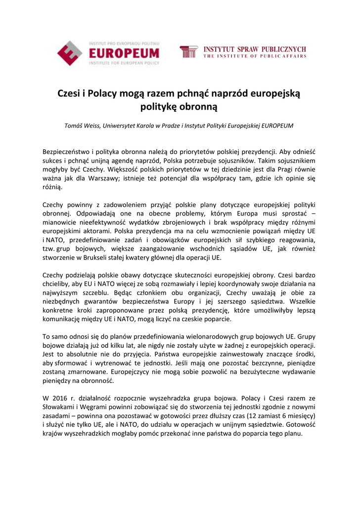 Czesi i Polacy mogą razem pchnąć naprzód europejską politykę obronną Tomáš Weiss, Uniwersytet Karola w Pradze i Instytut Polityki Europejskiej EUROPEUM Bezpieczeństwo i polityka obronna należą do priorytetów polskiej prezydencji. Aby odnieść sukces i pchnąć unijną agendę naprzód, Polska potrzebuje sojuszników. Takim sojusznikiem mogłyby być Czechy. Większość polskich priorytetów w tej dziedzinie jest dla Pragi równie ważna jak dla Warszawy; istnieje też potencjał dla współpracy tam, gdzie ich opinie się różnią. Czechy powinny z zadowoleniem przyjąć polskie plany dotyczące europejskiej polityki obronnej. Odpowiadają one na obecne problemy, którym Europa musi sprostać – mianowicie nieefektywność wydatków zbrojeniowych i brak współpracy między różnymi europejskimi aktorami. Polska prezydencja ma na celu wzmocnienie powiązań między UE i NATO, przedefiniowanie zadań i obowiązków europejskich sił szybkiego reagowania, tzw. grup bojowych, większe zaangażowanie wschodnich sąsiadów UE, jak również stworzenie w Brukseli stałej kwatery głównej dla operacji UE. Czechy podzielają polskie obawy dotyczące skuteczności europejskiej obrony. Czesi bardzo chcieliby, aby EU i NATO więcej ze sobą rozmawiały i lepiej koordynowały swoje działania na najwyższym szczeblu. Będąc członkiem obu organizacji, Czechy uważają je obie za niezbędnych gwarantów bezpieczeństwa Europy i jej szerszego sąsiedztwa. Wszelkie konkretne kroki zaproponowane przez polską prezydencję, które umożliwiłyby lepszą komunikację między UE i NATO, mogą liczyć na czeskie poparcie. To samo odnosi się do planów przedefiniowania wielonarodowych grup bojowych UE. Grupy bojowe działają już od kilku lat, ale nigdy nie zostały użyte w żadnej z europejskich operacji. Jest to absolutnie nie do przyjęcia. Państwa europejskie zainwestowały znaczące środki, aby sformować i wytrenować te jednostki. Jeśli mają one pozostać bezczynne, pieniądze zostaną zmarnowane. Europejczycy nie mogą sobie pozwolić na bezużyteczne wydawanie pieniędzy na obronność. W 2016 r. działalność rozpocznie wyszehradzka grupa bojowa. Polacy i Czesi razem ze Słowakami i Węgrami powinni zobowiązać się do stworzenia tej jednostki zgodnie z nowymi zasadami – powinna ona pozostawać w gotowości przez dłuższy czas (12 zamiast 6 miesięcy) i służyć nie tylko UE, ale i NATO, do udziału w operacjach w unijnym sąsiedztwie. Gotowość krajów wyszehradzkich mogłaby pomóc przekonać inne państwa do poparcia tego planu. Zaangażowanie wschodnich sąsiadów UE w europejskie bezpieczeństwo i obronność może okazać się bardzo trudnym zadaniem. Większość Europejczyków ma obecnie oczy skierowane na świat arabski i nie obchodzi ich wschodnie sąsiedztwo. Ważniejszym zadaniem dla polskiej prezydencji jest niedopuszczenie, aby Ukraina, Mołdawia i Gruzja zniknęły z europejskiego radaru. Leży to w interesie nie tylko Polski, ale i Czech, które również postrzegają wschodnie sąsiedztwo jako swój priorytet. Czechy mogą zatem pomóc prezydencji w promowaniu tej idei i budowaniu koalicji podobnie myślących państw w UE. Prezydencja powinna skorzystać z okazji, odpowiednio wcześnie udostępniać Czechom informacje i wspierać ich zaangażowanie w zamian za ich wsparcie. Stworzenie stałego dowództwa EU w Brukseli może okazać się jedyną kwestią, w której Praga nie będzie podzielała polskich poglądów. Czesi zawsze byli podejrzliwi wobec tego, co uważają za powielanie narzędzi, które są już dostępne w NATO. I nie były osamotnione w swoich wątpliwościach. Wielka Brytania zawetowała podobną propozycję w 2003 r. Nie mniej jednak, pomysł nie jest całkiem nietrafiony. UE potrzebuje innego typu dowództwa operacyjnego niż to, którego używa NATO, ponieważ poza misjami wojskowymi prowadzi również operacje cywilne. Prezydencja będzie musiała rozgrywać tę kwestię w sposób bardzo jasny i przekonujący. Czechy mogą pomóc prezydencji udoskonalić jej argumentację w dwustronnym dialogu, zanim propozycja trafi na poziom Rady. Ponadto czescy obywatelscy demokraci są najbliższymi sojusznikami brytyjskich konserwatystów w UE. Ich konstruktywne zaangażowanie może pomóc przekonać Brytyjczyków, których błogosławieństwo dla takiego projektu jest niezbędne. Podsumowując, jest dużo miejsca dla polsko-czeskiej współpracy. Oba kraje tak samo oceniają sytuację i mają wspólne interesy. Każda prezydencja potrzebuje sojuszników, aby odnieść sukces, a Czechy powinny być dla Polski naturalnym wyborem. Artykuł powstał w ramach projektu “Polska Prezydencja w UE w 2011 r.: czeskie oczekiwania i możliwości współpracy”, realizowanego przez EUROPEUM Instytut Polityki Europejskiej we współpracy z Instytutem Spraw Publicznych przy wsparciu czeskiego Ministerstwa Spraw Zagranicznych w ramach Forum Polsko-Czeskiego.
