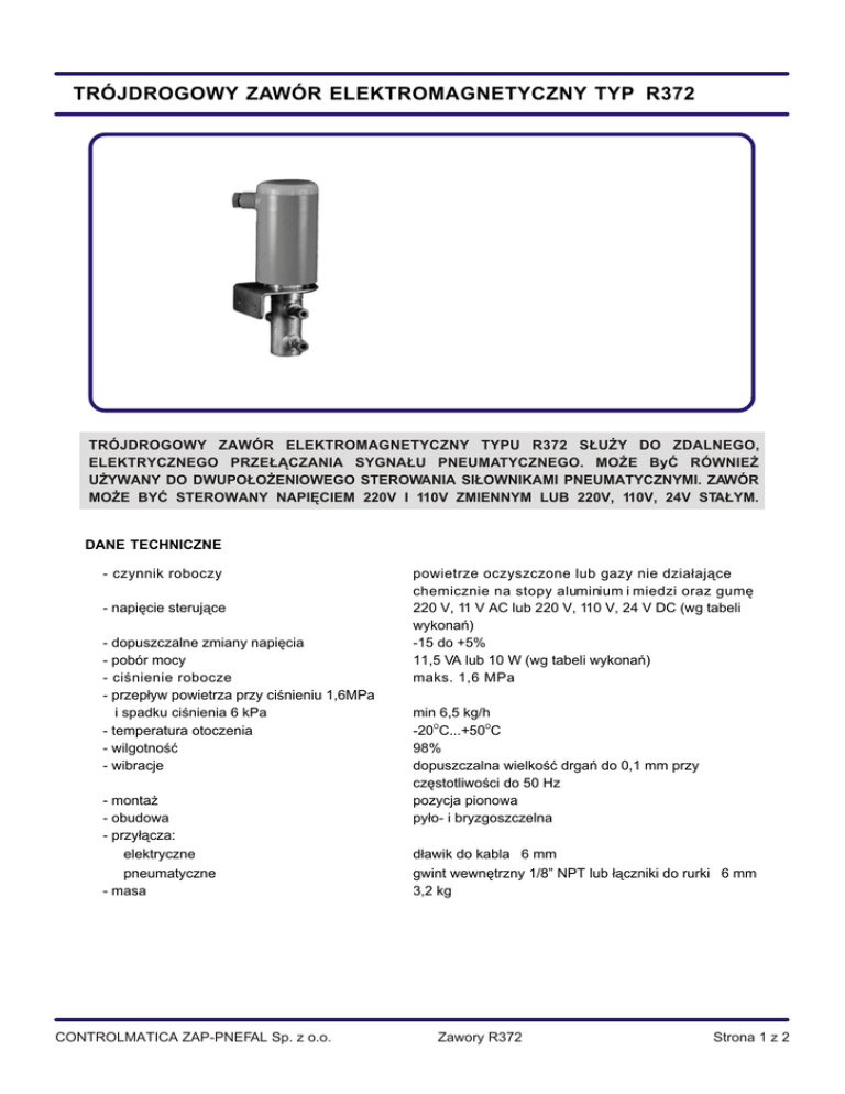 TRÓJDROGOWY ZAWÓR ELEKTROMAGNETYCZNY TYP R372 TRÓJDROGOWY ZAWÓR ELEKTROMAGNETYCZNY TYPU R372 S£U¯Y DO ZDALNEGO, ELEKTRYCZNEGO PRZE£¥CZANIA SYGNA£U PNEUMATYCZNEGO. MO¯E ByÆ RÓWNIE¯ U¯YWANY DO DWUPO£O¯ENIOWEGO STEROWANIA SI£OWNIKAMI PNEUMATYCZNYMI. ZAWÓR MO¯E BYÆ STEROWANY NAPIÊCIEM 220V I 110V ZMIENNYM LUB 220V, 110V, 24V STA£YM. DANE TECHNICZNE - czynnik roboczy - napiêcie steruj¹ce - dopuszczalne zmiany napiêcia - pobór mocy - ciœnienie robocze - przep³yw powietrza przy ciœnieniu 1,6MPa i spadku ciœnienia 6 kPa - temperatura otoczenia - wilgotnoœæ - wibracje - monta¿ - obudowa - przy³¹cza: elektryczne pneumatyczne - masa CONTROLMATICA ZAP-PNEFAL Sp. z o.o. powietrze oczyszczone lub gazy nie dzia³aj¹ce chemicznie na stopy aluminium i miedzi oraz gumê 220 V, 11 V AC lub 220 V, 110 V, 24 V DC (wg tabeli wykonañ) -15 do +5% 11,5 VA lub 10 W (wg tabeli wykonañ) maks. 1,6 MPa min 6,5 kg/h -20OC...+50OC 98% dopuszczalna wielkoœæ drgañ do 0,1 mm przy czêstotliwoœci do 50 Hz pozycja pionowa py³o- i bryzgoszczelna d³awik do kabla f6 mm gwint wewnêtrzny 1/8” NPT lub ³¹czniki do rurki f6 mm 3,2 kg Zawory R372 Strona 1 z 2 DANE TECHNICZNE - c.d. - materia³y: korpus zaworu obudowa mosi¹dz stal wêglowa pokryta winylem i malowana lakierowana ftalowym szarym tworzywo mosi¹dz stal nierdzewna mosi¹dz niklowany pokrywa górna gniazdo grzybek ³¹czniki pneumatyczne RYSUNEK GABARYTOWY Trójdrogowy zawór elektromagnetyczny sk³ada siê z dwóch zasadniczych zespo³ów: - korpusu z zespo³em gniazd i grzybków zaworu - elektromagnesu. Konstrukcja zaworu charakteryzuje siê zwart¹ budow¹ i szczelnoœci¹ zamkniêcia zespo³u gniazdo-grzybek. TABELA WYKONAÑ Trójdrogowy zawór elektromagnetyczny, wykonanie nr Wykonanie A001 A002 A003 A004 A005 Napiêcie steruj¹ce 220 V, 50 Hz 220 V, pr¹d sta³y 110 V, 50 Hz 110 V, pr¹d sta³y 24 V, pr¹d sta³y Pobór mocy 11,5 VA 10 W 11,5VA 10 W 10 W WYKONANIE SPECJALNE: Zawór wyposa¿ony we wspornik monta¿owy, wykonany ze stali wêglowej kadmowej. Inne wykonania wymagaj¹ uzgodnienia z producentem. PRZY£¥CZA PNEUMATYCZNE: W komplecie z urz¹dzeniem dostarczane s¹ ³¹czniki z gwintem 1/8" NPT i czêœciami do po³¹czenia rurki f6 mm miedzianej lub polietylenowej. SPOSÓB ZAMAWIANIA W zamówieniu prosimy okreœliæ: nazwê i typ wyrobu, numer wykonania oraz wykonania specjalne.. Zastrzega siê prawo wprowadzania zmian konstrukcyjnych wyrobu bez pogorszenia parametrów u¿ytkowych. CONTROLMATICA ZAP-PNEFAL Sp. z o.o. Zawory R372 Strona 2 z 2 Styczeñ 2005