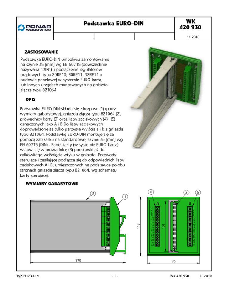 WK 420 930 Podstawka EURO-DIN 11.2010 ZASTOSOWANIE Podstawka EURO-DIN umożliwia zamontowanie na szynie 35 [mm] wg EN 60715 (powszechnie nazywana "DIN") i podłączenie regulatorów prądowych typu 20RE10; 30RE11; 32RE11 o budowie panelowej w systemie EURO-karta, lub innych urządzeń montowanych na gniazdo złącza typu 821064. OPIS Podstawka EURO-DIN składa się z korpusu (1) (patrz wymiary gabarytowe), gniazda złącza typu 821064 (2), prowadnicy karty (3) oraz listw zaciskowych (4) i (5) oznaczonych jako A i B.Do listw zaciskowych doprowadzone są tylko parzyste wyjścia a i b z gniazda typu 821064. Podstawkę EURO-DIN montuje się za pomocą zatrzasku na standardowej szynie 35 [mm] wg EN 60715 (DIN) . Panel karty (w systemie EURO-karta) wsuwa się w prowadnicę (3) podstawki aż do całkowitego wciśnięcia wtyku w gniazdo. Przewody sterujące i zasilające podłącza się do odpowiednich listw zaciskowych A i B, umieszczonych na podstawce po obu stronach gniazda złącza typu 821064, wg schematu karty sterującej. WYMIARY GABARYTOWE 4 3 5 2 1 175 Typ EURO-DIN B 2 4 6 8 10 12 14 16 18 20 22 24 26 28 30 32 101 119 A 2 4 6 8 10 12 14 16 18 20 22 24 26 28 30 32 96 -1- WK 420 930 11.2010 DANE TECHNICZNE od -50 do +70 [ o C] Szyna nośna 35 x 7.5 x 1 [mm] (EN 60715) Temperatura pracy Rodzaj mocowania Szerokość prowadnicy Wymiary (D x W x S) Masa 101 [mm] 117 x 119 x 96 0,24 [kg] SPOSÓB ZAMAWIANIA Urządzenie należy zamawiać wg niżej przedstawionego kodu. EURO-DIN - 1 Przykład oznaczenia: EURO URO-DIN-1 N-1 NOTATKI PONAR Wadowice S.A. ul. Wojska Polskiego 29 34-100 Wadowice tel. +48 33 488 29 00 fax.+48 33 488 21 03 www.ponar-wadowice.pl WK 420 930 11.2010 -2- Typ EURO-DIN