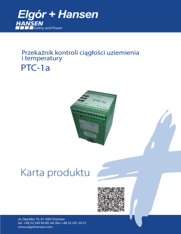 Przekaźnik kontroli ciągłości uziemienia i temperatury PTC-1a Karta produktu ul. Opolska 19, 41-500 Chorzów tel. +48 32 249 94 80, tel./fax +48 32 241 34 57 www.elgorhansen.com CECHY CHARAKTERYSTYCZNE Przekaźnik kontroli ciągłości uziemienia i temperatury typu PTC-1a jest dwuczłonowym elektronicznym układem przekaźnikowym: jeden człon sprawdza ciągłość uziemienia od miejsca zainstalowania do kontrolowanego obiektu i w samym obiekcie (np. w silniku elektrycznym) i reaguje na wzrost jego rezystancji, natomiast drugi człon sprawdza temperaturę w tym obiekcie i również reaguje na jej nadmierny wzrost. W tym drugim przypadku konieczne jest, aby kontrolowany obiekt był wyposażony w pozystorowe lub bimetaliczne czujniki temperatury umieszczone np. w uzwojeniach silnika. Każdy z członów zareaguje również, jeżeli w jego obwodzie pomiarowym wystąpi zwarcie lub przerwa. Obwody pomiarowe każdego członu są iskrobezpieczne, natomiast obwody wyjściowe mogą pracować w układach nieiskrobezpiecznych i włącza się je w obwód sterowania kontrolowanego obiektu. Przekaźnik PTC-1a przewidziany jest do zabudowy zarówno w ognioszczelnych komorach głównych wyłączników stycznikowych jak też w komorach przyłączeniowych. BUDOWA Moduł przekaźnika umieszczony jest w obudowie z tworzywa sztucznego przewidzianej do montażu na szynie 35 mm wg EN 50022. Na zewnątrz obudowy wyprowadzone są: • zaciski (15-18, 24-26) iskrobezpiecznych obwodów pomiarowych umieszczone po jednej stronie, • zaciski (1-2-3, 4-5-6, 9-10, 11-12-13) obwodów styków przekaźników wykonawczych oraz zaciski (7-8) obwodu zasilania przekaźnika PTC-1a umieszczone po drugiej stronie. Wszystkie zaciski umożliwiają przyłączenie przewodów wielodrutowych o przekroju do 2,5 mm2. W górnej części obudowy (pokrywa obudowy) widoczne są trzy diody świecące Led • PK1 (kolor zielony): sygnalizuje działanie przekaźnika PK1 - kontrola ciągłości uziemienia, • ~ 42V (kolor żółty): sygnalizuje przyłączenie napięcia zasilającego i gotowość do pracy, • PK2 (kolor zielony): sygnalizuje działanie przekaźnika PK2 - kontrola temperatury. Z boku umieszczona jest tabliczka przedstawiająca w sposób schematyczny poszczególne bloki przekaźnika, jego zaciski oraz ich opis. OPIS DZIAŁANIA Działanie przekaźnika PTC-1a przedstawi schemat blokowy, wyjaśniający również sposób przyłączenia zewnętrznych elementów pomiarowych. Wyróżnia się następujące bloki funkcjonalne: St1, St2 – stabilizator i bariera iskrobezpieczna G – generator 80 Hz; 16,5V AC UPR – układ progowy rezystancji UPT – układ progowy temperatury PK1, PK2 – przekaźnikwykonawczy CZŁON KONTROLI CIĄGŁOŚCI UZIEMIENIA Człon kontroli ciągłości uziemienia zasilany jest przez stabilizator St1 z barierą iskrobezpieczna. Napięcie przemienne prostokątne z generatora G podawane jest do zacisków pomiarowych 24-26. Zamknięcie obwodu pomiarowego przez diodę o dowolnym kierunku przewodzenia powoduje przesłanie wyprostowanego napięcia pomiarowego do układu progowego UPR. W zakresie rezystancji 0 + 80 Ω przekaźnik wykonawczy PK1 będzie działał, umożliwiając tym samym załączenie odbiornika. Przy wzroście rezystancji uziemienia a tym samym rezystancji pętli pomiarowej powyżej tej wartości przekaźnik PK1 zwolni, wyłączając tym samym kontrolowany odbiornik. Układ zachowa się identycznie również w przypadku: - zwarcia zacisków pomiarowych (zwarcia diody), - powstania przerwy w pętli pomiarowej, - odłączenia napięcia zasilania. CZŁON KONTROLI TEMPERATURY Człon kontroli temperatury zasilany jest przez stabilizator St1 z barierą iskrobezpieczna. Stałe napięcie pomiarowe podawane jest do zacisków pomiarowych 15-18. Zamknięcie obwodu pomiarowego przez zespół pozystorów umieszczonych w uzwojeniach silnika powoduje przesłanie napięcia pomiarowego o określonej wartości do układu progowego UPT. W przedziale rezyst.: 500 Ω do 7,0 kΩ przekaźnik wykonawczy PK2 będzie działał, umożliwiając tym samym załączenie odbiornika. Przy wzroście rezystancji pozystorów przekaźnik PK2 zwolni, wyłączając tym samym kontrolowany odbiornik. Przekaźnik PK2 zwolni również w przypadku spadku rezystancji pętli pomiarowej poniżej 100 Ω (np. w przypadku zwarcia zacisków pomiarowych). Zamiast pozystorów w uzwojeniach silnika mogą być użyte wyłączniki bimetaliczne, jednak wówczas w szereg z nimi należy włączyć rezystor o wartości 1 kΩ. www.elgorhansen.com Przekaźnik kontroli ciągłości uziemienia i temperatury PTC-1a DANE TECHNICZNE Napięcie zasilające 42V, 50Hz Tolerancja napięcia zasilającego 0,85 do 1,2 Un Pobór mocy ≤ 6,5 VA Człon kontroli ciągłości uziemienia <100Ω Rezystancja blokowania (Rbu) 15 ÷ 80Ω Rezystancja powrotu (Rpu) Czas zadziałania przekaźnika PK1: – od momentu zamknięcia obwodu pomiarowego diodą do chwili przełączenia zestyków wykonawczych – od momentu załączenia napięcia zasilania do chwili przełączenia zestyków wykonawczych (pętla pomiarowa zamknięta diodą) ≤ 300 ms ≤1s Czas otwarcia zestyków przekaźnika PK1: – o d momentu otwarcia lub zwarcia obwodu pomiarowego do chwili przełączenia zestyków wykonawczych – od momentu odłączenia napięcia zasilania do chwili przełączenia zestyków przekaźnika Napięcie pomiarowe ≤150ms ≤150 ms 16,5VAC,f = 80Hz±10Hz Parametry zestyków przekaźnika wykonawczego 5 A/50 VAC Człon kontroli temperatury Rezystancji blokowania (Rbt) ≤14kΩ Zakres rezystancji powrotu ((Rpt) ≤9,0kΩ Rezystancja blokowania (Rbt) - zwarcie obwodu pomiarowego ≥100Ω Rezystancja powrotu (Rpt) - zwarcie obwodu pomiarowego ≥300Ω Czas zadziałania przekaźnika PK2: – od momentu zamknięcia obwodu pomiarowego rezystorem 1kΩ do chwili przełączenia zestyków wykonawczych – od momentu załączenia napięcia zasilania do chwili przełączenia zestyków wykonawczych (pętla