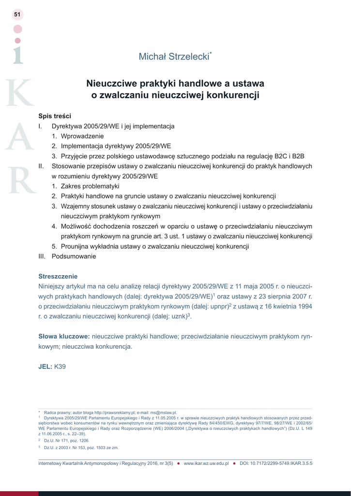 51 Michał Strzelecki* Nieuczciwe praktyki handlowe a ustawa o zwalczaniu nieuczciwej konkurencji Spis treści I. Dyrektywa 2005/29/WE i jej implementacja 1. Wprowadzenie 2. Implementacja dyrektywy 2005/29/WE 3. Przyjęcie przez polskiego ustawodawcę sztucznego podziału na regulację B2C i B2B II. Stosowanie przepisów ustawy o zwalczaniu nieuczciwej konkurencji do praktyk handlowych w rozumieniu dyrektywy 2005/29/WE 1. Zakres problematyki 2. Praktyki handlowe na gruncie ustawy o zwalczaniu nieuczciwej konkurencji 3. Wzajemny stosunek ustawy o zwalczaniu nieuczciwej konkurencji i ustawy o przeciwdziałaniu nieuczciwym praktykom rynkowym 4. Możliwość dochodzenia roszczeń w oparciu o ustawę o przeciwdziałaniu nieuczciwym praktykom rynkowym na gruncie art. 3 ust. 1 ustawy o zwalczaniu nieuczciwej konkurencji 5. Prounijna wykładnia ustawy o zwalczaniu nieuczciwej konkurencji III. Podsumowanie Streszczenie Niniejszy artykuł ma na celu analizę relacji dyrektywy 2005/29/WE z 11 maja 2005 r. o nieuczciwych praktykach handlowych (dalej: dyrektywa 2005/29/WE)1 oraz ustawy z 23 sierpnia 2007 r. o przeciwdziałaniu nieuczciwym praktykom rynkowym (dalej: upnpr)2 z ustawą z 16 kwietnia 1994 r. o zwalczaniu nieuczciwej konkurencji (dalej: uznk)3. Słowa kluczowe: nieuczciwe praktyki handlowe; przeciwdziałanie nieuczciwym praktykom rynkowym; nieuczciwa konkurencja. JEL: K39 * Radca prawny; autor bloga http://praworeklamy.pl; e-mail: [email protected]. Dyrektywa 2005/29/WE Parlamentu Europejskiego i Rady z 11.05.2005 r. w sprawie nieuczciwych praktyk handlowych stosowanych przez przedsiębiorstwa wobec konsumentów na rynku wewnętrznym oraz zmieniająca dyrektywę Rady 84/450/EWG, dyrektywy 97/7/WE, 98/27/WE i 2002/65/ WE Parlamentu Europejskiego i Rady oraz Rozporządzenie (WE) 2006/2004 („Dyrektywa o nieuczciwych praktykach handlowych”) (Dz.U. L 149 z 11.06.2005 r., s. 22–39). 1 2 Dz.U. Nr 171, poz. 1206. 3 Dz.U. z 2003 r. Nr 153, poz. 1503 ze zm. internetowy Kwartalnik Antymonopolowy i Regulacyjny 2016, nr 3(5) www.ikar.wz.uw.edu.pl DOI: 10.7172/2299-5749.IKAR.3.5.5 52 Michał Strzelecki Nieuczciwe praktyki handlowe a ustawa o zwalczaniu nieuczciwej konkurencji I. Dyrektywa 2005/29/WE i jej implementacja 1. Wprowadzenie Dyrektywa 2005/29/WE o nieuczciwych praktykach handlowych stanowi jeden z najważniejszych aktów prawa unijnego regulujących problematykę ochrony praw konsumenta. Celem dyrektywy było wyeliminowanie przeszkód w transgranicznym swobodnym przepływie usług i towarów oraz w swobodzie przedsiębiorczości, co zgodnie z motywem 5 dyrektywy 2005/29/WE może zostać dokonane „jedynie poprzez ustanowienie na poziomie Wspólnoty jednolitych zasad zapewniających wysoki poziom ochrony konsumentów oraz poprzez wyjaśnienie na poziomie Wspólnoty pewnych pojęć prawnych w takim zakresie, w jakim jest to konieczne dla właściwego funkcjonowania rynku wewnętrznego oraz dla spełnienia wymogu pewności prawa”4. Dyrektywa 2005/29/WE w kompleksowy sposób reguluje praktyki handlowe stosowane przez przedsiębiorców wobec konsumentów, nie znajduje natomiast zastosowania do takich praktyk, „które, chociaż nie szkodzą konsumentom, mogą przynosić szkodę konkurentom i klientom będącym podmiotami gospodarczymi”5. 2. Implementacja dyrektywy 2005/29/WE Proces implementacji dyrektywy 2005/29/WE determinowało przyjęcie zasady pełnej harmonizacji (Maliszewska-Nienartowicz, 2007, s. 21), zgodnie z którą państwa członkowskie nie mogą wprowadzać mniej lub bardziej restryktywnych przepisów, chyba że dyrektywa wyraźnie na to zezwala (Namysłowska, 2007b, s. 35). Trafnie wskazuje się, że dyrektywy posługujące się harmonizacją pełną praktycznie nie pozostawiają państwom członkowskim swobody implementacyjnej (Kunkiel-Kryńska, 2007, s. 989). W tym kontekście implementacja dyrektywy 2005/29/WE, operującej siatką pojęciową w dużej mierze obcą krajowemu systemowi prawnemu, nie była łatwym zadaniem. Osiągnięcie celu w postaci wprowadzenia postanowień dyrektywy do krajowego porządku prawnego nie odbywa się wyłącznie na płaszczyźnie ustawodawczej (transpozycja). O prawidłowości implementacji przesądza również etap stosowania prawa przez sądy oraz inne organy państw członkowskich (Wróbel, 2010, s. 114). Trzeba przy tym zauważyć, że obowiązek prounijnej wykładni prawa polskiego „obejmuje również przepisy krajowe, które nie mają na celu implementacji dyrektyw bądź które istniały przed wejściem w życie określonej dyrektywy”6. Polski ustawodawca, dokonując transpozycji postanowień dyrektywy 2005/29/WE w drodze odrębnej ustawy, wybrał rozwiązanie łatwiejsze i – jak mogłoby się wydawać – bezpieczniejsze (Kunkiel-Kryńska, 2007, s. 993)7, spełniające wymóg widoczności (Namysłowska, 2010a, s. 34), co jednak spotkało się z krytyką większości przedstawicieli doktryny (Kępiński, 2007; Namysłowska, 2007a; Namysłowska i Sztobyrn, 2008, s. 65; Skubisz, 2010, s. 32; Stefanicki, 2009a, s. 89; Szwaja i Tischner, 2007, s. 1118–1119). Już w pierwszych wypowiedziach dotyczących implementacji dyrektywy 2005/29/WE pojawiły się wątpliwości co do jej relacji do ustawy o zwalczaniu 4 Zob. również art. 1 oraz motywy 3 i 4 dyrektywy 2005/29/WE. 5 Motyw 8 dyrektywy 2005/29/WE. 6 Wyr. TSUE w sprawie C-106/89 Marleasing ECLI:EU:C:1990:395, za: Kowalik-Bańczyk (2007, s. 404). 7 Przyjęte przez polskiego ustawodawcę rozwiązanie pozostaje to w zgodności z tendencją wspieraną przez Komisję Europejską i TSUE, zob. Howells (2006, s. 25). internetowy Kwartalnik Antymonopolowy i Regulacyjny 2016, nr 3(5) www.ikar.wz.uw.edu.pl DOI: 10.7172/2299-5749.IKAR.3.5.5 53 Michał Strzelecki Nieuczciwe praktyki handlowe a ustawa o zwalczaniu nieuczciwej konkurencji nieuczciwej konkurencji (Kępiński, 2007; Podrecki, 2007, s. 385; Szwaja i Tischner, 2007, s. 1118–1119). 3. Przyjęcie przez polskiego ustawodawcę s