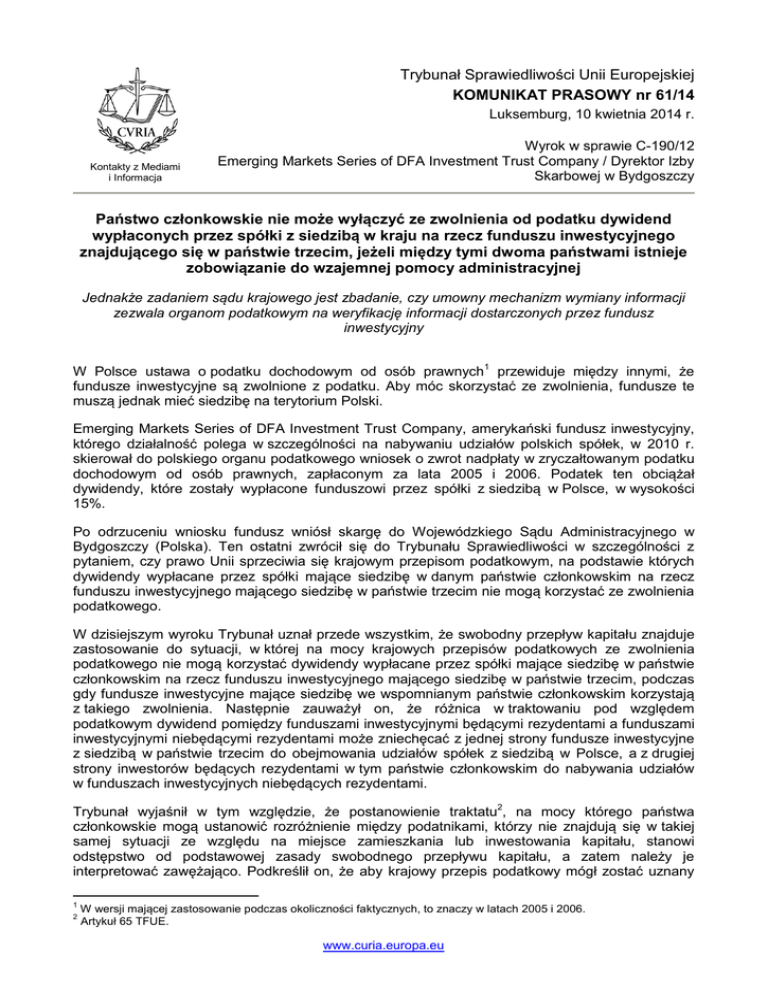 Trybunał Sprawiedliwości Unii Europejskiej KOMUNIKAT PRASOWY nr 61/14 Luksemburg, 10 kwietnia 2014 r. Kontakty z Mediami i Informacja Wyrok w sprawie C-190/12 Emerging Markets Series of DFA Investment Trust Company / Dyrektor Izby Skarbowej w Bydgoszczy Państwo członkowskie nie może wyłączyć ze zwolnienia od podatku dywidend wypłaconych przez spółki z siedzibą w kraju na rzecz funduszu inwestycyjnego znajdującego się w państwie trzecim, jeżeli między tymi dwoma państwami istnieje zobowiązanie do wzajemnej pomocy administracyjnej Jednakże zadaniem sądu krajowego jest zbadanie, czy umowny mechanizm wymiany informacji zezwala organom podatkowym na weryfikację informacji dostarczonych przez fundusz inwestycyjny W Polsce ustawa o podatku dochodowym od osób prawnych1 przewiduje między innymi, że fundusze inwestycyjne są zwolnione z podatku. Aby móc skorzystać ze zwolnienia, fundusze te muszą jednak mieć siedzibę na terytorium Polski. Emerging Markets Series of DFA Investment Trust Company, amerykański fundusz inwestycyjny, którego działalność polega w szczególności na nabywaniu udziałów polskich spółek, w 2010 r. skierował do polskiego organu podatkowego wniosek o zwrot nadpłaty w zryczałtowanym podatku dochodowym od osób prawnych, zapłaconym za lata 2005 i 2006. Podatek ten obciążał dywidendy, które zostały wypłacone funduszowi przez spółki z siedzibą w Polsce, w wysokości 15%. Po odrzuceniu wniosku fundusz wniósł skargę do Wojewódzkiego Sądu Administracyjnego w Bydgoszczy (Polska). Ten ostatni zwrócił się do Trybunału Sprawiedliwości w szczególności z pytaniem, czy prawo Unii sprzeciwia się krajowym przepisom podatkowym, na podstawie których dywidendy wypłacane przez spółki mające siedzibę w danym państwie członkowskim na rzecz funduszu inwestycyjnego mającego siedzibę w państwie trzecim nie mogą korzystać ze zwolnienia podatkowego. W dzisiejszym wyroku Trybunał uznał przede wszystkim, że swobodny przepływ kapitału znajduje zastosowanie do sytuacji, w której na mocy krajowych przepisów podatkowych ze zwolnienia podatkowego nie mogą korzystać dywidendy wypłacane przez spółki mające siedzibę w państwie członkowskim na rzecz funduszu inwestycyjnego mającego siedzibę w państwie trzecim, podczas gdy fundusze inwestycyjne mające siedzibę we wspomnianym państwie członkowskim korzystają z takiego zwolnienia. Następnie zauważył on, że różnica w traktowaniu pod względem podatkowym dywidend pomiędzy funduszami inwestycyjnymi będącymi rezydentami a funduszami inwestycyjnymi niebędącymi rezydentami może zniechęcać z jednej strony fundusze inwestycyjne z siedzibą w państwie trzecim do obejmowania udziałów spółek z siedzibą w Polsce, a z drugiej strony inwestorów będących rezydentami w tym państwie członkowskim do nabywania udziałów w funduszach inwestycyjnych niebędących rezydentami. Trybunał wyjaśnił w tym względzie, że postanowienie traktatu2, na mocy którego państwa członkowskie mogą ustanowić rozróżnienie między podatnikami, którzy nie znajdują się w takiej samej sytuacji ze względu na miejsce zamieszkania lub inwestowania kapitału, stanowi odstępstwo od podstawowej zasady swobodnego przepływu kapitału, a zatem należy je interpretować zawężająco. Podkreślił on, że aby krajowy przepis podatkowy mógł zostać uznany 1 2 W wersji mającej zastosowanie podczas okoliczności faktycznych, to znaczy w latach 2005 i 2006. Artykuł 65 TFUE. www.curia.europa.eu za zgodny z postanowieniami traktatu dotyczącymi swobodnego przepływu kapitału, odmienne traktowanie winno dotyczyć sytuacji, które nie są obiektywnie porównywalne, bądź winno być uzasadnione nadrzędnymi względami interesu ogólnego. Trybunał ocenił, że w odniesieniu do przepisów podatkowych, które jako główne kryterium rozróżnienia utrzymują miejsce siedziby funduszy inwestycyjnych i które z tego względu powodują pobór podatku u źródła od dywidend wypłacanych im przez spółki polskie lub jego brak, fundusze inwestycyjne niebędące rezydentami znajdują się w sytuacji obiektywnie porównywalnej z sytuacją tych, których siedziba znajduje się na terytorium Polski. W odniesieniu do konieczności zapewnienia skuteczności kontroli podatkowych Trybunał uznał, że takie uzasadnienie ograniczenia jest dopuszczalne tylko w wypadku, gdy uregulowania państwa członkowskiego uzależniają przyznanie korzyści podatkowej od spełnienia warunków, których przestrzeganie może zostać zweryfikowane jedynie w drodze uzyskania informacji od właściwych organów państwa trzeciego i gdy z powodu braku umownego zobowiązania do dostarczenia przez to państwo trzecie informacji niemożliwe okazuje się uzyskanie owych informacji od tego ostatniego państwa. Trybunał stwierdził, że w niniejszym wypadku istnieją ramy prawne3 wzajemnej pomocy administracyjnej ustanowione pomiędzy Rzeczpospolitą Polską a Stanami Zjednoczonymi Ameryki umożliwiające wymianę informacji koniecznych do stosowania przepisów podatkowych. Niemniej jednak do sądu krajowego należy zbadanie, czy zobowiązania umowne rzeczywiście umożliwiają polskim organom podatkowym zweryfikowanie, w stosownym wypadku, informacji dostarczonych przez fundusze inwestycyjne z siedzibą na terytorium Stanów Zjednoczonych Ameryki, w celu ustalenia, czy fundusze te prowadzą działalność w ramach regulacyjnych równoważnych z ramami regulacyjnymi Unii. W odniesieniu do konieczności zachowania spójności systemu podatkowego Trybunał wyjaśnił, że aby argument oparty na takim uzasadnieniu mógł być skuteczny, konieczne jest wykazanie bezpośredniego związku pomiędzy daną korzyścią podatkową a wyrównaniem tej korzyści przez określone obciążenie podatkowe, przy czym bezpośredni charakter tego związku należy oceniać z punktu widzenia celu spornej regulacji. W braku takiego bezpośredn