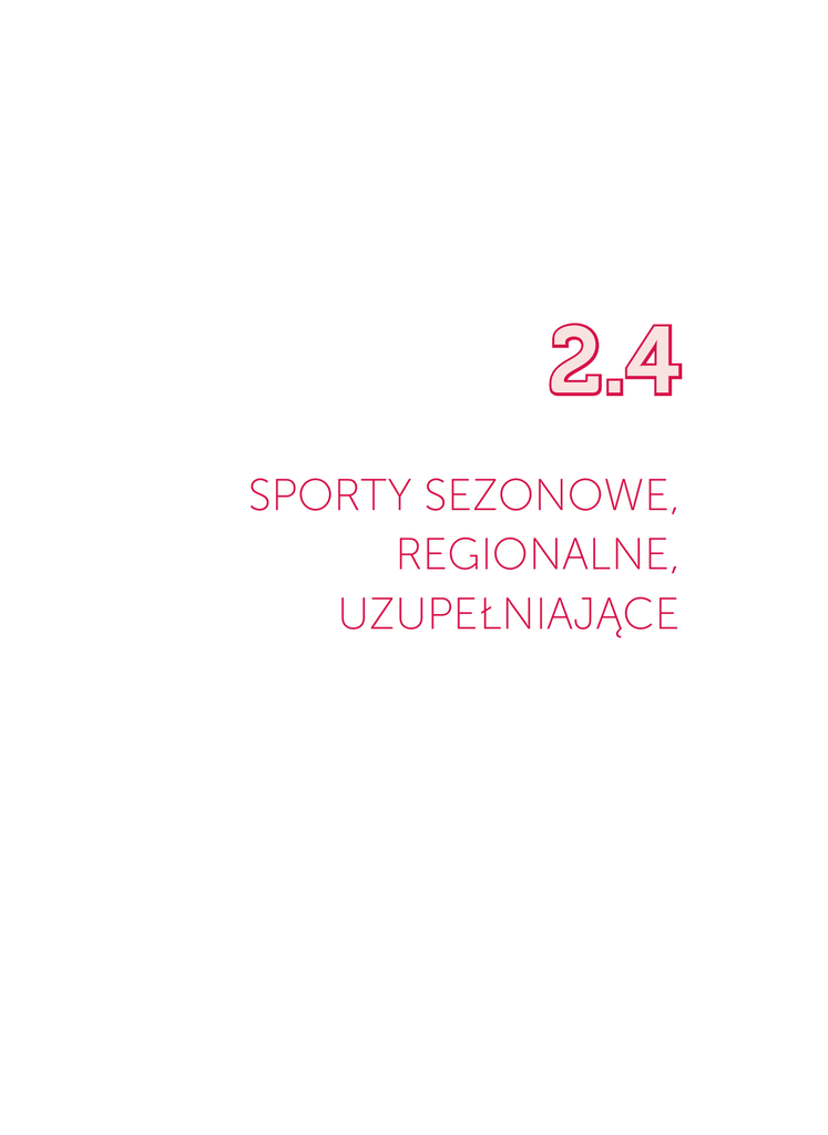 2.4 SPORTY SEZONOWE, REGIONALNE, UZUPEŁNIAJĄCE JUNIORSPORT Pojęcie sporty sezonowe pojawiło się dla wyróżnienia dyscyplin, w których uczestnictwo ograniczone jest porami roku, warunkami geograficznymi oraz bardzo często pogodą. Tradycyjnie przyjęło się rozróżniać sporty letnie i zimowe, chociaż obecnie uczestnictwo w nich często wykracza poza porę roku. Nie należy przy tym utożsamiać sportów sezonowych z każdą aktywnością ruchową wykonywaną latem lub zimą. Granie w piłkę nożną lub siatkówkę latem na powietrzu nie upoważnia do nazywania tych dyscyplin sportami letnimi – nadal będą to gry zespołowe. Podobnie zimowe bieganie po parku nie będzie dyscypliną zimową, ale pozostaje atletyką terenową. Najbardziej charakterystyczną cechą sportów sezonowych jest ich zewnętrzny charakter oraz uzależnienie od odpowiednich warunków pogodowych i terenowych. W tym wszystkim odnajdujemy także miejsce sportów regionalnych, których uprawianie związane jest ze specyfiką miejsca, w którym się znajdujemy czy uwarunkowaniami kulturowymi. Nie oznacza to jednak, że zajęć np. narciarskich nie możemy prowadzić nie mieszkając w górach. Potrzeba uprawiania sportów sezonowych dłużej niż przez parę miesięcy w roku przyczynia się do powstawania coraz to nowych form aktywności imitujących dyscypliny typowo letnie lub zimowe. Dla przykładu deska snowboardowa wymyślona została jako zimowy odpowiednik deski surfingowej, a obecnie dzięki istnieniu różnych typów desek z kółkami, podobne sporty można uprawiać przez cały rok. Z kolei zastosowanie sztucznych nawierzchni zastępujących śnieg pozwoliło na rozgrywanie zawodów narciarskich w warunkach bezśnieżnych nawet latem, a wynalezienie nartorolek umożliwiło jazdę po każdym podłożu. Na tej samej zasadzie substytutem łyżew stały się rolki, które aktualnie są bardziej dostępne i popularniejsze niż ich zimowy pierwowzór. Popularność sportów wodnych i zimowych sprawia, że pojawiają się ciągle nowe konstrukcje, wyzwania i formy ich uprawiania – od tych rekreacyjnych dostępnych dla wszystkich, do ekstremalnych uprawianych przez nielicznych. 154 Blok ten uzupełniają inne dyscypliny sportu stanowiące interesujące alternatywy dla kształtowania sprawności fizycznej. Znalazł się tu „pakiet” tzw. sportów rakietowych oraz bardziej szczegółowe propozycje ze sportów walki. Warto przy tym pamiętać, że we wczesnym etapie kontaktu dzieci ze sportem (tzw. etap szkolenia wszechstronnego), niezależnie od posiadanych predyspozycji czy zainteresowań, należy zaznajamiać podopiecznych z możliwie dużym zasobem ćwiczeń z wielu sportów. Taki wszechstronny rozwój potencjału ruchowego jest bowiem jednym z warunków szeroko rozumianej sprawności fizycznej. Co więcej ćwiczenia proponowane w obrębie danej dyscypliny, w wielu przypadkach bezpośrednio lub po niewielkiej modyfikacji, da się zastosować z powodzeniem w innej.