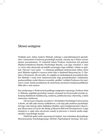 Słowo wstępne Słowo wstępne Wykłady prof. Johna Andrew Slobody, jednego z najwybitniejszych specjalistów i autorytetów światowej psychologii muzyki, cieszyły się w Polsce zawsze dużym powodzeniem. W ostatnich latach Profesor trzykrotnie był gościem Międzywydziałowej Katedry Psychologii Muzyki, a po jego wizytach w 1997 i w 2002 roku ukazywały się książki zawierające Jego wykłady i relacje ze spot kań. Tak jest i tym razem – w niniejszej publikacji zamieszczamy teksty, które prof. Sloboda wygłosił w czerwcu 2006 roku w Akademii Muzycznej im. F. Chopina w Warszawie. Ale nie tylko. Ze względu na niedostępność pozostałych tekstów Slobody i wciąż żywe zainteresowanie Jego przemyśleniami i badaniami, postanowiliśmy wydać zbiorczo wszystkie „polskie” wykłady Profesora z lat 1997, 2002 i 2006. Zanim przejdziemy do omówienia zawartości niniejszej publikacji, kilka słów o nim samym. Syn urodzonego w Wadowicach polskiego emigranta wojennego, Profesor John A. Sloboda, angielski psycholog i muzyk, od ponad 30 lat prowadzi szeroko zakrojoną działalność dydaktyczną, naukową, publicystyczną i edytorską, a także muzyczną i społeczną. Od 1974 jest związany zawodowo z Wydziałem Psychologii Uniwersytetu w Keele, od 1987 jako starszy wykładowca, a od 1991 jako profesor psychologii. Od tego roku kieruje także Zakładem Studiów nad Umiejętnościami i Rozwojem Muzycznym (Unit for the Study of Musical Skill and Development). Z jego inicjatywy w 1996 roku utworzone zostały tu pierwsze w świecie studia magisterskie z psychologii muzyki. Pełnił lub pełni wiele zaszczytnych funkcji. Jest członkiem Brytyjskiego Stowarzyszenia Psychologicznego (British Psychological Society), był prze- Słowo wstępne wodniczącym Sekcji Psychologii oraz Sekcji Ogólnej Brytyjskiego Towarzystwa Postępu w Nauce (British Association for the Advancement of Science), a w latach 1994–97 przewodniczącym ESCOM – Europejskiego Stowarzyszenia Nauk Poznawczych w Muzyce (European Society for the Cognitive Sciences of Music). Zasiada w komitetach redakcyjnych najbardziej liczących się czasopism poświęconych problematyce psychologii muzyki, tj. Musicae Scientiae (czasopisma wydawanego przez ESCOM) i Psychology of Music, jak również Psychology Teaching Review. W 1998 roku otrzymał nagrodę Prezesa Brytyjskiego Towarzystwa Psychologicznego za znaczący wkład do rozwoju nauk psychologicznych. W 2004 roku został członkiem Brytyjskiej Akademii, a w czerwcu 2006 roku wybrano go na członka honorowego Royal College of Music w Londynie. Jest autorem, redaktorem lub współredaktorem ponad 100 publikacji, m.in. The Musical Mind (1985), Generative Processes in Music (1987), Musical Perception (1994), Musical Beginnings (1996), Perception and Cognition of Music (1997, współautorka I. Deliège), Music and Emotion (2001, współredakcja P. Juslin), Exploring the Musical Mind (2004), Psychology for Musicians: Under standing and Acquiring the Skills (współautorzy A. Lehmann i R. Woody). Jego ostatnia książka z 2007 roku Beyond Terror. The Truth About The Real Threats To Our World związana jest z innym obszarem zainteresowań – Profesor Sloboda prowadzi bowiem od wielu lat aktywną działalność społeczno-polityczną, głosząc antywojenne przekonania. Należy do Oksfordzkiej Grupy Badawczej (Oxford Research Group – ORS), niezależnej, pozarządowej organizacji powstałej w 1982 roku, która dąży do wypracowania, w oparciu o badania naukowe, skutecznych metod pokojowego rozwiązywania konfliktów światowych. Profesor Sloboda od 2004 roku pełni tam funkcję dyrektora wykonawczego. Obecna działalność ORS koncentruje się na problemie nierozprzestrzeniania broni nuklearnej, na wojnie z terroryzmem, polityce bezpieczeństwa Wielkiej Brytanii. J. Sloboda kształcił się muzycznie w londyńskiej Royal Academy of Music. W latach 1975–1995 prowadził Keele Bach Choir, którego jest obecnie prezesem. Działał także jako pianista-akompaniator oraz kompozytor. Międzywydziałowa Katedra Psychologii Muzyki AMFC jak do tej pory – poza klasyczną monografią należącą do kanonu literatury naukowej w dziedzinie psychologii muzyki z 1985 roku Umysł Muzyczny. Poznawcza psychologia muzyki (The Music Mind: The Cognitive Psychology of Music), która ukazała się w 2002 roku – wydała dwie publikacje z wykładami prof. Slobody: Poznanie, emocje i wykonanie. Trzy wykłady z psychologii muzyki (1999) oraz Wy- Słowo wstępne zwania i możliwości psychologii muzyki w ujęciu Johna A. Slobody (2005). Niniejsza książka zawiera poprawione wersje następujących wykładów: 1) W jaki sposób psychologia pomaga zrozumieć i kształcić wykonawców?; 2) Emocje i znaczenia w przekazie muzycznym – perspektywy psychologiczne; 3) „Umysł muzyczny” po 15 latach – jak rozwijała się psychologia muzyki po roku 1980?; 4) Wyzwania stojące przed psychologią muzyki oraz możliwości jej zastosowań; 5) Doświadczenia muzyczne; oraz dwa nowe, będące plonem ostatniej wizyty Profesora w Polsce: 6) Mozart w psychologii; 7) Psychologia autodiagnozy głuchoty muzycznej. Wszystkie razem prezentują problematykę stanowiącą główny obszar Jego zainteresowań badawczych. A jest on bardzo rozległy: Profesor w różnych okresach swojej pracy naukowej koncentrował się na zagadnieniach związanych z percepcją, z psychologicznymi aspektami wykonawstwa muzycznego, podstawami uczenia się i nauczania, wyznacznikami powodzenia w edukacji muzycznej, reakcjami emocjonalnymi na muzykę, funkcją muzyki w życiu codziennym. W ostatnich latach prof. Sloboda skupił się na badaniach uwarunkowań i przyczyn poczucia bycia niemuzykalnym oraz niskiej samooceny zdolności i umiejętności muzycznych (co – według niego – charakteryzuje znaczną część populacji i jest wynikiem specyficznych zasad funkcjonowania zachodniej kultury muzycznej), a także zjawiska amuzji. Wyrazem tych 