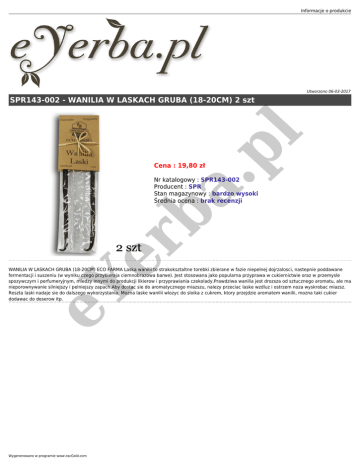 Informacje o produkcie Utworzono 06-03-2017 a. pl SPR143-002 - WANILIA W LASKACH GRUBA (18-20CM) 2 szt Cena : 19,80 zł er b Nr katalogowy : SPR143-002 Producent : SPR Stan magazynowy : bardzo wysoki Średnia ocena : brak recenzji eY WANILIA W LASKACH GRUBA (18-20CM) ECO FARMA Laska wanilii to strakoksztaltne torebki zbierane w fazie niepelnej dojrzalosci, nastepnie poddawane fermentacji i suszeniu (w wyniku czego przybieraja ciemnobrazowa barwe). Jest stosowana jako popularna przyprawa w cukiernictwie oraz w przemysle spozywczym i perfumeryjnym, miedzy innymi do produkcji likierow i przyprawiania czekolady.Prawdziwa wanilia jest drozsza od sztucznego aromatu, ale ma nieporownywanie silniejszy i pelniejszy zapach.Aby dostac sie do aromatycznego miazszu, nalezy przeciac laske wzdluz i ostrzem noza wyskrobac miazsz. Reszta laski nadaje sie do dalszego wykorzystania. Mozna laske wanilii wlozyc do sloika z cukrem, ktory przejdzie aromatem wanilii, mozna taki cukier dodawac do deserow itp. Wygenerowano w programie www.oscGold.com