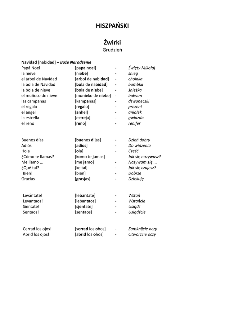HISZPAŃSKI Żwirki Grudzień Navidad [nabidad] – Boże Narodzenie Papá Noel [papa noel] la nieve [niebe] el árbol de Navidad [arbol de nabidad] la bola de Navidad [bola de nabidad] la bola de nieve [bola de niebe] el muñeco de nieve [munieko de niebe] las campanas [kampanas] el regalo [regalo] el ángel [anhel] la estrella [estreja] el reno [reno] - Święty Mikołaj śnieg choinka bombka śnieżka bałwan dzwoneczki prezent aniołek gwiazda renifer Buenos días Adiós Hola ¿Cómo te llamas? Me llamo ... ¿Qué tal? ¡Bien! Gracias [buenos dijas] [adios] [ola] [komo te jamas] [me jamo] [ke tal] [bien] [grasjas] - Dzień dobry Do widzenia Cześć Jak się nazywasz? Nazywam się ... Jak się czujesz? Dobrze Dziękuję ¡Levántate! ¡Levantaos! ¡Siéntate! ¡Sentaos! [lebantate] [lebantaos] [sjentate] [sentaos] - Wstań Wstańcie Usiądź Usiądźcie ¡Cerrad los ojos! ¡Abrid los ojos! [serrad los ohos] [abrid los ohos] - Zamknijcie oczy Otwórzcie oczy
