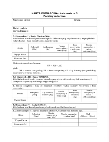 KARTA POMIAROWA - ćwiczenie nr 5 Pomiary radarowe Nazwisko i