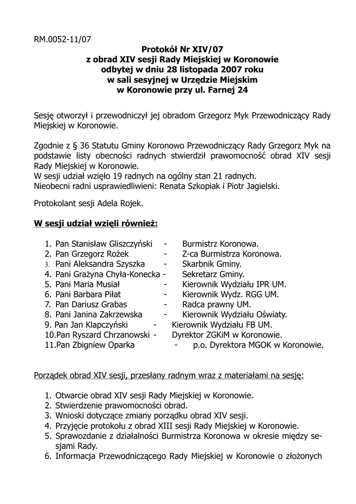 RM.0052-11/07 Protokół Nr XIV/07 z obrad XIV sesji Rady Miejskiej w Koronowie odbytej w dniu 28 listopada 2007 roku w sali sesyjnej w Urzędzie Miejskim w Koronowie przy ul. Farnej 24 Sesję otworzył i przewodniczył jej obradom Grzegorz Myk Przewodniczący Rady Miejskiej w Koronowie. Zgodnie z § 36 Statutu Gminy Koronowo Przewodniczący Rady Grzegorz Myk na podstawie listy obecności radnych stwierdził prawomocność obrad XIV sesji Rady Miejskiej w Koronowie. W sesji udział wzięło 19 radnych na ogólny stan 21 radnych. Nieobecni radni usprawiedliwieni: Renata Szkopiak i Piotr Jagielski. Protokolant sesji Adela Rojek. W sesji udział wzięli również: 1. Pan Stanisław Gliszczyński 2. Pan Grzegorz Rożek 3. Pani Aleksandra Szyszka 4. Pani Grażyna Chyła-Konecka 5. Pani Maria Musiał 6. Pani Barbara Piłat 7. Pan Dariusz Grabas 8. Pani Janina Zakrzewska 9. Pan Jan Klapczyński 10.Pan Ryszard Chrzanowski 11.Pan Zbigniew Oparka - Burmistrz Koronowa. Z-ca Burmistrza Koronowa. Skarbnik Gminy. Sekretarz Gminy. Kierownik Wydziału IPR UM. Kierownik Wydz. RGG UM. Radca prawny UM. Kierownik Wydziału Oświaty. Kierownik Wydziału FB UM. Dyrektor ZGKiM w Koronowie. p.o. Dyrektora MGOK w Koronowie. Porządek obrad XIV sesji, przesłany radnym wraz z materiałami na sesję: 1. 2. 3. 4. 5. Otwarcie obrad XIV sesji Rady Miejskiej w Koronowie. Stwierdzenie prawomocności obrad. Wnioski dotyczące zmiany porządku obrad XIV sesji. Przyjęcie protokołu z obrad XIII sesji Rady Miejskiej w Koronowie. Sprawozdanie z działalności Burmistrza Koronowa w okresie między sesjami Rady. 6. Informacja Przewodniczącego Rady Miejskiej w Koronowie o złożonych 2 interpelacjach i udzielonych odpowiedziach. 7. Składanie interpelacji. 8. Zapytania, wolne wnioski i informacje. 9. Rozpatrzenie projektu uchwały zmieniającej Uchwałę Nr IV/29/07 Rady Miejskiej w Koronowie w sprawie uchwalenia budżetu gminy na 2007 rok. 10.Wręczenie podziękowań osobom biorącym udział w niesieniu pomocy poszkodowanym w wyniku katastrofy w Tryszczynie. 11. Rozpatrzenie projektu uchwały w sprawie zabezpieczenia środków budżetowych na realizację zadania pn.: „Opracowanie projektu budowlano-wykonawczego budowy ścieżki pieszo-rowerowej i chodnika Tryszczyn - Wtelno”. 12. Rozpatrzenie projektu uchwały w sprawie zaciągnięcia kredytu bankowego na realizację zadania pn. „Hala sportowo-widowiskowa w Koronowie”. 13.Rozpatrzenie projektu uchwały w sprawie Statutu Gminy Koronowo. 14.Rozpatrzenie projektu uchwały w sprawie: „Wieloletniego programu gospodarowania mieszkaniowym zasobem Gminy Koronowo na lata 2008 – 2012”. 15.Rozpatrzenie projektu uchwały w sprawie zmiany uchwały ustalającej zasady gospodarowania nieruchomościami na terenie Gminy Koronowo. 16.Rozpatrzenie projektu uchwały w sprawie w sprawie zmiany regulaminu udzielania pomocy materialnej o charakterze socjalnym dla uczniów zamieszkałych na terenie Gminy Koronowo. 17. Rozpatrzenie projektu uchwały w sprawie w sprawie wyrażenia zgody na zawarcie porozumienia z Miastem Zielona Góra w zakresie realizacji projektu „Centra kształcenia na odległość na wsiach”. 18.Rozpatrzenie projektu uchwały w sprawie miejscowego planu zagospodarowania terenu w Gościeradzu przy drodze krajowej nr 25. 19.Rozpatrzenie projektu uchwały w sprawie miejscowego planu zagospodarowania terenu w Okolu przy drodze krajowej nr 25. 20.Rozpatrzenie projektu uchwały w sprawie przystąpienia do sporządzenia zmian terenu w Pieczyskach. 21.Rozpatrzenie projektu uchwały w sprawie przystąpienia do sporządzenia zmian terenu w Tryszczynie – Morzewcu. 22.Rozpatrzenie projektu uchwały w sprawie współpracy między Gminą Koronowo a niemiecką Gminą Senden oraz kontynuacji współpracy z włoską Gminą Spinetoli oraz z Samorządem Rejonu Wileńskiego. 23.Rozpatrzenie projektu uchwały w sprawie wyrażenia woli przystąpienia Gminy Koronowo do tworzenia Stowarzyszenia Lokalnej Grupy Działania pn. „Trzy Doliny”. 24.Rozpatrzenie projektu uchwały w sprawie obniżenia ceny skupu żyta do celów wymiaru podatku rolnego. 3 25.Rozpatrzenie projektu uchwały w sprawie określenia wysokości stawek podatku od środków transportowych i zwolnień w tym podatku. 26. Rozpatrzenie projektu uchwały w sprawie trybu i szczegółowych warunków zwolnienia od podatku rolnego użytków rolnych, na których zaprzestano produkcji rolnej. 27. Rozpatrzenie projektu uchwały w sprawie wyrażenia opinii dotyczącej uchwały Nr XII/74/07 Rady Gminy Sośno z dnia 25 października 2007 r. w sprawie przyjęcia i zaopiniowania projektu uchwały w sprawie zmiany uchwały o likwidacji Gminnego Zakładu Opieki Zdrowotnej w Sośnie. 28.Rozpatrzenie projektu uchwały w sprawie nadania nazw ulicom we Wtelnie. 29.Informacja z działalności Zakładu Gospodarki Komunalnej i Mieszkaniowej w Koronowie oraz o przygotowaniu Zakładu do sezonu zimowego. 30.Informacja z działalności Miejsko - Gminnego Ośrodka Kultury w Koronowie. 31.Odpowiedzi na interpelacje, wnioski i zapytania. 32.Zamknięcie obrad XIV sesji. Ad. 1. Otwarcie obrad XIV sesji Rady Miejskiej w Koronowie. Obrady XIV sesji Rady Miejskiej w Koronowie otworzył Przewodniczący Rady Grzegorz Myk. Przewodniczący Rady powitał wszystkich przybyłych na obrady XIV sesji Rady Miejskiej w Koronowie. Ad. 2. Stwierdzenie prawomocności obrad XIV sesji. Na podstawie listy obecności Przewodniczący Rady Grzegorz Myk stwierdził prawomocność obrad XIV sesji Rady Miejskiej w Koronowie. W sesji udział wzięło 19 radnych na ogólny stan 21 radnych. Nieobecni radni usprawiedliwieni: Renata Szkopiak i Piotr Jagielski. Listę obecności radnych dołączono do protokołu z obrad sesji. Ad. 3. Wnioski dotyczące zmiany porządku obrad XIV sesji. Przewodniczący Rady Grzegorz Myk – Czy ktoś ma propozycję zmian porządku obrad dzisiejszej sesji? Radny Marian Kuropatwiński – W imieniu Komisji Statutowej wnoszę o zdjęcie z porządku o