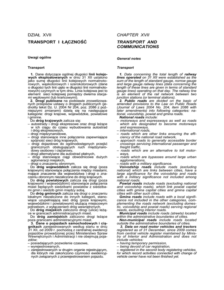 DZIAŁ XVII CHAPTER XVII TRANSPORT I ŁĄCZNOŚĆ TRANSPORT AND COMMUNICATIONS Uwagi ogólne General notes Transport Transport 1. Dane dotyczące ogólnej długości linii kolejowych eksploatowanych w dniu 31 XII ustalono jako sumę długości linii kolejowych normalnotorowych, wąskotorowych i szerokotorowych (dane o długości tych linii ujęto w długości linii normalnotorowych) czynnych w tym dniu. Linia kolejowa jest to element sieci kolejowej pomiędzy dwiema stacjami węzłowymi (lub krańcowymi). 2. Drogi publiczne na podstawie znowelizowanych przepisów ustawy o drogach publicznych (jednolity tekst Dz. U. 2004 Nr 204, poz. 2086 z poźniejszymi zmianami) dzielą się na następujące kategorie: drogi krajowe, wojewódzkie, powiatowe i gminne. Do dróg krajowych zalicza się: – autostrady i drogi ekspresowe oraz drogi leżące w ich ciągu do czasu wybudowania autostrad i dróg ekspresowych, – drogi międzynarodowe, – drogi stanowiące inne połączenia zapewniające spójność sieci dróg krajowych, – drogi dojazdowe do ogólnodostępnych przejść granicznych obsługujących ruch międzynarodowy osobowy i ciężarowy, – drogi alternatywne dla autostrad płatnych, – drogi stanowiące ciągi obwodnicowe dużych aglomeracji miejskich, – drogi o znaczeniu obronnym. Do dróg wojewódzkich zalicza się drogi (poza krajowymi) stanowiące połączenia między miastami, mające znaczenie dla województwa i drogi o znaczeniu obronnym niezaliczone do dróg krajowych. Do dróg powiatowych zalicza się drogi (poza krajowymi i wojewódzkimi) stanowiące połączenia miast będących siedzibami powiatów z siedzibami gmin i siedzib gmin między sobą. Do dróg gminnych zalicza się drogi o znaczeniu lokalnym niezaliczone do innych kategorii, stanowiące uzupełniającą sieć dróg (poza krajowymi, wojewódzkimi i powiatowymi) służącą miejscowym potrzebom, z wyłączeniem dróg wewnętrznych. Do dróg miejskich zaliczono drogi (ulice) leżące w granicach administracyjnych miast. Do dróg zamiejskich zaliczono drogi leżące poza granicami administracyjnymi miast. 3. Dane o pojazdach samochodowych i ciągnikach zarejestrowanych według stanu w dniu 31 XII, od 2009 r. pochodzą z centralnej ewidencji pojazdów prowadzonej przez Ministerstwo Spraw Wewnętrznych i Administracji i nie obejmują pojazdów: – posiadających pozwolenie czasowe, – wyrejestrowanych, – zarejestrowanych w drugim organie rejestrującym, dla których nie zakończono czynności ewidencyjnych związanych z przerejestrowaniem pojazdu. 1. Data concerning the total length of railway lines operated on 31 XII were established as the sum of the length of standard gauge, norrow gauge and large gauge railway lines (data concerning the length of these lines are given in terms of standard gauge lines) operating on that day. The railway line is an element of the rail network between two junction stations (or terminal stations). 2. Public roads are divided on the basic of amended provisions to the Law on Public Roads (Journal of Laws 2004 No. 204, item 2086 with later amendments) into following categories: national, voivodship, powiat and gmina roads. National roads include: – motorways and expressways as well as roads which are designated to become motorways and expressways, – international roads, – roads which are other links ensuring the efficiency of the national road network, – approach roads to generally accessible border crossings servicing international passenger and freight traffic, – roads which are an alternative to toll motorways, – roads which are bypasses around large urban agglomerations, – roads with a military significance. Voivodship roads include roads (excluding national) which are links between cities, have a large significance for the voivodship and roads with a military significance not included among national roads. Powiat roads include roads (excluding national and voivodship roads), which link powiat capital cities with gmina capital cities and gmina capital cities with other such cities. Gmina roads include roads with a local significance not included in the other categories, complementing the roads network (excluding domestic, voivodship and powiat roads) serving regional needs, excluding interior roads. Municipal roads include roads (streets) located within the administrative boundaries of cities. Non-municipal roads include roads located outside the administrative boundaries of cities. 3. Data on road motor vehicles and tractors registered as of 31 December, since 2009 comes from central vehicle register maintained by Ministry of Interior and Administration and does not include vehicles: – having temporary permission, – being devoid of car registration, – registered in the second body registering vehicles, for which record activities connected with change of vehicle owner have not been finished yet. TRANSPORT AND COMMUNICATIONS 317 Do 2001 r. dane o pojazdach samochodowych i ciągnikach pochodziły z ewidencji prowadzonych przez wojewodów. W latach 2002-2008 dane dotyczące pojazdów samochodowych i ciągników pozyskiwane były z ewidencji prowadzonych przez starostów, prezydentów miast i burmistrzów, przy czym w latach 2004-2008 – z systemu „POJAZD” służącego do rejestracji pojazdów w organach rejestrujących pojazdy. 4. Linia autobusowa jest stałym połączeniem drogowym dwóch krańcowych miejscowości oraz wybranych miejscowości pośrednich przy użyciu jednego lub kilku autobusów regularnie kursujących między tymi miejscowościami według ogłoszonego rozkładu. Długość linii autobusowej jest to długość trasy w km pomiędzy dwiema krańcowymi miejscowościami niezależnie od ilości kursów autobusowych odbywających się na tej linii. 5. Transport samochodowy zarobkowy obejmuje podmioty, w których usługi transportu samochodowego stanowią podstawową działalność gospodarczą, z tym że dane o przewozach pasażerów nie obejmu