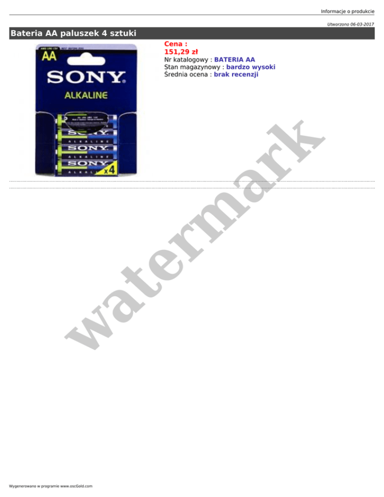 Informacje o produkcie Utworzono 06-03-2017 Bateria AA paluszek 4 sztuki Cena : 151,29 zł w at er m ar k Nr katalogowy : BATERIA AA Stan magazynowy : bardzo wysoki Średnia ocena : brak recenzji Wygenerowano w programie www.oscGold.com