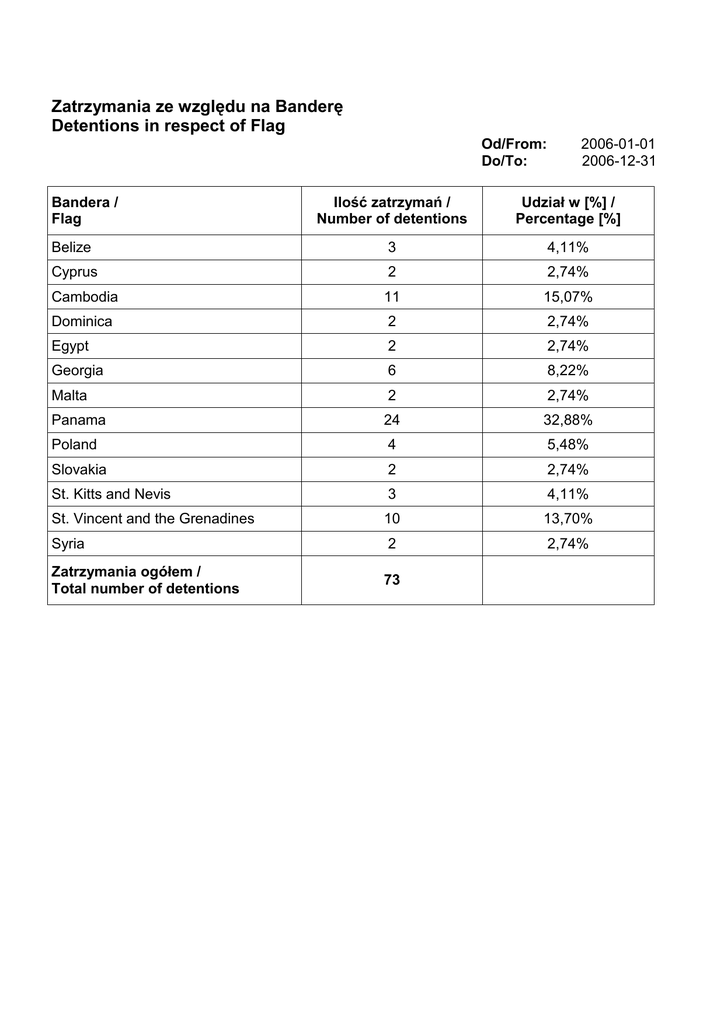 Zatrzymania ze względu na Banderę Detentions in respect of Flag Od/From: Do/To: 2006-01-01 2006-12-31 Ilość zatrzymań / Number of detentions Udział w [%] / Percentage [%] Belize 3 4,11% Cyprus 2 2,74% Cambodia 11 15,07% Dominica 2 2,74% Egypt 2 2,74% Georgia 6 8,22% Malta 2 2,74% Panama 24 32,88% Poland 4 5,48% Slovakia 2 2,74% St. Kitts and Nevis 3 4,11% St. Vincent and the Grenadines 10 13,70% Syria 2 2,74% Zatrzymania ogółem / Total number of detentions 73 Bandera / Flag
