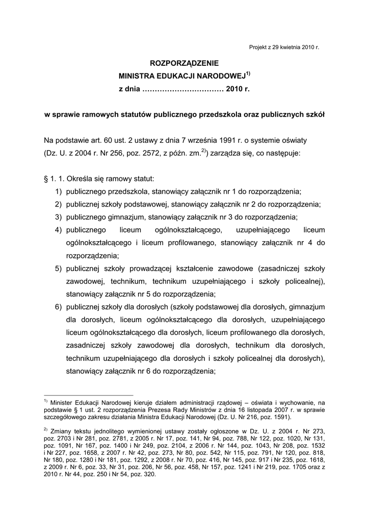 Projekt z 29 kwietnia 2010 r. ROZPORZĄDZENIE MINISTRA EDUKACJI NARODOWEJ1) z dnia …………………………… 2010 r. w sprawie ramowych statutów publicznego przedszkola oraz publicznych szkół Na podstawie art. 60 ust. 2 ustawy z dnia 7 września 1991 r. o systemie oświaty (Dz. U. z 2004 r. Nr 256, poz. 2572, z późn. zm.2)) zarządza się, co następuje: § 1. 1. Określa się ramowy statut: 1) publicznego przedszkola, stanowiący załącznik nr 1 do rozporządzenia; 2) publicznej szkoły podstawowej, stanowiący załącznik nr 2 do rozporządzenia; 3) publicznego gimnazjum, stanowiący załącznik nr 3 do rozporządzenia; 4) publicznego liceum ogólnokształcącego, uzupełniającego liceum ogólnokształcącego i liceum profilowanego, stanowiący załącznik nr 4 do rozporządzenia; 5) publicznej szkoły prowadzącej kształcenie zawodowe (zasadniczej szkoły zawodowej, technikum, technikum uzupełniającego i szkoły policealnej), stanowiący załącznik nr 5 do rozporządzenia; 6) publicznej szkoły dla dorosłych (szkoły podstawowej dla dorosłych, gimnazjum dla dorosłych, liceum ogólnokształcącego dla dorosłych, uzupełniającego liceum ogólnokształcącego dla dorosłych, liceum profilowanego dla dorosłych, zasadniczej szkoły zawodowej dla dorosłych, technikum dla dorosłych, technikum uzupełniającego dla dorosłych i szkoły policealnej dla dorosłych), stanowiący załącznik nr 6 do rozporządzenia; 1) Minister Edukacji Narodowej kieruje działem administracji rządowej – oświata i wychowanie, na podstawie § 1 ust. 2 rozporządzenia Prezesa Rady Ministrów z dnia 16 listopada 2007 r. w sprawie szczegółowego zakresu działania Ministra Edukacji Narodowej (Dz. U. Nr 216, poz. 1591). 2) Zmiany tekstu jednolitego wymienionej ustawy zostały ogłoszone w Dz. U. z 2004 r. Nr 273, poz. 2703 i Nr 281, poz. 2781, z 2005 r. Nr 17, poz. 141, Nr 94, poz. 788, Nr 122, poz. 1020, Nr 131, poz. 1091, Nr 167, poz. 1400 i Nr 249, poz. 2104, z 2006 r. Nr 144, poz. 1043, Nr 208, poz. 1532 i Nr 227, poz. 1658, z 2007 r. Nr 42, poz. 273, Nr 80, poz. 542, Nr 115, poz. 791, Nr 120, poz. 818, Nr 180, poz. 1280 i Nr 181, poz. 1292, z 2008 r. Nr 70, poz. 416, Nr 145, poz. 917 i Nr 235, poz. 1618, z 2009 r. Nr 6, poz. 33, Nr 31, poz. 206, Nr 56, poz. 458, Nr 157, poz. 1241 i Nr 219, poz. 1705 oraz z 2010 r. Nr 44, poz. 250 i Nr 54, poz. 320. 7) publicznej szkoły specjalnej przysposabiającej do pracy dla uczniów z upośledzeniem umysłowym w stopniu umiarkowanym lub znacznym oraz dla uczniów z niepełnosprawnościami sprzężonymi, stanowiący załącznik nr 7 do rozporządzenia. 2. Ramowy statut, o którym mowa w ust. 1 pkt 1, stosuje się w publicznych ogólnodostępnych, integracyjnych i specjalnych przedszkolach oraz odpowiednio w oddziałach przedszkolnych zorganizowanych w szkołach podstawowych. 3. Ramowy statut, o którym mowa w ust. 1 pkt 2, stosuje się w publicznych ogólnodostępnych, integracyjnych, specjalnych, sportowych i mistrzostwa sportowego szkołach podstawowych dla dzieci i młodzieży. 4. Ramowy statut, o których mowa w ust. 1 pkt 3, stosuje się w publicznych ogólnodostępnych, integracyjnych, specjalnych, sportowych, mistrzostwa sportowego i dwujęzycznych gimnazjach dla dzieci i młodzieży. 5. Ramowy statut, o którym mowa w ust. 1 pkt 4, stosuje się w publicznych ogólnodostępnych, integracyjnych, specjalnych, sportowych, mistrzostwa sportowego i dwujęzycznych liceach ogólnokształcących, uzupełniających liceach ogólnokształcących i liceach profilowanych dla dzieci i młodzieży. 6. Ramowy statut, o którym mowa w ust. 1 pkt 5, stosuje się w publicznych ogólnodostępnych, integracyjnych i specjalnych zasadniczych szkołach zawodowych, technikach, technikach uzupełniających i szkołach policealnych, dla dzieci i młodzieży. 7. Ramowy statut, o którym mowa w ust. 1 pkt 6, stosuje się w publicznych szkołach podstawowych dla dorosłych, gimnazjach dla dorosłych, liceach ogólnokształcących dla dorosłych, uzupełniających liceach ogólnokształcących dla dorosłych, liceach profilowanych dla dorosłych, zasadniczych szkołach zawodowych dla dorosłych, technikach dla dorosłych, technikach uzupełniających dla dorosłych i szkołach policealnych dla dorosłych. 8. Ramowy statut, o którym mowa w ust. 1 pkt 7, stosuje się w publicznych szkołach specjalnych przysposabiających do pracy dla uczniów z upośledzeniem umysłowym w stopniu umiarkowanym lub znacznym oraz dla uczniów z niepełnosprawnościami sprzężonymi. § 2.1. Przedszkola i szkoły, o których mowa w § 1 ust. 1, dostosują statuty do wymogów wynikających z niniejszego rozporządzenia, w terminie do dnia 15 marca 2011 r., z zastrzeżeniem ust. 2 i 3. 2. Przedszkola i szkoły, o których mowa w § 1 ust. 1, dostosują nazwę przedszkola i szkoły, a także nazwę przedszkola i szkoły umieszczaną na tablicy urzędowej oraz na pieczęciach urzędowych, w terminie do dnia 31 grudnia 2012 r. 3. Przepisy ramowych statutów, o których mowa w § 1 ust. 1, dotyczące arkusza organizacji przedszkola i szkoły stosuje się do ustalenia i zatwierdzenia arkuszy organizacji przedszkoli i szkół poczynając od roku szkolnego 2011/2012. § 3. Traci moc rozporządzenie Ministra Edukacji Narodowej z dnia 21 maja 2001 r. w sprawie ramowych statutów publicznego przedszkola oraz publicznych szkół (Dz. U. Nr 61, poz. 624, z późn. zm.3)). § 4. Rozporządzenie wchodzi w życie z dniem 1 września 2010 r. 3) Zmiany tekstu wymienionego rozporządzenia zostały ogłoszone w Dz. U. z 2002 r. Nr 10, poz. 96, z 2003 r. Nr 146, poz. 1416, z 2004 r. Nr 66, poz. 606, z 2005 r. Nr 10, poz. 75 oraz z 2007 r. Nr 35, poz. 222.