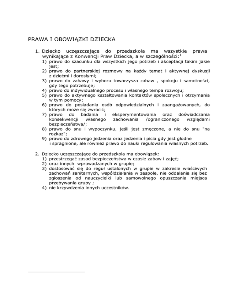 PRAWA I OBOWIĄZKI DZIECKA 1. Dziecko uczęszczające do przedszkola ma wszystkie wynikające z Konwencji Praw Dziecka, a w szczególności:1 prawa 1) prawo do szacunku dla wszystkich jego potrzeb i akceptacji takim jakie jest; 2) prawo do partnerskiej rozmowy na każdy temat i aktywnej dyskusji z dziećmi i dorosłymi; 3) prawo do zabawy i wyboru towarzysza zabaw , spokoju i samotności, gdy tego potrzebuje; 4) prawo do indywidualnego procesu i własnego tempa rozwoju; 5) prawo do aktywnego kształtowania kontaktów społecznych i otrzymania w tym pomocy; 6) prawo do posiadania osób odpowiedzialnych i zaangażowanych, do których może się zwrócić; 7) prawo do badania i eksperymentowania oraz doświadczania konsekwencji własnego zachowania /ograniczonego względami bezpieczeństwa/; 8) prawo do snu i wypoczynku, jeśli jest zmęczone, a nie do snu "na rozkaz"; 9) prawo do zdrowego jedzenia oraz jedzenia i picia gdy jest głodne i spragnione, ale również prawo do nauki regulowania własnych potrzeb. 2. Dziecko uczęszczające do przedszkola ma obowiązek: 1) przestrzegać zasad bezpieczeństwa w czasie zabaw i zajęć; 2) oraz innych wprowadzanych w grupie; 3) dostosować się do reguł ustalonych w grupie w zakresie właściwych zachowań sanitarnych, współdziałania w zespole, nie oddalania się bez zgłoszenia od nauczycielki lub samowolnego opuszczania miejsca przebywania grupy ; 4) nie krzywdzenia innych uczestników.
