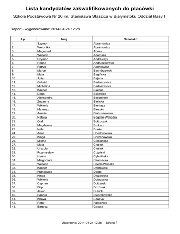 Lista kandydatów zakwalifikowanych do placówki Szkoła Podstawowa Nr 26 im. Stanisława Staszica w Białymstoku Oddział klasy I Raport - wygenerowano: 2014-04-24 12:28 Lp. 1. 2. 3. 4. 5. 6. 7. 8. 9. 10. 11. 12. 13. 14. 15. 16. 17. 18. 19. 20. 21. 22. 23. 24. 25. 26. 27. 28. 29. 30. 31. 32. 33. 34. 35. 36. 37. 38. 39. 40. 41. 42. 43. Imię Szymon Weronika Magomed Wiktoria Szymon Hanna Patryk Marcel Maja Julia Gabriel Michalina Kacper Daria Aleksandra Zuzanna Wiktoria Mateusz Amelia Natalia Olaf Magdalena Nela Anna Kinga Milena Maja Urszula Przemysław Hanna Małgorzata Wiktoria Kacper Franciszek Kinga Wiktoria Cyprian Filip Jakub Sandra Khava Rafał Bartosz Nazwisko Abramowicz Abramowicz Abuev Adamska Andrelczyk Andruszkiewicz Aponiewicz Bachórzewski Bagińska Bajena Bartoszewicz Bartoszewicz Białous Bielawiec Bieleninnik Bielicka Bieniasz Bleszko Błahuszewska Bogdan-Waligóra Bołtruczyk Brukarz Buńko Chodorowska Chrzanowska Ciesiuńska Cieśluk Cieśluk Ciżyński Cybulińska Czarnecka Czech-Wilińska Dąbrowski Depta Dłużewska Dobrzycka Dołżyński Drożniak Dubicki Dworakowska Edaeva Falaciński Gacuta Utworzono: 2014-04-24 12:28 Strona 1 Lista kandydatów zakwalifikowanych do placówki Szkoła Podstawowa Nr 26 im. Stanisława Staszica w Białymstoku Oddział klasy I 44. 45. 46. 47. 48. 49. 50. 51. 52. 53. 54. 55. 56. 57. 58. 59. 60. 61. 62. 63. 64. 65. 66. 67. 68. 69. 70. 71. 72. 73. 74. 75. 76. 77. 78. 79. 80. 81. 82. 83. 84. 85. 86. 87. 88. 89. 90. Marek Amelia Karolina Krzysztof Milena Maciej Julia Franciszek Maksymilian Yacine Krzysztof Martyna Xavier Amelia Oskar Kacper Miłosz Weronika Michał JAKUB Bartosz Amina Aleksandra Michał Miłosz Katarzyna Jan Norbert Maja Adam Paulina Kamil Dawid Adam Zuzanna Emilia Rafał Julian Małgorzata Michał Wiktor Weronika Hanna Ewa Krzysztof Weronika Julian Kacper Gaiński Galicka Gawinowicz Godlewski Gołębiewska Góral Górska Grochowski Gudalewski Hadouelhadj Iwaniuk Jacewicz Jewiak Jeżewska Jeżowski Kamieński Kapuściński Karczewska Kazberuk KAZUCZYK Kendra Khabilyaeva Kierska Klikowski Kopciewski Krajewska Król Krysztopowicz Kucikowicz Kulfan Kunicka Kupryjanowicz Lech Leszczuk Leszczyńska Lewczuk Linkowski Łabanowski Łupińska Łupiński Majstrowicz Maksymiuk Malesińska Małyszko Marat Marculewicz Martyniuk Utworzono: 2014-04-24 12:28 Strona 2 Lista kandydatów zakwalifikowanych do placówki Szkoła Podstawowa Nr 26 im. Stanisława Staszica w Białymstoku Oddział klasy I 91. 92. 93. 94. 95. 96. 97. 98. 99. 100. 101. 102. 103. 104. 105. 106. 107. 108. 109. 110. 111. 112. 113. 114. 115. 116. 117. 118. 119. 120. 121. 122. 123. 124. 125. 126. 127. 128. 129. 130. 131. 132. 133. 134. 135. 136. 137. Oliwier Piotr Kacper Weronika Kacper Dominik Jakub Adam Melania Kinga Julia Wiktor Sebastian Laura Damian Zofia Maciej Oliwia TOMASZ Maksymilian Klaudia Tomasz Hubert Judyta Maja Maria Aleksandra Alicja Linda Zalina Eryk Daria Zuzanna Iwo Urszula Szymon Gabriel Mateusz Dominik Olaf Aleksandra Julian Sylwia Maksymilian Bartosz Iman Khedi Matejczyk Matuszewicz Matuszewski Mikłaszewicz Mirkowicz Misierewicz Miśkiewicz Mruczek Nartowicz Nazar Nowak Nowel Nowik Ochalska Osiński Perzanowska Piasecki Płońska PŁOSKI Pogorzelski Popławska Półtorak Pychner Pytel Radziszewska Romanowska Rybak Sarosiek Shavkhalova Shavkhanova Siemieńczyk Słowikowska Sosnowska Stańko Stieszenko Susoł Szafran Szymaniuk Tarasiuk Truszkowski Trypuć Turczewski Tworkowska Ufniarski Ugolik Usumova Usumova Utworzono: 2014-04-24 12:28 Strona 3 Lista kandydatów zakwalifikowanych do placówki Szkoła Podstawowa Nr 26 im. Stanisława Staszica w Białymstoku Oddział klasy I 138. 139. 140. 141. 142. 143. 144. 145. 146. 147. 148. 149. Oliwier Hubert Magdalena Gabriel Natalia Zuzanna Anna Sebastian Julia Zuzanna Wiktoria Hanna Uszyński Wakuliński Walczuk Wasilewski Werdoni Wielgat-Skórak Wilczewska Wisłocki Zawadzka Zdanowska Żemojduk Żmojda Najniższa liczba punktów: 38.0 Data podania do publicznej wiadomośći: Podpis przewodniczącego komisji rekrutacyjnej: Utworzono: 2014-04-24 12:28 Strona 4