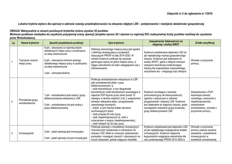 Załącznik nr 2 do ogłoszenia nr 1/2016 Lokalne kryteria wyboru dla operacji w zakresie rozwoju przedsiębiorczości na obszarze objętym LSR – podejmowanie i rozwijanie działalności gospodarczej UWAGA! Maksymalnie w ramach poniższych kryteriów można uzyskać 55 punktów. Minimum punktowe niezbędne do uzyskania pozytywnej oceny operacji /projektu wynosi 28 i stanowi co najmniej 50% maksymalnej liczby punktów możliwej do uzyskania przez Wnioskodawcę. Lp. Nazwa kryterium Sposób przydzielania punktacji 9 pkt – stworzenie co najmniej dwóch dodatkowych miejsc pracy w przeliczeniu na etaty średnioroczne 1. Tworzenie nowych miejsc pracy 6 pkt – stworzenie minimum jednego dodatkowego miejsca pracy w przeliczeniu na etaty średnioroczne Opis kryterium Definicja utworzonego miejsca pracy jest zgodna z definicją obowiązującą w przepisach dotyczących PROW na lata 2014-2020. W ramach kryterium preferuje się operacje generujące więcej niż jedno miejsce pracy, tj. dające zatrudnienie nie tylko ubiegającemu się o dofinansowanie. 3 pkt – samozatrudnienie 2. 3. Priorytetowe grupy wnioskodawców Innowacyjność 7 pkt – wnioskodawca jest osobą z grupy defaworyzowanej wskazanej w LSR 0 pkt – wnioskodawca nie jest osobą z grupy defaworyzowanej 5 pkt – jeżeli operacja jest innowacyjna 0 pkt – jeżeli operacja nie jest innowacyjna Preferuje wnioskodawców wskazanych w LSR jako przedstawicieli jeden z grup defaworyzowanych, tj.: - osób bezrobotnych, w tym długotrwale bezrobotnych (osób bezrobotnych pozostająca w rejestrze PUP łącznie przez okres ponad 12 miesięcy w okresie ostatnich 2 lat, z wyłączeniem okresów odbywania stażu i przygotowania zawodowego dorosłych), - kobiet, w tym również matek samotnie wychowujących dzieci - osób powyżej 50 roku życia, - osób niepełnosprawnych (tj. osób z orzeczeniem o stopniu niepełnosprawności), - osób młodych do 25 roku życia. Preferuje operacje o charakterze innowacyjnym. Oceniane jest nowatorstwo w odniesieniu do obszaru LGD. Może to oznaczać zastosowanie pomysłów i rozwiązań znanych i stosowanych na innych obszarach, jednak mających charakter Uzasadnienie/ Adekwatność do diagnozy i analizy SWOT Źródło weryfikacji Kryterium podyktowane dążeniem LGD do jak największego rozwoju gospodarczego obszaru. Kryterium jest adekwatne do analizy SWOT, gdzie w słabych stronach wykazano bezrobocie przekraczające średnią dla województwa mazowieckiego, wyludnianie wsi – emigrację ludzi młodych. Wniosek o przyznanie pomocy. Kryterium wynikające z potrzeby promowania grup de faworyzowanych, zgodnie z wytycznymi w zakresie przygotowania i realizacji LSR. Kryterium jest adekwatne do diagnozy obszaru, gdzie szczegółowo wskazano grupę docelową i grupy defaworyzowane LSR. Zaświadczenie z PUP, kserokopia dowodu osobistego, orzeczenie o niepełnosprawności, oświadczenie wnioskodawcy, wniosek o przyznanie pomocy. Kryterium podyktowane jest dążeniem LGD do jak największego propagowania działań innowacyjnych. Kryterium zapewnia bezpośrednie osiągnięcie wskaźników dla celu przekrojowego PROW 2014-2020 w Wniosek o przyznanie pomocy zawiera wyraźne wskazanie i uzasadnienie innowacyjności w kontekście wnioskowanej innowacji na terenie objętym LSR. Zaliczyć tu należy np.: nowatorski sposób wykorzystania zasobów lokalnych, rozwój nowych rodzajów produkcji i usług, zaspokojenie potrzeb, które były pomijane w dotychczasowych działaniach, modernizację tradycyjnych form technologii, rozwój funkcji obszaru, nowy sposób angażowania społeczności lokalnej w rozwój, nowe rozwiązania organizacyjne, zastosowanie nowych technik marketingowych. Wnioskodawca odniósł się do definicji innowacyjności zawartej w LSR oraz szczegółowo opisał w jaki sposób wybrane techniki/metody/narzędzia spełniają tę definicję w kontekście zaplanowanego projektu/operacji. Jednocześnie Wnioskodawca w opisie może uwzględnić odniesienie do Regionalnej Strategii Innowacji dla Mazowsza do 2020 roku. 4. 5. Działalność związana z wdrażaniem rozwiązań proekologicznych, w zakresie ochrony środowiska lub/i zmian klimatycznych Działalność gospodarcza, której dotyczy operacja/projekt przyczynia się do poprawy atrakcyjności oraz promowania walorów obszaru Stowarzyszenia Lokalna Grupa 3 pkt – zastosowanie rozwiązania proekologicznego w zakresie ochrony środowiska lub/i zmian klimatycznych 0 pkt – brak tego typu rozwiązania w operacji 3 pkt – operacja przyczynia się do poprawy atrakcyjności oraz promowania walorów obszaru działania LGD 0 pkt – operacja nie przyczynia się do poprawy atrakcyjności oraz promowania walorów obszaru działania LGD zakresie innowacyjności. Kryterium jest również adekwatne do analizy SWOT i diagnozy – pomijanie kwestii związanych z działaniami innowacyjnymi w kontekście podejmowania działalności gospodarczej. operacji/projektu. Punktowane są operacje/projekty, które dotyczą zastosowań proekologicznych, w zakresie ochrony środowiska lub/i zmian klimatycznych. Beneficjent we wniosku o dofinansowanie (z ewentualnym uwzględnieniem załączników) zamieszcza informację o planowanych rozwiązaniach w tym zakresie. Kryterium podyktowane jest dążeniem LGD do jak największego propagowania działań proekologicznych. Kryterium zapewnia bezpośrednie osiągnięcie wskaźników dla celów przekrojowych PROW 2014-2020 w zakresie ochrony środowiska i zmian klimatycznych. Kryterium jest również adekwatne do analizy SWOT i diagnozy – pomijanie kwestii związanych z działaniami proekologicznymi, w zakresie ochrony środowiska lub/i zmian klimatycznych w kontekście podejmowania działalności gospodarczej. Wniosek o przyznanie pomocy zawiera wyraźne wskazanie i uzasadnienie dla kryterium w kontekście wnioskowanej operacji/projektu. Ocenie podlega uwzględnienie w realizacji operacji działań zmierzających do poprawy atrakcyjności oraz