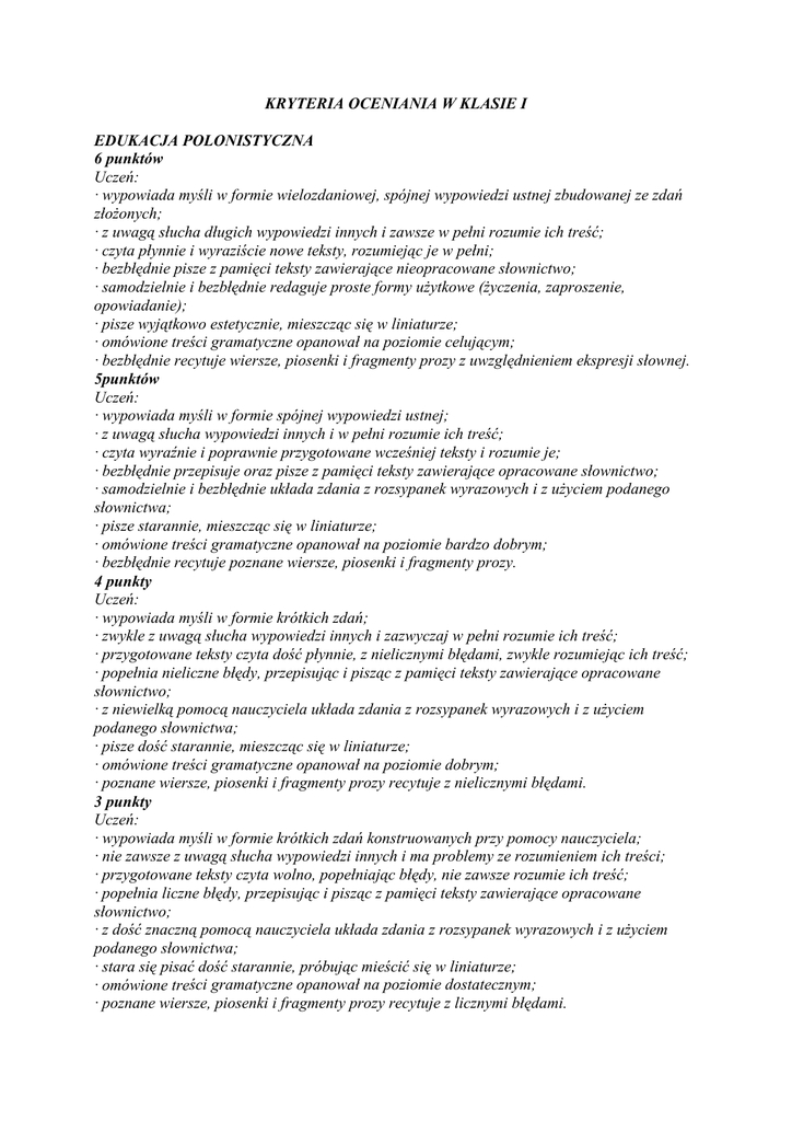 KRYTERIA OCENIANIA W KLASIE I EDUKACJA POLONISTYCZNA 6 punktów Uczeń: · wypowiada myśli w formie wielozdaniowej, spójnej wypowiedzi ustnej zbudowanej ze zdań złoŜonych; · z uwagą słucha długich wypowiedzi innych i zawsze w pełni rozumie ich treść; · czyta płynnie i wyraziście nowe teksty, rozumiejąc je w pełni; · bezbłędnie pisze z pamięci teksty zawierające nieopracowane słownictwo; · samodzielnie i bezbłędnie redaguje proste formy uŜytkowe (Ŝyczenia, zaproszenie, opowiadanie); · pisze wyjątkowo estetycznie, mieszcząc się w liniaturze; · omówione treści gramatyczne opanował na poziomie celującym; · bezbłędnie recytuje wiersze, piosenki i fragmenty prozy z uwzględnieniem ekspresji słownej. 5punktów Uczeń: · wypowiada myśli w formie spójnej wypowiedzi ustnej; · z uwagą słucha wypowiedzi innych i w pełni rozumie ich treść; · czyta wyraźnie i poprawnie przygotowane wcześniej teksty i rozumie je; · bezbłędnie przepisuje oraz pisze z pamięci teksty zawierające opracowane słownictwo; · samodzielnie i bezbłędnie układa zdania z rozsypanek wyrazowych i z uŜyciem podanego słownictwa; · pisze starannie, mieszcząc się w liniaturze; · omówione treści gramatyczne opanował na poziomie bardzo dobrym; · bezbłędnie recytuje poznane wiersze, piosenki i fragmenty prozy. 4 punkty Uczeń: · wypowiada myśli w formie krótkich zdań; · zwykle z uwagą słucha wypowiedzi innych i zazwyczaj w pełni rozumie ich treść; · przygotowane teksty czyta dość płynnie, z nielicznymi błędami, zwykle rozumiejąc ich treść; · popełnia nieliczne błędy, przepisując i pisząc z pamięci teksty zawierające opracowane słownictwo; · z niewielką pomocą nauczyciela układa zdania z rozsypanek wyrazowych i z uŜyciem podanego słownictwa; · pisze dość starannie, mieszcząc się w liniaturze; · omówione treści gramatyczne opanował na poziomie dobrym; · poznane wiersze, piosenki i fragmenty prozy recytuje z nielicznymi błędami. 3 punkty Uczeń: · wypowiada myśli w formie krótkich zdań konstruowanych przy pomocy nauczyciela; · nie zawsze z uwagą słucha wypowiedzi innych i ma problemy ze rozumieniem ich treści; · przygotowane teksty czyta wolno, popełniając błędy, nie zawsze rozumie ich treść; · popełnia liczne błędy, przepisując i pisząc z pamięci teksty zawierające opracowane słownictwo; · z dość znaczną pomocą nauczyciela układa zdania z rozsypanek wyrazowych i z uŜyciem podanego słownictwa; · stara się pisać dość starannie, próbując mieścić się w liniaturze; · omówione treści gramatyczne opanował na poziomie dostatecznym; · poznane wiersze, piosenki i fragmenty prozy recytuje z licznymi błędami. 2 punkty Uczeń: · pytany odpowiada pojedynczymi słowami; · ma problemy z wysłuchaniem wypowiedzi innych oraz ze zrozumieniem ich treści; · popełnia liczne błędy podczas czytania nawet prostych tekstów, zazwyczaj nie rozumie ich treści; · popełnia bardzo liczne błędy, przepisując i pisząc z pamięci teksty zawierające opracowane słownictwo; · poprawnie układa zdania z rozsypanek wyrazowych i z uŜyciem podanego słownictwa wyłącznie z pomocą nauczyciela; · pisze niestarannie, próbując mieścić się w liniaturze; · w minimalnym zakresie opanował omówione treści gramatyczne; · w minimalnym zakresie potrafi zapamiętać tekst wiersza, piosenki i fragmentu prozy. 1punkt Uczeń: · nie wyraŜa chęci wypowiadania się; · nie potrafi słuchać wypowiedzi innych i nie rozumie ich treści; · ma powaŜne problemy z czytaniem krótkich zdań, wyrazów, nie rozumie ich treści; · nie przepisuje i nie pisze z pamięci tekstów zawierających opracowane słownictwo; · nawet z pomocą nauczyciela nie układa zdań z rozsypanek wyrazowych i z uŜyciem podanego słownictwa; · pisze niestarannie, nie mieszcząc się w liniaturze; · nie opanował opracowanych treści gramatycznych; · nie potrafi zapamiętać tekstu wiersza, piosenki i fragmentu prozy. EDUKACJA MATEMATYCZNA 6 punktów Uczeń: · osiąga wysokie wyniki w konkursach szkolnych; · opanował treści matematyczne na poziomie wykraczającym poza program klasy pierwszej. 5 punktów Uczeń: · bezbłędnie określa stosunki przestrzenne; · bezbłędnie przelicza w zakresie 20; · biegle oraz bezbłędnie dodaje i odejmuje w zakresie 20 bez przekroczenia progu dziesiątkowego; · samodzielnie i bezbłędnie rozwiązuje proste zadania tekstowe; · na poziomie bardzo dobrym opanował umiejętności praktyczne (obliczenia pienięŜne, mierzenie długości, waŜenie, odmierzanie płynów, odczytywanie temperatury, posługiwanie się kalendarzem i zegarem – pełne godziny). 4 punkty Uczeń: · popełnia nieliczne błędy podczas określania stosunków przestrzennych dotyczących wybranych obiektów; · popełnia nieliczne błędy podczas przeliczania w zakresie 20; · popełnia nieliczne błędy podczas dodawania i odejmowania liczb w zakresie 20 bez przekroczenia progu dziesiątkowego; · zwykle bezbłędnie rozwiązuje proste zadania tekstowe; · popełnia nieliczne błędy, posługując się umiejętnościami praktycznymi (obliczenia pienięŜne, mierzenie długości, waŜenie, odmierzanie płynów, odczytywanie temperatury, posługiwanie się kalendarzem i zegarem – pełne godziny). 3 punkty Uczeń: · popełnia liczne błędy podczas określania stosunków przestrzennych wybranych obiektów; · popełnia liczne błędy podczas przeliczania obiektów w zakresie 20; · sprawnie dodaje i odejmuje w zakresie 10; · proste zadania tekstowe rozwiązuje z niewielką pomocą nauczyciela; · popełnia liczne błędy, posługując się umiejętnościami praktycznymi (obliczenia pienięŜne, mierzenie długości, waŜenie, odmierzanie płynów, odczytywanie temperatury, posługiwanie się kalendarzem i zegarem – pełne godziny). 2 punkty Uczeń: · mimo pomocy nauczyciela popełnia liczne błędy podczas okr