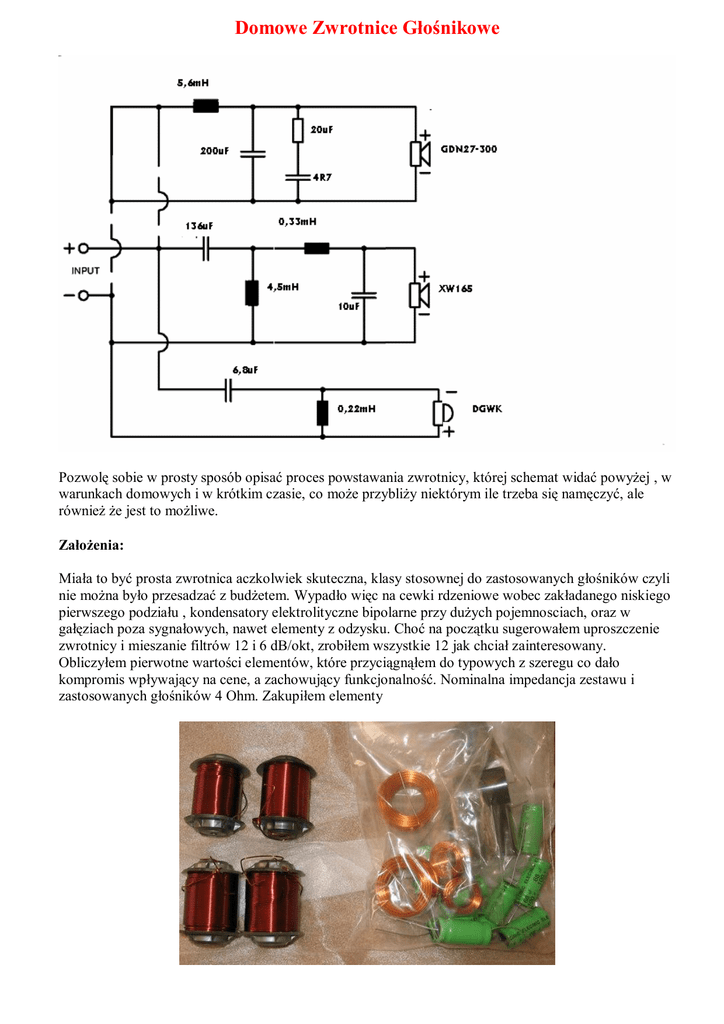 Domowe Zwrotnice Głośnikowe Pozwolę sobie w prosty sposób opisać proces powstawania zwrotnicy, której schemat widać powyżej , w warunkach domowych i w krótkim czasie, co może przybliży niektórym ile trzeba się namęczyć, ale również że jest to możliwe. Założenia: Miała to być prosta zwrotnica aczkolwiek skuteczna, klasy stosownej do zastosowanych głośników czyli nie można było przesadzać z budżetem. Wypadło więc na cewki rdzeniowe wobec zakładanego niskiego pierwszego podziału , kondensatory elektrolityczne bipolarne przy dużych pojemnosciach, oraz w gałęziach poza sygnałowych, nawet elementy z odzysku. Choć na początku sugerowałem uproszczenie zwrotnicy i mieszanie filtrów 12 i 6 dB/okt, zrobiłem wszystkie 12 jak chciał zainteresowany. Obliczyłem pierwotne wartości elementów, które przyciągnąłem do typowych z szeregu co dało kompromis wpływający na cene, a zachowujący funkcjonalność. Nominalna impedancja zestawu i zastosowanych głośników 4 Ohm. Zakupiłem elementy Płytka: Sam projekt połączeń wymaga trochę wyobraźni i można łatwo sobie rozplanować rozłożenie elementów układając je na kartce, rysując kilkoma kolorami połączenia i obrys „klocków” oraz potrzebne otwory. Nie ma znaczenia czy z kartki przeniesione będzie w skali 1:1 na laminat czy wcześniej biorąc papier pod światło narysuje się zwierciadlane odbicie, poprostu rozłożenie elementów będzie odwrócone. Wystarczy mieć cierpliwość i myśleć żeby później nie trzeba było czegoś rozwiercać czy w trakcie montażu przesuwać. Najlepiej wykorzystać dobry laminat który nie pęknie nawet gdy go wygiąć mocno, i ma dość grubą warstwę folii miedzianej. Najprostszą metodą wykonania płytki drukowanej do zwrotnicy jest trasowanie bruzd ostrym narzędziem. Dlaczego nie wytrawianie - dużo roboty z tym a płytka nie zawsze idealnie wyjdzie (nadtrawienia, nierówności). Wycinając bruzdy w jeden wieczór można zrobić płytki równie funkcjonalne bez odczynników, uzyskując spore placki miedzi co jest pozytywne przy większych prądach (symuluje to przewody o większym przekroju). Najpierw trzeba wyczyścić laminat drobnym papierem ściernym i odtłuścić, następnie narysować pisakiem wodoodpornym zaprojektowane przerwy i otwory. Następnie przykładając linijkę (najlepiej metalową lub starą na której nam nie zależy) ostrym nożem przeciągnąć po narysowanych liniach. Po tej czynności zmieniamy narzędzie na dość ostry śrubokręt i poprawiamy do skutku, jednak trzeba uważać żeby w rozpędzie nie przełamać płytki (nie przeciąć całego laminatu). Miernikiem (najlepiej z sygnalizacją akustyczną można sprawdzić czy nie ma niewłaściwych zwarć. Płytkę trzeba jeszcze raz przeszlifować papierem i nawiercić otwory. Tak wykonana płytka jest wystarczająca, kto chce może ją opisać dla swoich potrzeb pisakiem wodoodpornym. Bloki: Dla własnej wygody warto czytelnie rozplanować płytkę, widać 3 części (nisko, średnio i wysoko tonową), dzięki czemu uzyskuje się porządek w przewodach. Biegunowość, optymalizacja: Założenie mówiło że głośnik basowy będzie z boku. Normalnie zwrotnice ze wszystkimi zboczami 12dB/okt łączy się w przeciwfazie (czyli poszczególne głośniki są włączane w przeciwfazach, jeden względem drugiego ale tylko w teorii). Zwrotnica gł niskotonowego wnosi -90st przy częst. podziału a pierwszy filtr średniego +90 , ale biorąc pod uwagę to że występuje kolejna różnica faz związana z umieszczeniem głośnika z boku (jak i opóźnienie czasowe), oraz ważny fakt czyli charakterystyka głośnika basowego dopiero wzrasta a już jest obcinana, i głośnik średniak jest zabudowany w małej komorze dającej dużą dobroć Q układu z jego pierwszym filtrem, podłączenie w przeciwfazach wobec niezbyt wielkiego rozstawienia częstotliwości granicznych FDP i FGP mogło by dać podbicia . Osłabienie krytycznego przejścia podczas przekazywania dźwięku z boku na przód daje podłączenie w fazie Układ kompensacji impedancji dla niskiego został zrobiony w elementów o niższych lotach, choć i tak dobrych i sprawdzonych. Wyliczona wartość elementów dla indukcyjności cewki głośnika przy 1KHz to C=23mikrofarady R=4,9Ohm. Ponieważ dostałem rezystor z szeregu 4,7 podwyższyłem trochę częst przy której zaczyna pracować kompensator. Składając typowe kondensatory 10, i 2x4,7mikrofaradów uzyskałem pojemność wypadkową bliską 20stu, takie miałem klocki, ale wiadomo można dać jeden lub dwa , czy np. Przeciwsobnie elektrolity zbocznikowane zwykłym 1-2 mikro. Drugi filtr średniaka jest przystosowany z kolei to tego aby zmniejszyć rezonans na końcu pasma XW165. Impedancja XW może wzrastać ale nie krytycznie wiec zwiększona indukcyjność cewki szeregowej jest wskazana. Tłumik lub kolejny kompensator (raczej to pierwsze jeśli już) spowoduje uspokojenie impedancji , ale uwaga żeby nie powstał dołek przy częst. podziału. Ogólnie nie trzeba tłumika na ten głośnik dawać bo jest niższej efektywności, ale trzeba uwzględnić wpływ elementów filtra także. Wysoki można minimalnie stłumić wg uznania ale raczej po próbach, jednak i tutaj zaplanowałem miejsce na dodatkowe rezystory. Zależnie od tego czy tłumiki będą czy nie wyprowadzenia przewodów można lutować w różne miejsca, żeby nie stosować niepotrzebnych zworek. Wszystkie elementy warto przed przylutowaniem jak i po trochę oblać elastycznym klejem. Jak widać cewki powietrzne (te już lepszej jakości) dodatkowo przyciągnąłem opaską. Musiałem, zaoszczędzić miejsce na próby z tłumikami więc duże cewki zamocowałem pionowo na wkręty samowiercące. Ponieważ wkręty nie wchodzą głęboko nie ma to wielkiego wpływu na wartości impedancji, choć zawsze można poszukać np. mosiężnych. Przekonałem się zresztą że im tańsze wykonanie zamówionych cewek