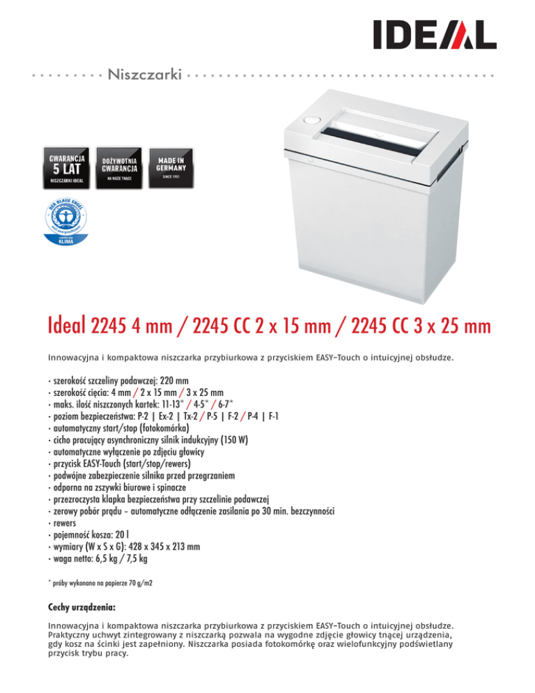 Niszczarki Ideal 2245 4 mm / 2245 CC 2 x 15 mm / 2245 CC 3 x 25 mm Innowacyjna i kompaktowa niszczarka przybiurkowa z przyciskiem EASY-Touch o intuicyjnej obsłudze. • szerokość szczeliny podawczej: 220 mm • szerokość cięcia: 4 mm / 2 x 15 mm / 3 x 25 mm • maks. ilość niszczonych kartek: 11-13* / 4-5* / 6-7* • poziom bezpieczeństwa: P-2 | Ex-2 | Tx-2 / P-5 | F-2 / P-4 | F-1 • automatyczny start/stop (fotokomórka) • cicho pracujący asynchroniczny silnik indukcyjny (150 W) • automatyczne wyłączenie po zdjęciu głowicy • przycisk EASY-Touch (start/stop/rewers) • podwójne zabezpieczenie silnika przed przegrzaniem • odporna na zszywki biurowe i spinacze • przezroczysta klapka bezpieczeństwa przy szczelinie podawczej • zerowy pobór prądu – automatyczne odłączenie zasilania po 30 min. bezczynności • rewers • pojemność kosza: 20 l • wymiary (W x S x G): 428 x 345 x 213 mm • waga netto: 6,5 kg / 7,5 kg * próby wykonano na papierze 70 g/m2 Cechy urządzenia: Innowacyjna i kompaktowa niszczarka przybiurkowa z przyciskiem EASY-Touch o intuicyjnej obsłudze. Praktyczny uchwyt zintegrowany z niszczarką pozwala na wygodne zdjęcie głowicy tnącej urządzenia, gdy kosz na ścinki jest zapełniony. Niszczarka posiada fotokomórkę oraz wielofunkcyjny podświetlany przycisk trybu pracy.
