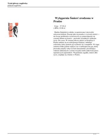 Tytuł główny nagłówka podtytuł nagłówka Wylęgarnia Śmierć zrodzona w Pradze Cena: 27.30 zł (-19%) 33.90 zł Marika Zahaňská to młoda, wysportowana i niezwykle seksowna kobieta. Pracuje jako asystentka w wyższej szkole i – nie licząc problemów uczuciowych czy pojawiającego się czasami debetu na koncie – prowadzi stosunkowo spokojne życie. Do czasu. W ciemnej uliczce gdzieś za Książęcą w Pradze natknie się na uzbrojonego bandytę i młodego człowieka, który pomoże jej wydostać się z tarapatów. W ciągu zaledwie kilku godzin wplącze się w niebezpieczną grę, którą prowadzą między sobą wywiad amerykański, poszukujący walizek nuklearnych i czesko-rosyjska mafia atakowana przez tajemniczych najemników. Wyjaśnienie zagadki, śmierć albo życie, znajduje się właśnie w Pradze. 1/1 Powered by TCPDF (www.tcpdf.org)
