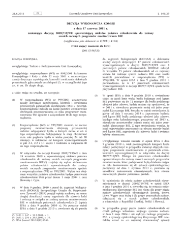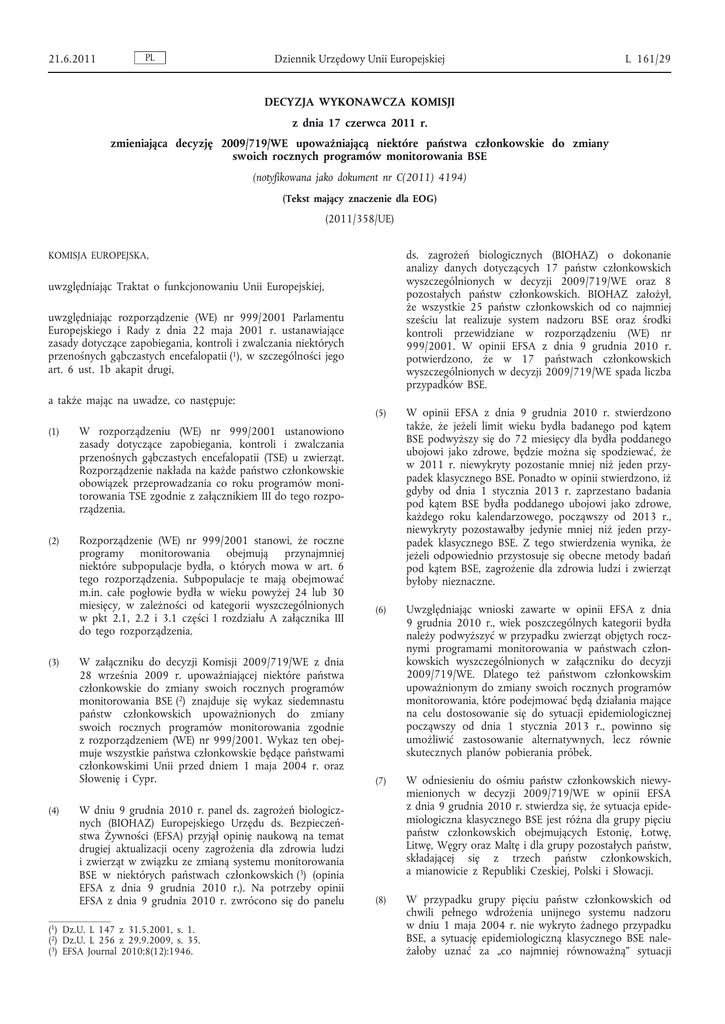 21.6.2011 PL Dziennik Urzędowy Unii Europejskiej L 161/29 DECYZJA WYKONAWCZA KOMISJI z dnia 17 czerwca 2011 r. zmieniająca decyzję 2009/719/WE upoważniającą niektóre państwa członkowskie do zmiany swoich rocznych programów monitorowania BSE (notyfikowana jako dokument nr C(2011) 4194) (Tekst mający znaczenie dla EOG) (2011/358/UE) ds. zagrożeń biologicznych (BIOHAZ) o dokonanie analizy danych dotyczących 17 państw członkowskich wyszczególnionych w decyzji 2009/719/WE oraz 8 pozostałych państw członkowskich. BIOHAZ założył, że wszystkie 25 państw członkowskich od co najmniej sześciu lat realizuje system nadzoru BSE oraz środki kontroli przewidziane w rozporządzeniu (WE) nr 999/2001. W opinii EFSA z dnia 9 grudnia 2010 r. potwierdzono, że w 17 państwach członkowskich wyszczególnionych w decyzji 2009/719/WE spada liczba przypadków BSE. KOMISJA EUROPEJSKA, uwzględniając Traktat o funkcjonowaniu Unii Europejskiej, uwzględniając rozporządzenie (WE) nr 999/2001 Parlamentu Europejskiego i Rady z dnia 22 maja 2001 r. ustanawiające zasady dotyczące zapobiegania, kontroli i zwalczania niektórych przenośnych gąbczastych encefalopatii (1), w szczególności jego art. 6 ust. 1b akapit drugi, a także mając na uwadze, co następuje: (5) W opinii EFSA z dnia 9 grudnia 2010 r. stwierdzono także, że jeżeli limit wieku bydła badanego pod kątem BSE podwyższy się do 72 miesięcy dla bydła poddanego ubojowi jako zdrowe, będzie można się spodziewać, że w 2011 r. niewykryty pozostanie mniej niż jeden przy padek klasycznego BSE. Ponadto w opinii stwierdzono, iż gdyby od dnia 1 stycznia 2013 r. zaprzestano badania pod kątem BSE bydła poddanego ubojowi jako zdrowe, każdego roku kalendarzowego, począwszy od 2013 r., niewykryty pozostawałby jedynie mniej niż jeden przy padek klasycznego BSE. Z tego stwierdzenia wynika, że jeżeli odpowiednio przystosuje się obecne metody badań pod kątem BSE, zagrożenie dla zdrowia ludzi i zwierząt byłoby nieznaczne. (6) W załączniku do decyzji Komisji 2009/719/WE z dnia 28 września 2009 r. upoważniającej niektóre państwa członkowskie do zmiany swoich rocznych programów monitorowania BSE (2) znajduje się wykaz siedemnastu państw członkowskich upoważnionych do zmiany swoich rocznych programów monitorowania zgodnie z rozporządzeniem (WE) nr 999/2001. Wykaz ten obej muje wszystkie państwa członkowskie będące państwami członkowskimi Unii przed dniem 1 maja 2004 r. oraz Słowenię i Cypr. Uwzględniając wnioski zawarte w opinii EFSA z dnia 9 grudnia 2010 r., wiek poszczególnych kategorii bydła należy podwyższyć w przypadku zwierząt objętych rocz nymi programami monitorowania w państwach człon kowskich wyszczególnionych w załączniku do decyzji 2009/719/WE. Dlatego też państwom członkowskim upoważnionym do zmiany swoich rocznych programów monitorowania, które podejmować będą działania mające na celu dostosowanie się do sytuacji epidemiologicznej począwszy od dnia 1 stycznia 2013 r., powinno się umożliwić zastosowanie alternatywnych, lecz równie skutecznych planów pobierania próbek. (7) W dniu 9 grudnia 2010 r. panel ds. zagrożeń biologicz nych (BIOHAZ) Europejskiego Urzędu ds. Bezpieczeń stwa Żywności (EFSA) przyjął opinię naukową na temat drugiej aktualizacji oceny zagrożenia dla zdrowia ludzi i zwierząt w związku ze zmianą systemu monitorowania BSE w niektórych państwach członkowskich (3) (opinia EFSA z dnia 9 grudnia 2010 r.). Na potrzeby opinii EFSA z dnia 9 grudnia 2010 r. zwrócono się do panelu W odniesieniu do ośmiu państw członkowskich niewy mienionych w decyzji 2009/719/WE w opinii EFSA z dnia 9 grudnia 2010 r. stwierdza się, że sytuacja epide miologiczna klasycznego BSE jest różna dla grupy pięciu państw członkowskich obejmujących Estonię, Łotwę, Litwę, Węgry oraz Maltę i dla grupy pozostałych państw, składającej się z trzech państw członkowskich, a mianowicie z Republiki Czeskiej, Polski i Słowacji. (8) W przypadku grupy pięciu państw członkowskich od chwili pełnego wdrożenia unijnego systemu nadzoru w dniu 1 maja 2004 r. nie wykryto żadnego przypadku BSE, a sytuację epidemiologiczną klasycznego BSE nale żałoby uznać za „co najmniej równoważną” sytuacji (1) W rozporządzeniu (WE) nr 999/2001 ustanowiono zasady dotyczące zapobiegania, kontroli i zwalczania przenośnych gąbczastych encefalopatii (TSE) u zwierząt. Rozporządzenie nakłada na każde państwo członkowskie obowiązek przeprowadzania co roku programów moni torowania TSE zgodnie z załącznikiem III do tego rozpo rządzenia. (2) Rozporządzenie (WE) nr 999/2001 stanowi, że roczne programy monitorowania obejmują przynajmniej niektóre subpopulacje bydła, o których mowa w art. 6 tego rozporządzenia. Subpopulacje te mają obejmować m.in. całe pogłowie bydła w wieku powyżej 24 lub 30 miesięcy, w zależności od kategorii wyszczególnionych w pkt 2.1, 2.2 i 3.1 części I rozdziału A załącznika III do tego rozporządzenia. (3) (4) (1) Dz.U. L 147 z 31.5.2001, s. 1. (2) Dz.U. L 256 z 29.9.2009, s. 35. (3) EFSA Journal 2010;8(12):1946. L 161/30 PL Dziennik Urzędowy Unii Europejskiej w 17 państwach członkowskich wyszczególnionych w decyzji 2009/719/WE. Dlatego też, jako że w grupie tych 22 państw członkowskich sytuacja epidemiolo giczna jest porównywalna, w państwach tych powinno się stosować podobny system badań. (9) (10) (11) (12) (13) (14) Z opinii EFSA z dnia 9 grudnia 2010 r. wynika, że w Republice Czeskiej, Polsce i na Słowacji zaobserwować można dwa wzorce występowania klasycznego BSE w kohortach urodzeniowych oraz zależnie od średniego wieku zwierząt, u których wykryto chorobę. Ten drugi wzorzec utrudnia ustalenie wyraźnych podobieństw między tendencją występowania zachorowań na klasyczne BSE w siedemnastu państwach członkowskich wymienionych w decyzji 2009/719/WE oraz w grupie tych trze