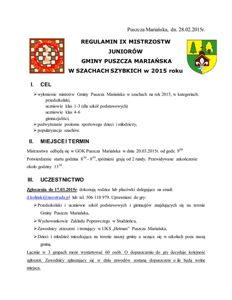 Puszcza Mariańska, dn. 28.02.2015r. REGULAMIN IX MISTRZOSTW JUNIORÓW I. GMINY PUSZCZA MARIAŃSKA W SZACHACH SZYBKICH w 2015 roku CEL wyłonienie mistrzów Gminy Puszcza Mariańska w szachach na rok 2015, w kategoriach: przedszkolaki, uczniowie klas 1-3 (dla szkół podstawowych) uczniowie klas 4-6 gimnazjaliści, podwyższanie poziomu sportowego dzieci i młodzieży, popularyzacja szachów. II. MIEJSCE I TERMIN Mistrzostwa odbędą się w GOK Puszcza Mariańska w dniu 20.03.2015r. od godz. 9 00 Potwierdzenie startu godzina 830 - 850 , spóźnieni grają od 2 rundy. Przewidywane zakończenie około godziny 1330 . III. UCZESTNICTWO Zgłoszenia do 17.03.2015r. dokonują rodzice lub placówki delegujące na email: [email protected] lub tel. 506 118 979. Uprawnieni do gry: Przedszkolaki i uczniowie szkół podstawowych i gimnazjów znajdujących się na terenie Gminy Puszcza Mariańska, Wychowankowie Zakładu Poprawczego w Studzieńcu, Zawodnicy zrzeszeni i trenujący w UKS „Hetman” Puszcza Mariańska, Dzieci i młodzież mieszkająca na terenie naszej gminy a ucząca się w szkołach poza naszą gminą. Łącznie w 3 grupach może wystartować 60 osób. O dopuszczeniu do gry decyduje kolejność zgłoszeń. Zawodnicy zgłaszający się w dniu zawodów zostaną dopuszczeni o ile będą wolne miejsca. IV. SYSTEM ROZGRYWEK W turnieju obowiązują przepisy kodeksu szachowego. Czas gry P’15 (zawodnik ma w każdej partii 15 minut na własne myślenie). System gry szwajcarski oddzielnie dla każdej kategorii wiekowej. O kolejności miejsc decyduje liczba punktów, M-Bucholtz, Bucholtz, liczba zwycięstw, progres, przy równości powyższych punktacji dodatkowa partia tempem P’5. Dystans gry 5 rund (w przypadku zbyt małej liczby uczestników w grupie rozegrany zostanie turniej kołowy lub dwa sąsiednie turnieje zostaną połączone). V. NAGRODY I WYRÓŻNIENIA Nagrodzonych zostanie pierwszych 3 zawodników oraz najlepsza zawodniczka w każdej kategorii wiekowej. VI. PRZEPISY GRY W turnieju obowiązują przepisy Kodeksu szachowego ze zmianami od 1.7.2014r. z wyłączeniem artykułów: A3, B3, G4. Organizator nie posiada depozytu z tego względu, dopuszcza się wnoszenie na salę gry komunikatorów elektronicznych. Używanie ich na sali gry będzie karane. Dopuszcza się spóźnienia na rundę do spadnięcia czasu. W sytuacjach spornych decyduje sędzia zawodów. VII. SPRAWY WYCHOWAWCZE Opiekę wychowawczą podczas zawodów sprawują opiekunowie ze szkół. Zabrania się uczestnikom opuszczania sali turniejowej w trakcie gry. Turniej nie będzie zgłoszony do klasyfikacji rankingowej FIDE. Dariusz Koliński