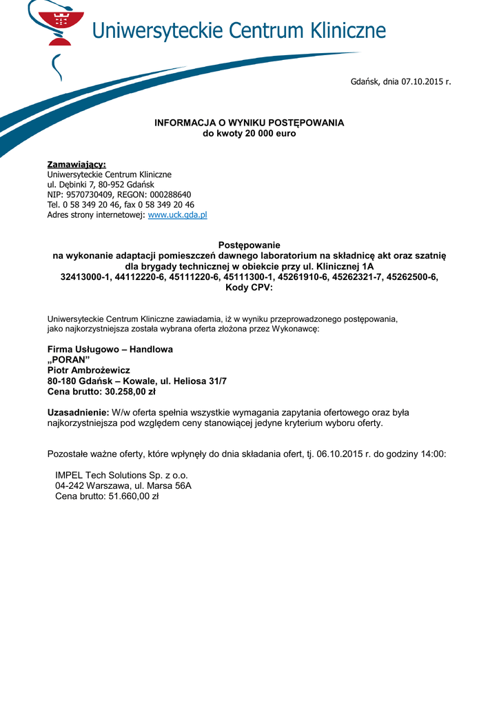 Gdańsk, dnia 07.10.2015 r. INFORMACJA O WYNIKU POSTĘPOWANIA do kwoty 20 000 euro Zamawiający: Uniwersyteckie Centrum Kliniczne ul. Dębinki 7, 80-952 Gdańsk NIP: 9570730409, REGON: 000288640 Tel. 0 58 349 20 46, fax 0 58 349 20 46 Adres strony internetowej: www.uck.gda.pl Postępowanie na wykonanie adaptacji pomieszczeń dawnego laboratorium na składnicę akt oraz szatnię dla brygady technicznej w obiekcie przy ul. Klinicznej 1A 32413000-1, 44112220-6, 45111220-6, 45111300-1, 45261910-6, 45262321-7, 45262500-6, Kody CPV: Uniwersyteckie Centrum Kliniczne zawiadamia, iż w wyniku przeprowadzonego postępowania, jako najkorzystniejsza została wybrana oferta złożona przez Wykonawcę: Firma Usługowo – Handlowa „PORAN” Piotr Ambrożewicz 80-180 Gdańsk – Kowale, ul. Heliosa 31/7 Cena brutto: 30.258,00 zł Uzasadnienie: W/w oferta spełnia wszystkie wymagania zapytania ofertowego oraz była najkorzystniejsza pod względem ceny stanowiącej jedyne kryterium wyboru oferty. Pozostałe ważne oferty, które wpłynęły do dnia składania ofert, tj. 06.10.2015 r. do godziny 14:00: IMPEL Tech Solutions Sp. z o.o. 04-242 Warszawa, ul. Marsa 56A Cena brutto: 51.660,00 zł