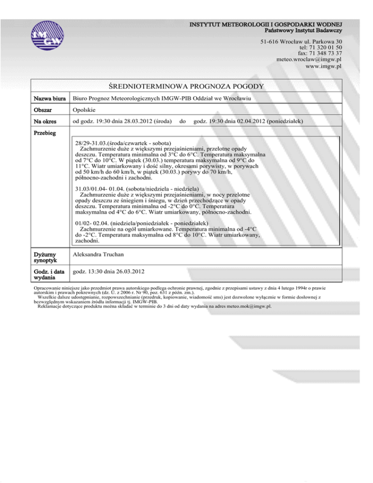 INSTYTUT METEOROLOGII I GOSPODARKI WODNEJ Państwowy Instytut Badawczy 51-616 Wrocław ul. Parkowa 30 tel: 71 320 01 50 fax: 71 348 73 37 [email protected] www.imgw.pl ŚREDNIOTERMINOWA PROGNOZA POGODY Nazwa biura Biuro Prognoz Meteorologicznych IMGW-PIB Oddział we Wrocławiu Obszar Opolskie Na okres od godz. 19:30 dnia 28.03.2012 (środa) do godz. 19:30 dnia 02.04.2012 (poniedziałek) Przebieg 28/29-31.03.(środa/czwartek - sobota) Zachmurzenie duże z większymi przejaśnieniami, przelotne opady deszczu. Temperatura minimalna od 3°C do 6°C. Temperatura maksymalna od 7°C do 10°C. W piątek (30.03.) temperatura maksymalna od 9°C do 11°C. Wiatr umiarkowany i dość silny, okresami porywisty, w porywach od 50 km/h do 60 km/h, w piątek (30.03.) porywy do 70 km/h, północno-zachodni i zachodni. 31.03/01.04- 01.04. (sobota/niedziela - niedziela) Zachmurzenie duże z większymi przejaśnieniami, w nocy przelotne opady deszczu ze śniegiem i śniegu, w dzień przechodzące w opady deszczu. Temperatura minimalna od -2°C do 0°C. Temperatura maksymalna od 4°C do 6°C. Wiatr umiarkowany, północno-zachodni. 01/02- 02.04. (niedziela/poniedziałek - poniedziałek) Zachmurzenie na ogół umiarkowane. Temperatura minimalna od -4°C do -2°C. Temperatura maksymalna od 8°C do 10°C. Wiatr umiarkowany, zachodni. Dyżurny synoptyk Aleksandra Truchan Godz. i data wydania godz. 13:30 dnia 26.03.2012 Opracowanie niniejsze jako przedmiot prawa autorskiego podlega ochronie prawnej, zgodnie z przepisami ustawy z dnia 4 lutego 1994r o prawie autorskim i prawach pokrewnych (dz. U. z 2006 r. Nr 90, poz. 631 z późn. zm.). Wszelkie dalsze udostępnianie, rozpowszechnianie (przedruk, kopiowanie, wiadomość sms) jest dozwolone wyłącznie w formie dosłownej z bezwzględnym wskazaniem źródła informacji tj. IMGW-PIB. Reklamacje dotyczące produktu można składać w terminie do 3 dni od daty wydania na adres [email protected].