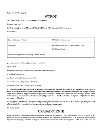 Sygn. akt III AUa 345/15 WYROK W IMIENIU RZECZYPOSPOLITEJ POLSKIEJ Dnia 22 lipca 2015 r. Sąd Apelacyjny w Lublinie III Wydział Pracy i Ubezpieczeń Społecznych w składzie: Przewodniczący - Sędzia SA Barbara Hejwowska Sędziowie: SA Małgorzata Rokicka - Radoniewicz (spr.) SA Elżbieta Czaja Protokolant: protokolant sądowy Joanna Malena po rozpoznaniu w dniu 22 lipca 2015 r. w Lublinie sprawy B. R. przeciwko Zakładowi Ubezpieczeń Społecznych Oddziałowi w S. o wysokość emerytury na skutek apelacji wnioskodawcy B. R. od wyroku Sądu Okręgowego w Siedlcach z dnia 26 lutego 2015 r. sygn. akt IV U 29/14 I. zmienia zaskarżony wyrok oraz poprzedzającą go decyzję i ustala B. R. wysokość emerytury przy uwzględnieniu okresów składkowych: zatrudnienia w Kółku Rolniczym w C. od dnia 6 marca 1966 roku do dnia 20 października 1967 roku i od dnia 2 listopada 1969 roku do dnia 31 marca 1972 roku oraz zatrudnienia w Wojewódzkiej Spółdzielni (...) w S. od dnia 1 sierpnia 1985 roku do dnia 15 maja 1988 roku; II. zasądza od Zakładu Ubezpieczeń Społecznych Oddziału w S. na rzecz B. R. kwotę 30 (trzydzieści) złotych tytułem zwrotu kosztów postępowania apelacyjnego. III AUa 345/15 UZASADNIENIE Organ rentowy - Zakład Ubezpieczeń Społecznych Oddział w S. decyzja z dnia 28 listopada 2013 r. przyznał B. R. prawo do emerytury na podstawie ustawy z dn. 17.12.1998 r. o emeryturach i rentach z FUS, przy czym do obliczenia wysokości emerytury Zakład nie uwzględnił okresów zatrudnienia w Kółku Rolniczym w C. od 6 marca 1966 r. do 20 października 1967 r. i od 2 listopada 1969 r. do 31 marca 1972 r. oraz w Wojewódzkiej Spółdzielni Pracy (...) 1 sierpnia 1985 r. do 14 sierpnia 1988 r., gdyż brak jest dokumentów potwierdzających zatrudnienie. Od decyzji tej odwołanie do Sądu Okręgowego w Siedlcach złożył B. R., który wnosił o jej zmianę. Odwołujący domagał się zaliczenia okresów wymienionych w decyzji do okresów ubezpieczeniowych, od których zależy wysokość emerytury. Sąd Okręgowy w Siedlcach wyrokiem z dnia 26 lutego 2015 roku oddalił odwołanie. Sąd Okręgowy ustalił, że B. R. mający ustalone prawo do renty rolniczej wystąpił do KRUS o przeliczenie świadczenia z uwzględnieniem okresu podlegania innym ubezpieczeniom. Mianowicie wnosił o uwzględnienie zatrudnienia w Kółku Rolniczym w C. od 6.03.1966 r. do 20.10.1967 r. i od 2.11.1969 r. do 31.03.1972 r. oraz zatrudnienia w Wojewódzkiej Spółdzielni Pracy (...) od 01.08.1985 r. do 15.05.1988 r. Prezes KRUS odmówił doliczenia wymienionych okresów w celu przeliczenia świadczenia. W postępowaniu odwoławczym Sąd Okręgowy w Siedlcach zaliczył wymienione okresy zatrudnienia jako okresy ubezpieczeniowe i wyrokiem z dnia 22.03.2013 r. w sprawie IV U 555/12 ustalił wysokość renty rolniczej B. R.. W dniu 10.10.2013r. B. R. wystąpił do (...) Oddział w S. o przyznanie mu prawa do emerytury. Organ rentowy zaskarżoną decyzją przyznał wnioskodawcy prawo do emerytury z FUS, ale do okresów składkowych nie uwzględnił okresów zatrudnienia w obydwu wymienionych wyżej zakładach ze względu na brak dokumentów potwierdzających zatrudnienie. Sąd Okręgowy zauważył, że okresy zatrudnienia, których zaliczenia domaga się ubezpieczony zostały uwzględnione o wyliczenie wysokości renty rolniczej. Zdaniem Sądu te same okresy nie mogą być zaliczone do przeliczenia wysokości emerytury ustalonej przez ZUS. Przepis art. 20 ust. 2 ustawy z dn. 20.12.1990r . o ubezpieczeniu społecznym rolników (Dz.U. z 1998 r. Nr 50 poz. 291) stanowi, że okresów o których mowa w ust. 1 nie zalicza się do okresów ubezpieczenia, jeżeli zostały zaliczone do okresów, od których zależy prawo do emerytury bądź renty na podstawie odrębnych przepisów. Zdaniem Sądu Okręgowego powołane przepisy można zastosować do sytuacji odwrotnej, tj. do przyjęcia, że okresy zaliczone do ustalenia wysokości renty rolniczej nie mogą być wykorzystane do zaliczenia do okresów ubezpieczeniowych dla potrzeb wyliczenia wysokości emerytury z ZUS. Od tego wyroku apelację wniósł wnioskodawca B. R. zaskarżając wyrok w całości. Wyrokowi zarzucał nieuwzględnienie faktu, ze Sąd Okręgowy zaliczył mu te okresy ubezpieczenia, a mimo to ZUS nie chciał mu ich uwzględnić. Wnosił o zmianę wyroku i wliczenie tych okresów składkowych do emerytury. Sąd Apelacyjny zważył, co następuje: Apelacja jest zasadna a jej uwzględnienie skutkuje zmianą zaskarżonego wyroku wraz z poprzedzającą go decyzją. Sąd Okręgowy jako podstawę rozstrzygnięcia wskazał przepis art.20 ust.2 ustawy z dnia 20 grudnia 1990 roku o ubezpieczeniu społecznym rolników. Przepis ten nie znajduje zastosowania przy ustalaniu wysokości emerytury z Funduszu Ubezpieczeń Społecznych przyznawanych na podstawie ustawy z dnia 17 grudnia 1998 roku o emeryturach i rentach z Funduszu Ubezpieczeń Społecznych (tekst jedn. Dz.U. 2015 r. poz.748). Zgodnie z art. 15 ust.1 tej ustawy wysokość emerytury oblicza się z uwzględnieniem udowodnionych przez ubezpieczonego okresów składkowych i nieskładkowych, przy czym w myśl art.6 ust.2 pkt.1 za okresy składkowe uważa się również przypadające przed dniem 15 listopada 1991 r. okresy zatrudnienia po ukończeniu 15 lat życia na obszarze Państwa Polskiego - w wymiarze nie niższym niż połowa pełnego wymiaru czasu pracy, jeżeli w tych okresach pracownik pobierał wynagrodzenie lub zasiłki z ubezpieczenia społecznego, za które została opłacona składka na ubezpieczenie społeczne albo za które nie było obowiązku opłacania składek na ubezpieczenie społeczne. Ustawa nie zawiera żadnego przepisu pozwalającego na wyłączenie tych okresów składkowych, nawet w sytuacji gdy wcześniej były one uwzględnione w wymiarze świadczenia z innego ubezpieczenia społecznego. Zakaz taki odnosi się wyłącznie do wymienionego w art.10 ust.1 ustawy okresu uzupełniając