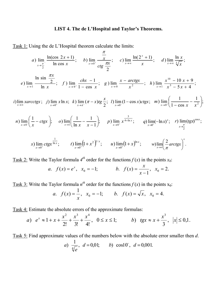 LIST 4. The de L’Hospital and Taylor’s Theorems. Task 1: Using the de L’Hospital theorem calculate the limits: π x ; b ) lim+ x→ 0 πx ctg 2 ln(cos 2 x + 1) ; a ) lim − π ln cos x x→ 2 πx 2 ; ln x ln sin e ) lim x→1 f ) lim + x→ 0 chx − 1 ; 1 − cos x g ) lim x→ 0 i ) lim xarcctgx ; j ) lim+ x ln x; k ) lim− (π − x )tg x→∞ x→0 1 n ) lim− − ctgx ; x→ 0 x s ) lim+ ctgx x→0 x →π 1 1 o ) lim − ; x →1 ln x x −1 1 ln x ; ( t ) lim+ 1 + x x →0 ) 2 1/ x ln( 2 x + 1) ; c ) lim x→ ∞ x d ) lim ln x ; x x→ ∞ 3 x − arctgx x 10 − 10 x + 9 ; h ) lim ; x→1 x2 x5 − 5x + 4 1 1 x − 2 ; ; l ) lim− (1 − cos x )ctgx ; m ) lim+ x → 0 1 − cos x x→0 x 2 3 p ) lim+ x 4 + ln x ; q) lim+ (− ln x) x ; x→ 0 ; x→0 r) lim− (tgx) cos x ; π x→ 2 2 w) lim arctgx . x →∞ π u ) lim+ (1 + x ) ; x ln x x →0 Task 2: Write the Taylor formula 4th order for the functions f (x) in the points x0: x a. f ( x ) = e x , x0 = −1; b. f ( x ) = , x 0 = 2. x −1 Task 3: Write the Taylor formula nth order for the functions f (x) in the points x0: a. f ( x ) = 1 , x0 = −1; x b. f ( x ) = x , x 0 = 4. Task 4: Estimate the absolute errors of the approximate formulas: x2 x3 x 4 a) e ≈ 1 + x + + + , 0 ≤ x ≤ 1; 2! 3! 4! x x3 b) tgx ≈ x + , x ≤ 0,1. 3 Task 5: Find approximate values of the numbers below with the absolute error smaller then d. 1 a) 4 , d = 0,01; b) cos10o , d = 0,001. e