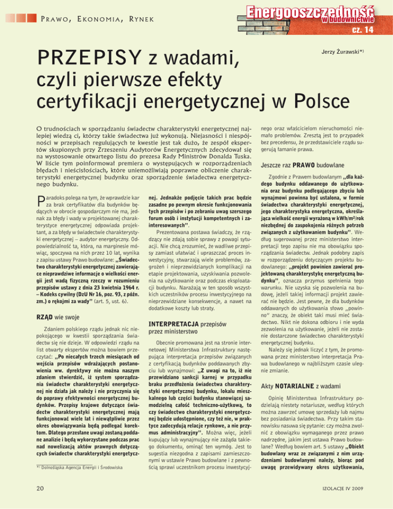 PRAWO, EKONOMIA, RYNEK Energooszczędność w budownictwie cz. 14 Jerzy Żurawski*) PRZEPISY z wadami, czyli pierwsze efekty certyfikacji energetycznej w Polsce O trudnościach w sporządzaniu świadectw charakterystyki energetycznej najlepiej wiedzą ci, którzy takie świadectwa już wykonują. Niejasności i niespójności w przepisach regulujących te kwestie jest tak dużo, że zespół ekspertów skupionych przy Zrzeszeniu Audytorów Energetycznych zdecydował się na wystosowanie otwartego listu do prezesa Rady Ministrów Donalda Tuska. W liście tym poinformował premiera o występujących w rozporządzeniach błędach i nieścisłościach, które uniemożliwiają poprawne obliczenie charakterystyki energetycznej budynku oraz sporządzenie świadectwa energetycznego budynku. P aradoks polega na tym, że wprawdzie kar za brak certyfikatów dla budynków będących w obrocie gospodarczym nie ma, jednak za błędy i wady w projektowanej charakterystyce energetycznej odpowiada projektant, a za błędy w świadectwie charakterystyki energetycznej – audytor energetyczny. Odpowiedzialność ta, która, na marginesie mówiąc, spoczywa na nich przez 10 lat, wynika z zapisu ustawy Prawo budowlane: „Świadectwo charakterystyki energetycznej zawierające nieprawdziwe informacje o wielkości energii jest wadą fizyczną rzeczy w rozumieniu przepisów ustawy z dnia 23 kwietnia 1964 r. – Kodeks cywilny (DzU Nr 16, poz. 93, z późn. zm.) o rękojmi za wady” (art. 5, ust. 6). nej. Jednakże podjęcie takich prac będzie zasadne po pewnym okresie funkcjonowania tych przepisów i po zebraniu uwag szerszego forum osób i instytucji kompetentnych i zainteresowanych”. Prezentowana postawa świadczy, że rządzący nie zdają sobie sprawy z powagi sytuacji. Nie chcą zrozumieć, że wadliwe przepisy zamiast ułatwiać i upraszczać proces inwestycyjny, stwarzają wiele problemów, zagrożeń i nieprzewidzianych komplikacji na etapie projektowania, uzyskiwania pozwolenia na użytkowanie oraz podczas eksploatacji budynku. Narażają w ten sposób wszystkich uczestników procesu inwestycyjnego na nieprzewidziane konsekwencje, a nawet na dodatkowe koszty lub straty. RZĄD wie swoje Zdaniem polskiego rządu jednak nic niepokojącego w kwestii sporządzania świadectw się nie dzieje. W odpowiedzi rządu na list otwarty ekspertów można bowiem przeczytać: „Po niecałych trzech miesiącach od wejścia przepisów wdrażających postanowienia ww. dyrektywy nie można naszym zdaniem stwierdzić, iż system sporządzania świadectw charakterystyki energetycznej nie działa jak należy i nie przyczynia się do poprawy efektywności energetycznej budynków. Przepisy krajowe dotyczące świadectw charakterystyki energetycznej mają funkcjonować wiele lat i niewątpliwie przez okres obowiązywania będą podlegać korektom. Dlatego przesłane uwagi zostaną poddane analizie i będą wykorzystane podczas prac nad nowelizacją aktów prawnych dotyczących świadectw charakterystyki energetycz*) Dolnośląska Agencja Energii i Środowiska 20 INTERPRETACJA przepisów przez ministerstwo Obecnie promowana jest na stronie internetowej Ministerstwa Infrastruktury następująca interpretacja przepisów związanych z certyfikacją budynków poddawanych zbyciu lub wynajmowi: „Z uwagi na to, iż nie przewidziano sankcji karnej w przypadku braku przedłożenia świadectwa charakterystyki energetycznej budynku, lokalu mieszkalnego lub części budynku stanowiącej samodzielną całość techniczno-użytkową, to czy świadectwo charakterystyki energetycznej będzie udostępnione, czy też nie, w praktyce zadecydują relacje rynkowe, a nie przymus administracyjny”. Można więc, jeżeli kupujący lub wynajmujący nie zażąda takiego dokumentu, ominąć ten wymóg. Jest to sugestia niezgodna z zapisami zamieszczonymi w ustawie Prawo budowlane i z pewnością sprawi uczestnikom procesu inwestycyj- nego oraz właścicielom nieruchomości niemało problemów. Zresztą jest to przypadek bez precedensu, że przedstawiciele rządu sugerują łamanie prawa. Jeszcze raz PRAWO budowlane Zgodnie z Prawem budowlanym „dla każdego budynku oddawanego do użytkowania oraz budynku podlegającego zbyciu lub wynajmowi powinna być ustalona, w formie świadectwa charakterystyki energetycznej, jego charakterystyka energetyczna, określająca wielkość energii wyrażoną w kWh/m2/rok niezbędnej do zaspokojenia różnych potrzeb związanych z użytkowaniem budynku”. Według sugerowanej przez ministerstwo interpretacji tego zapisu nie ma obowiązku sporządzania świadectw. Jednak podobny zapis w rozporządzeniu dotyczącym projektu budowlanego: „projekt powinien zawierać projektowaną charakterystykę energetyczną budynku”, oznacza przymus spełnienia tego warunku. Nie uzyska się pozwolenia na budowę, jeżeli takiej informacji projekt zawierać nie będzie. Jest pewne, że dla budynków oddawanych do użytkowania słowo „powinno” znaczy, że obiekt taki musi mieć świadectwo. Nikt nie dokona odbioru i nie wyda zezwolenia na użytkowanie, jeżeli nie zostanie dostarczone świadectwo charakterystyki energetycznej budynku. Należy się jednak liczyć z tym, że promowana przez ministerstwo interpretacja Prawa budowlanego w najbliższym czasie ulegnie zmianie. Akty NOTARIALNE z wadami Opinię Ministerstwa Infrastruktury podzielają niestety notariusze, według których można zawrzeć umowę sprzedaży lub najmu bez posiadania świadectwa. Przy takim stanowisku nasuwa się pytanie: czy można zwolnić z obowiązku wymaganego przez prawo nadrzędne, jakim jest ustawa Prawo budowlane? Według bowiem art. 5 ustawy „Obiekt budowlany wraz ze związanymi z nim urządzeniami budowlanymi należy, biorąc pod uwagę przewidywany okres użytkowania, IZOLACJE IV 2009 PRAWO, EKONOMIA, RYNEK projektować i budować w sposób określony w przepisach, w tym techniczno-budowlanych, oraz zgodnie z zasadami wiedzy technicznej, zapew