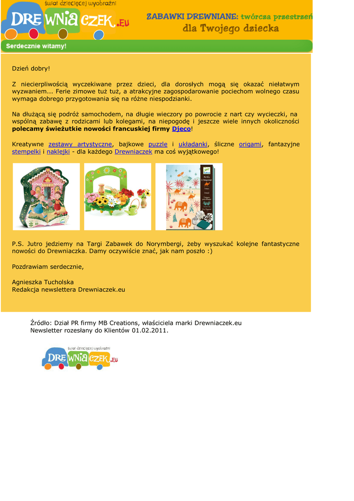 Dzień dobry! Z niecierpliwością wyczekiwane przez dzieci, dla dorosłych mogą się okazać niełatwym wyzwaniem... Ferie zimowe tuż tuż, a atrakcyjne zagospodarowanie pociechom wolnego czasu wymaga dobrego przygotowania się na różne niespodzianki. Na dłużącą się podróż samochodem, na długie wieczory po powrocie z nart czy wycieczki, na wspólną zabawę z rodzicami lub kolegami, na niepogodę i jeszcze wiele innych okoliczności polecamy świeżutkie nowości francuskiej firmy Djeco! Kreatywne zestawy artystyczne, bajkowe puzzle i układanki, śliczne origami, fantazyjne stempelki i naklejki - dla każdego Drewniaczek ma coś wyjątkowego! P.S. Jutro jedziemy na Targi Zabawek do Norymbergi, żeby wyszukać kolejne fantastyczne nowości do Drewniaczka. Damy oczywiście znać, jak nam poszło :) Pozdrawiam serdecznie, Agnieszka Tucholska Redakcja newslettera Drewniaczek.eu Źródło: Dział PR firmy MB Creations, właściciela marki Drewniaczek.eu Newsletter rozesłany do Klientów 01.02.2011.