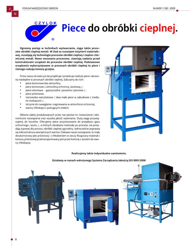 FORUM NARZĘDZIOWE OBERON F NUMER 1 (38) 2009 N Piece do obróbki cieplnej. Ogromny postęp w technikach wytwarzania, sięga także procesów obróbki cieplnej metali. W ślad za rozwojem inżynierii materiałowej, rozwijają się technologie procesów obróbki cieplnej i cieplno-chemicznej metali. Nowe wezwania procesowe, stawiają zadania przed konstruktorami urządzeń do procesów obróbki cieplnej. Podstawowe urządzenia wykorzystywane w procesach obróbki cieplnej to piece i różnego rodzaju komory grzejne. Firma nasza od wielu już lat projektuje i produkuje nieduże piece i akcesoria niezbędne w procesach obróbki cieplnej. Zaliczamy do nich: • piece komorowe bez atmosfery, • piece komorowe z atmosferą ochronną /azotową /, • piece retortowe - gazoszczelne /poziome i pionowe /, • piece próżniowe, • stanowiska warsztatowe / dwa małe piece w zabudowie z mediami studzącymi /, • skrzynie do nawęglania i nagrzewania w atmosferze ochronnej, • wanny chłodzące z pulsującymi stołami. Główne zalety produkowanych przez nas pieców to: nowoczesne i ekonomiczne rozwiązania oraz wysoka jakość wykonania. Dużą wagę przywiązujemy do kosztów. Oferujemy piece przystosowane do przepływu gazu ochronnego /azotu /, w których obrabiane materiały po procesie, nie posiadają typowej dla procesu obróbki cieplnej zgorzeliny. Jednocześnie poprawia się mikrostruktura zewnętrznych warstw. Ciekawe nasze rozwiązanie, to mały dwukomorowy piec próżniowy z chłodzeniem w cieczy. Rozgrzany materiał z komory próżniowej przetransportowany jest przez komorę z azotem do wanny chłodzącej. Realizujemy także indywidualne zamówienia. Działamy w ramach wdrożonego Systemu Zarządzania Jakością ISO 9001:2008 8